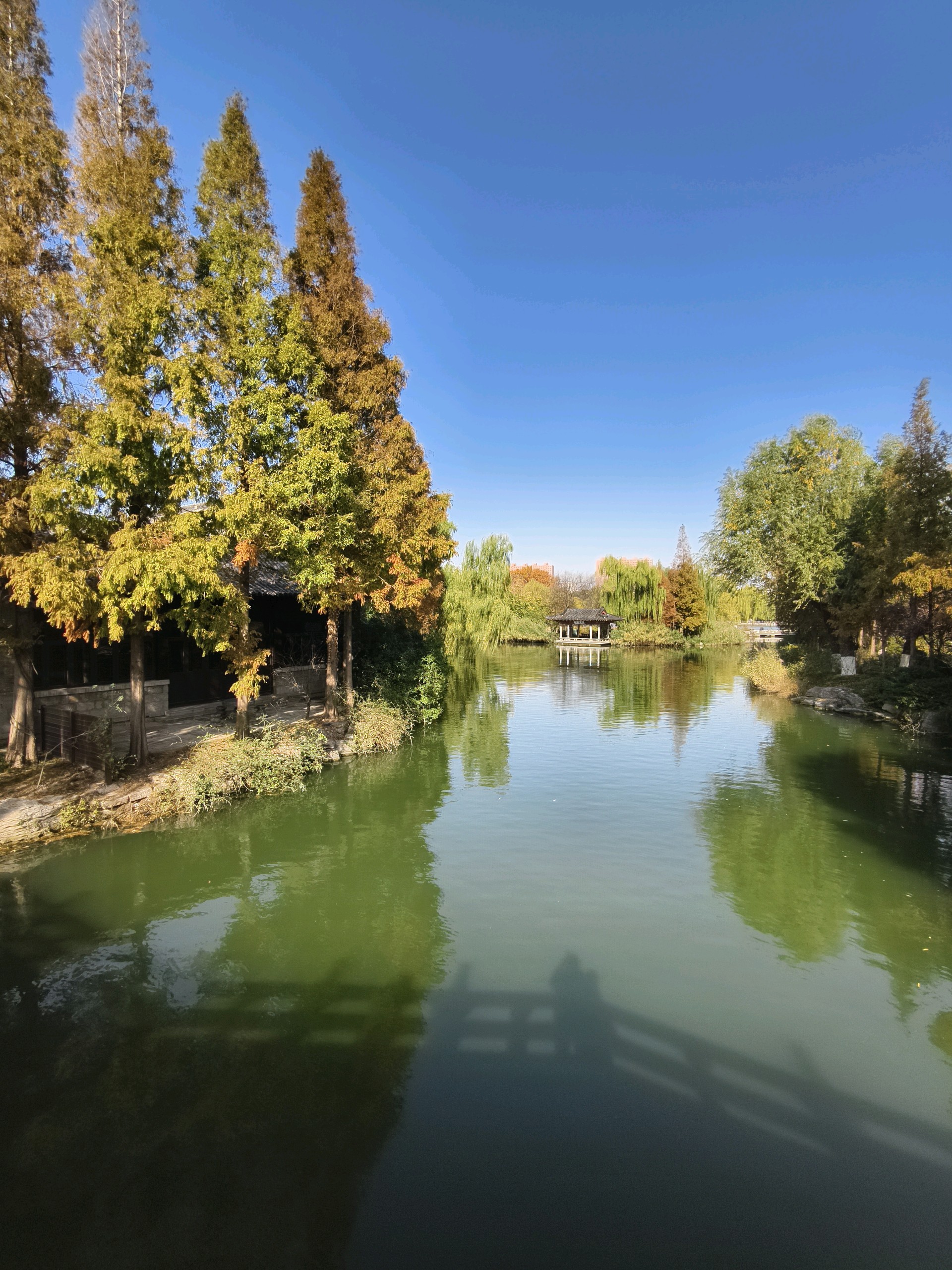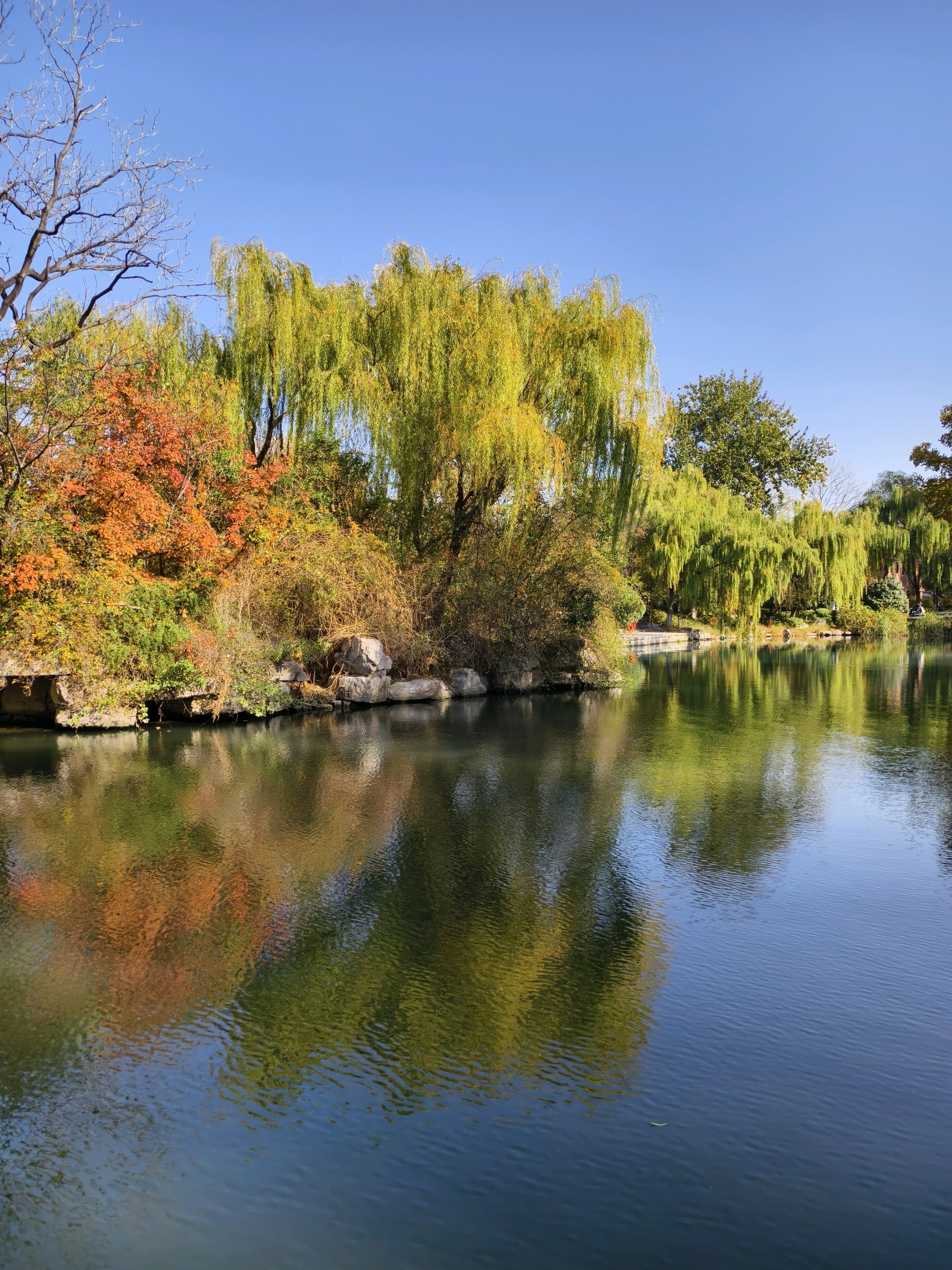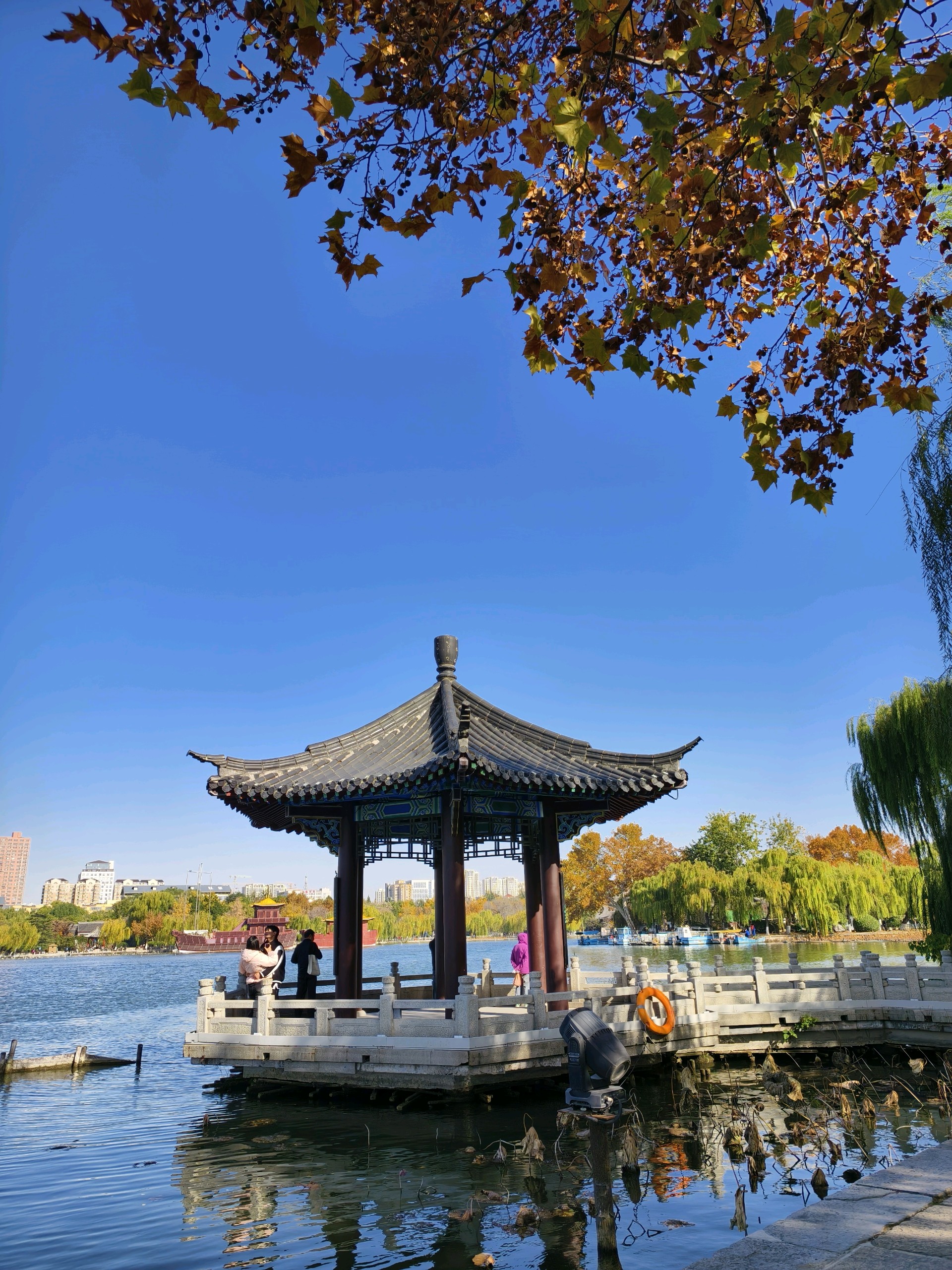大明湖畔的冬日美景,天蓝水碧,树上的叶子呈现出色彩斑斓的景象,似一幅优美的画卷令人陶醉!