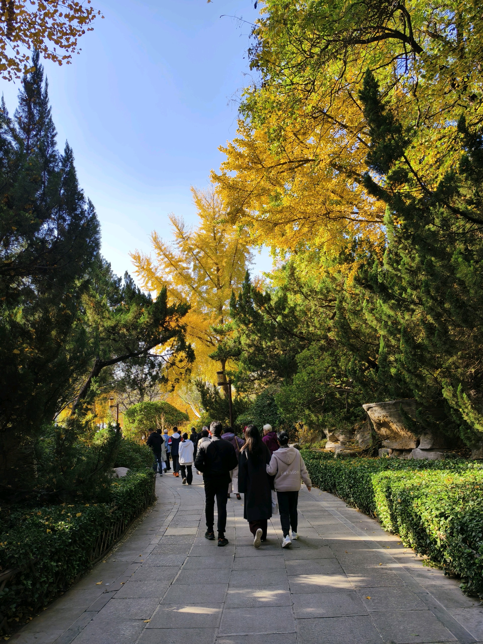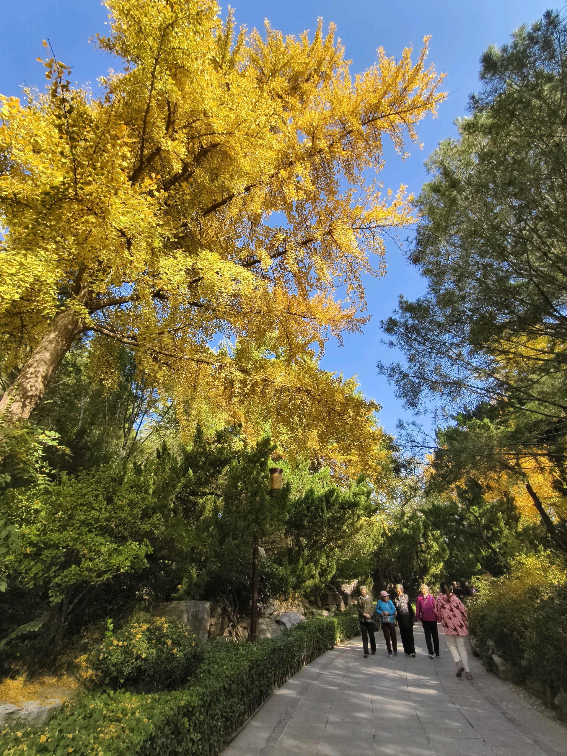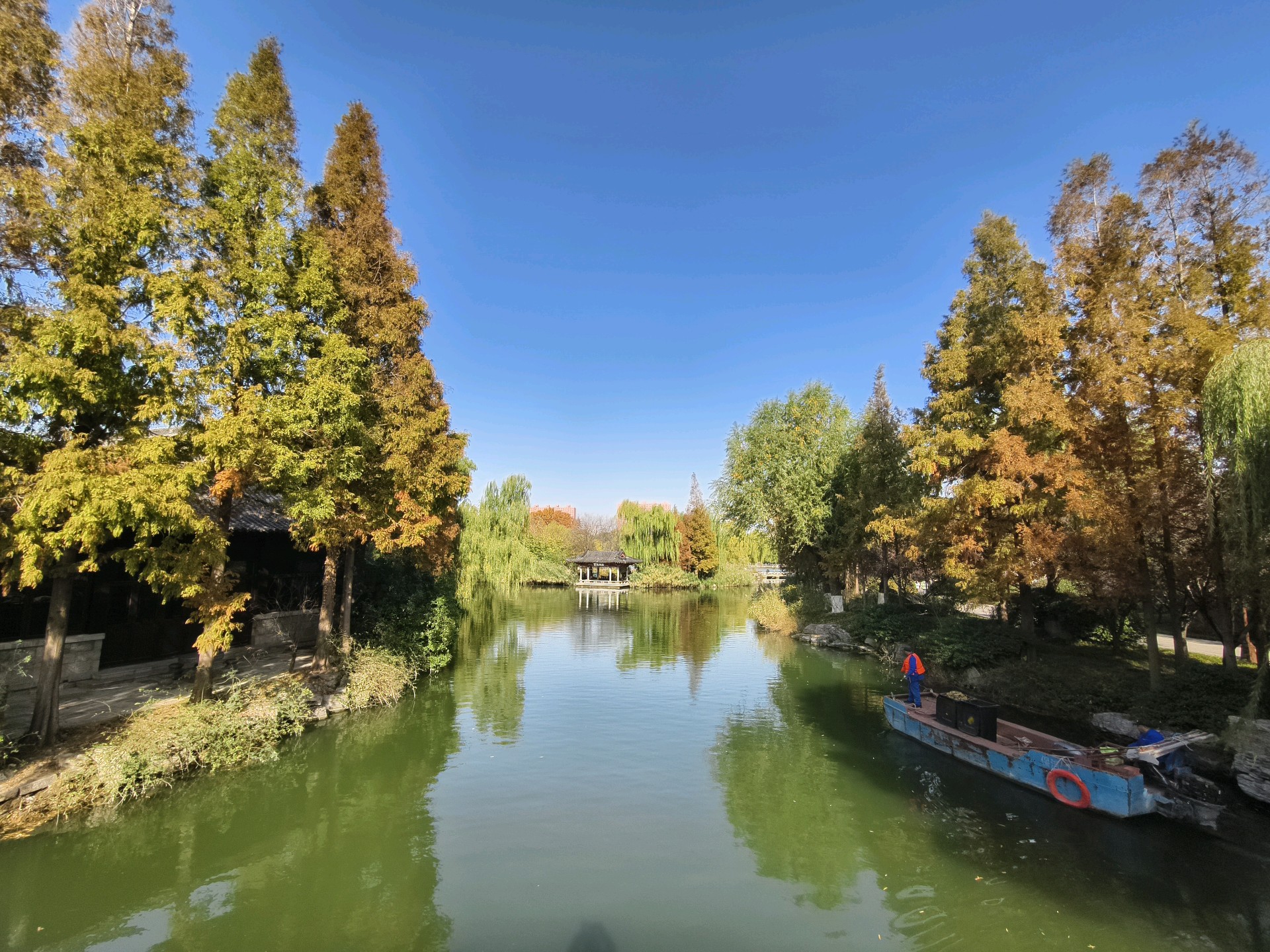 大明湖畔的冬日美景,天蓝水碧,树上的叶子呈现出色彩斑斓的景象,似一幅优美的画卷令人陶醉!