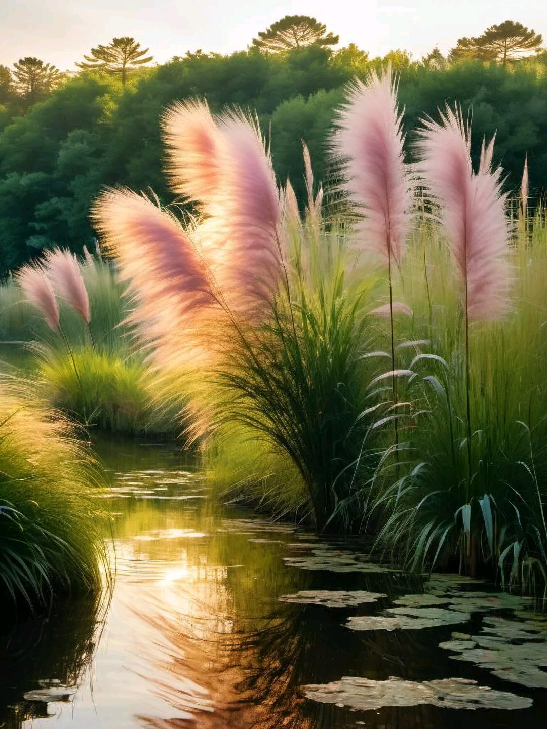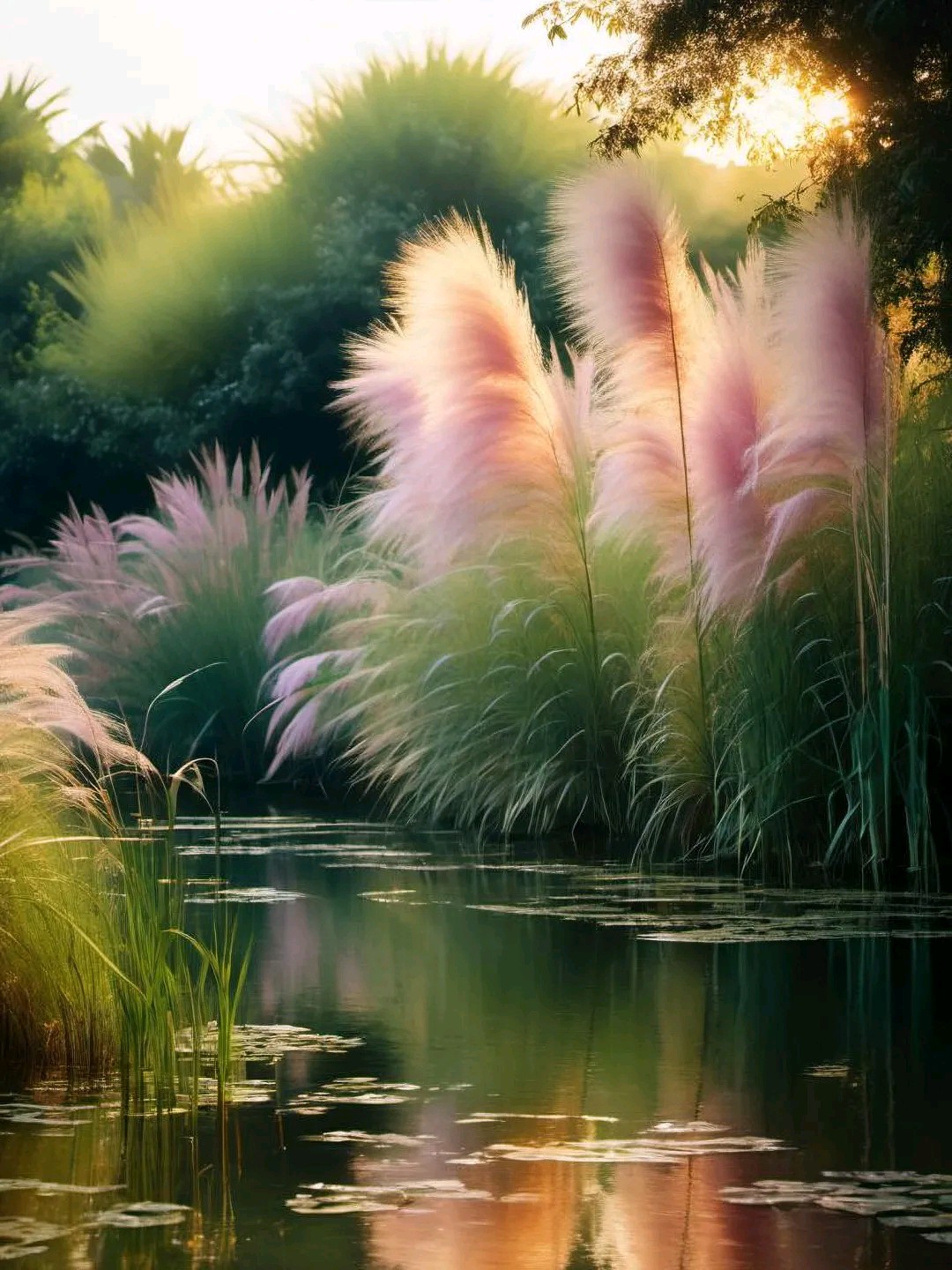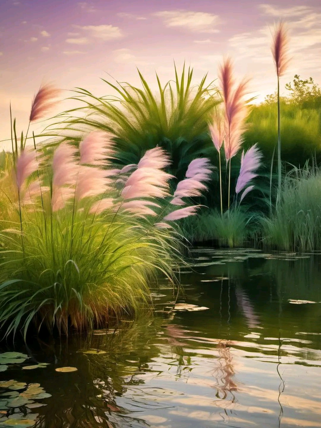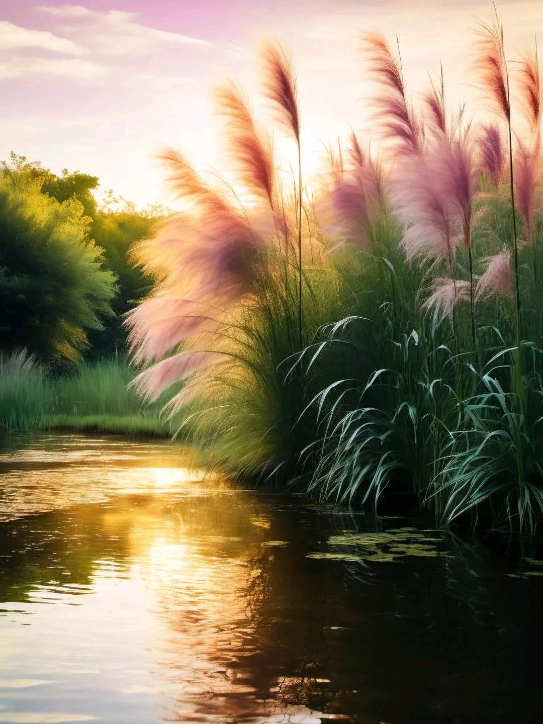 夕阳渐渐西沉,天空染上了一抹绚丽的晚霞。粉紫色的芦苇在这霞光中越发显得梦幻而迷离