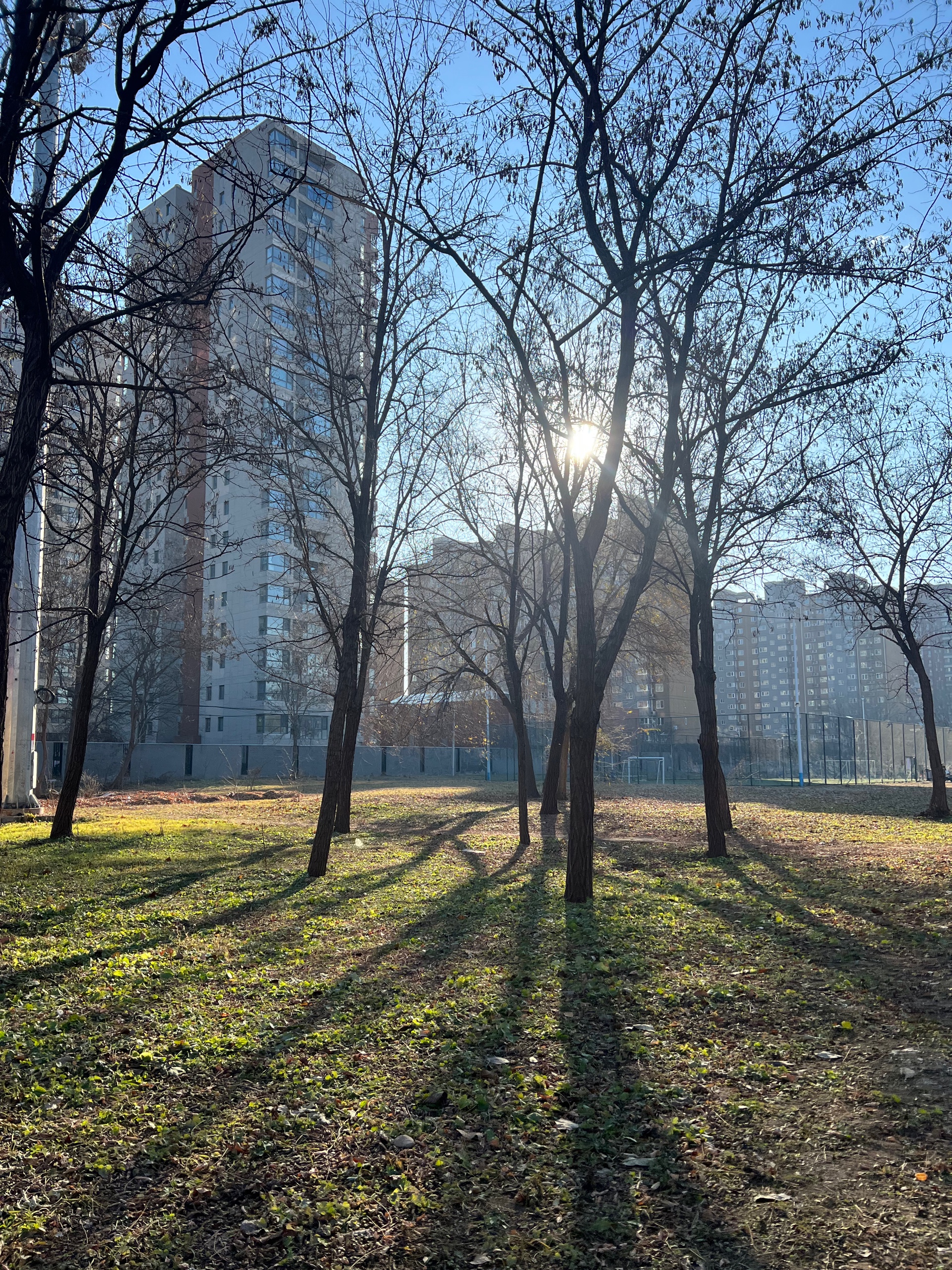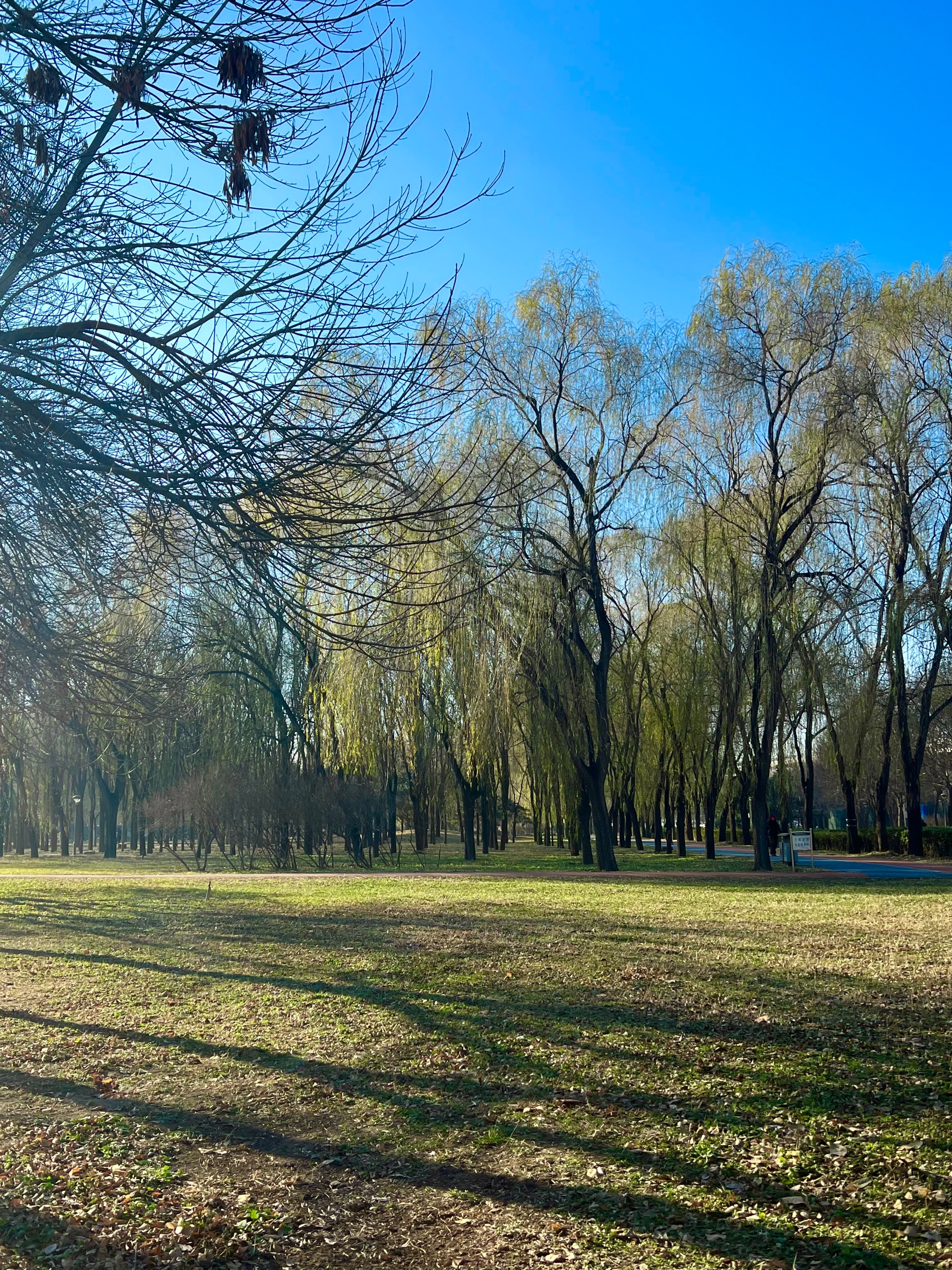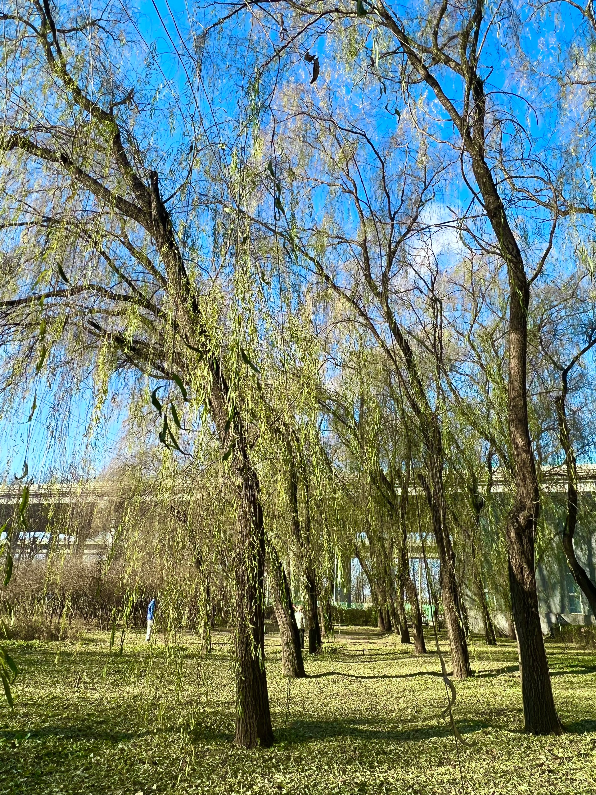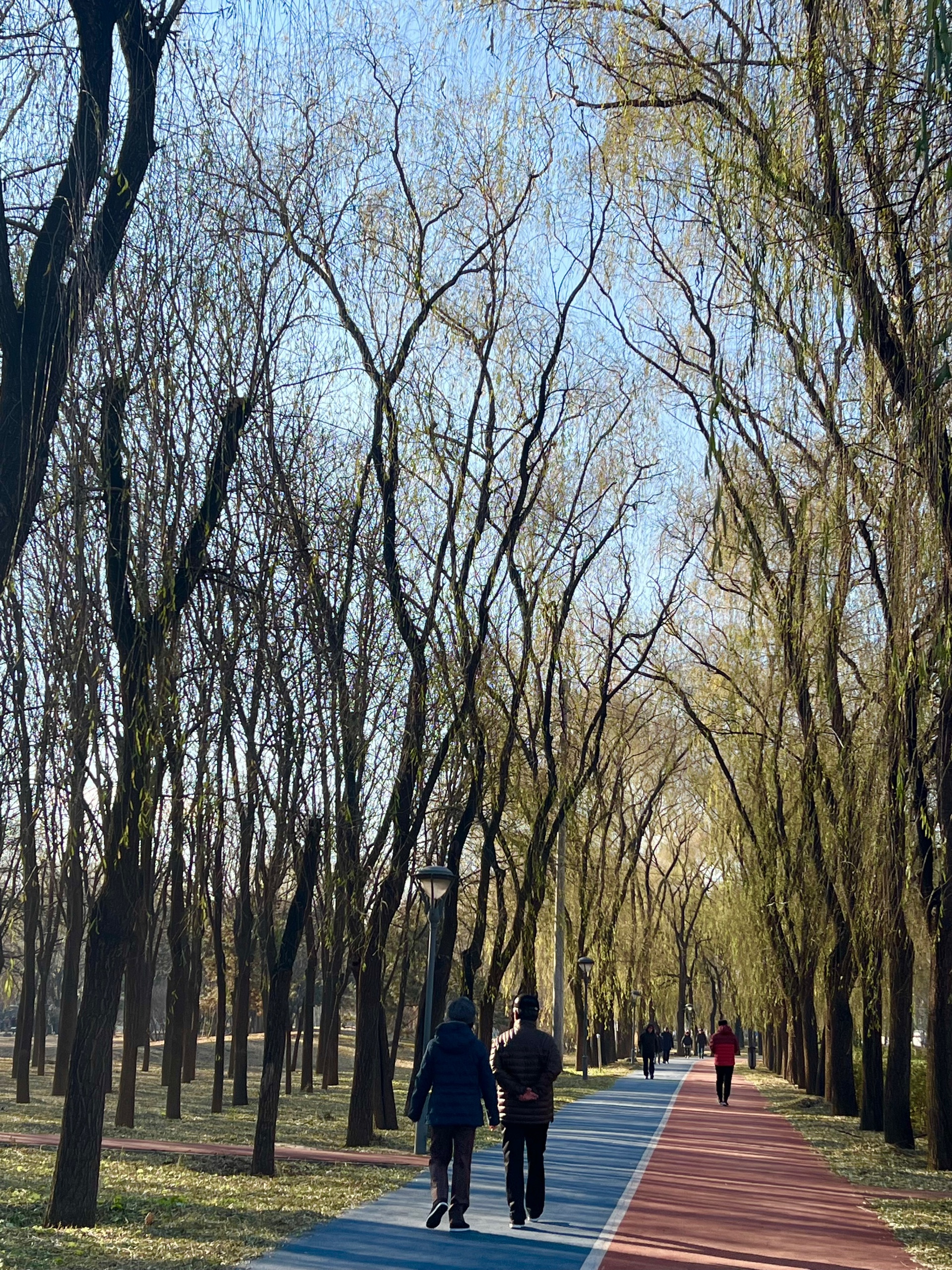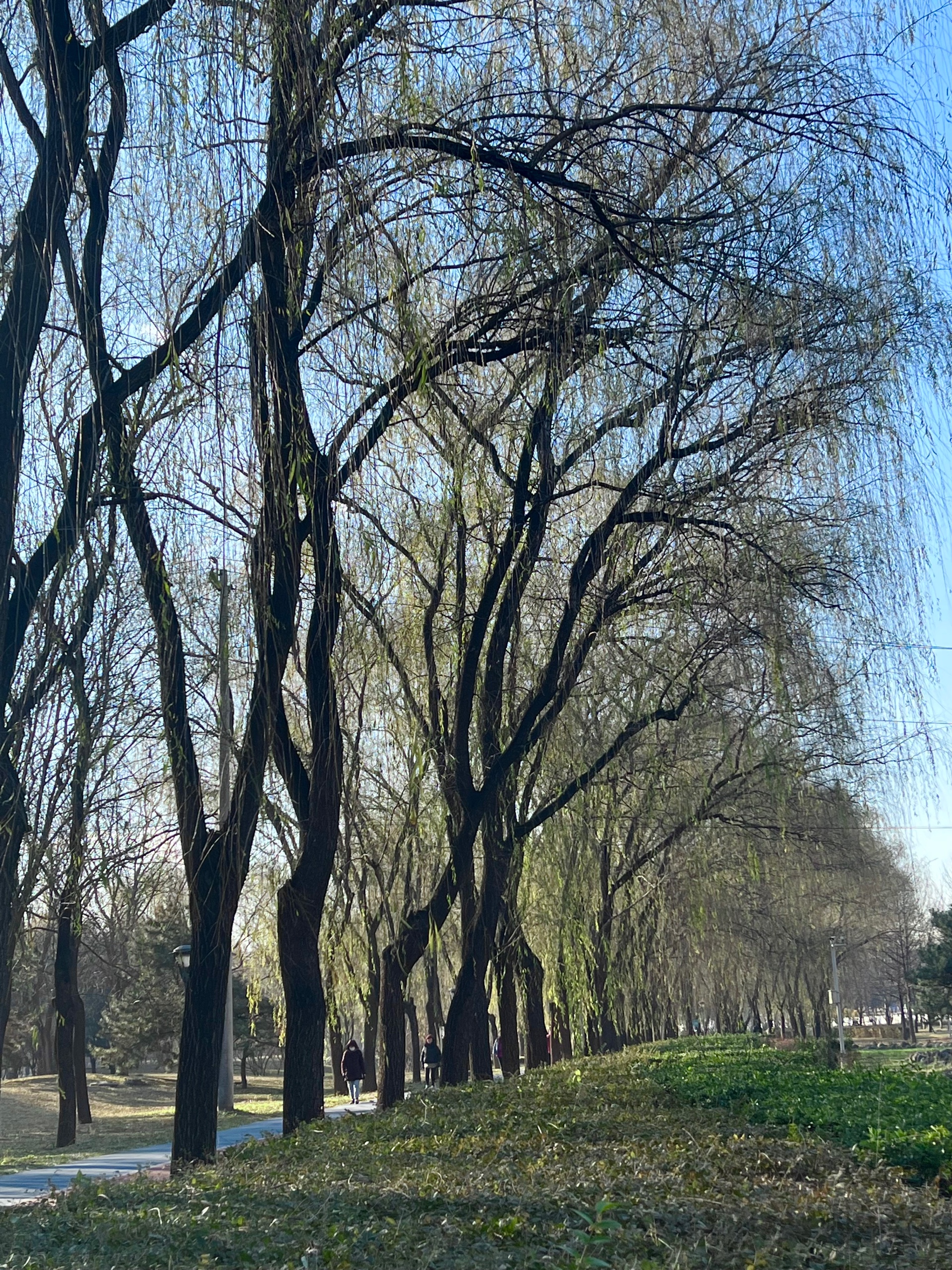 冬天公园里柳树还是那绿,它是春天最早发芽的,又是冬天最晚落叶的,跟四季常青差不多的绿…