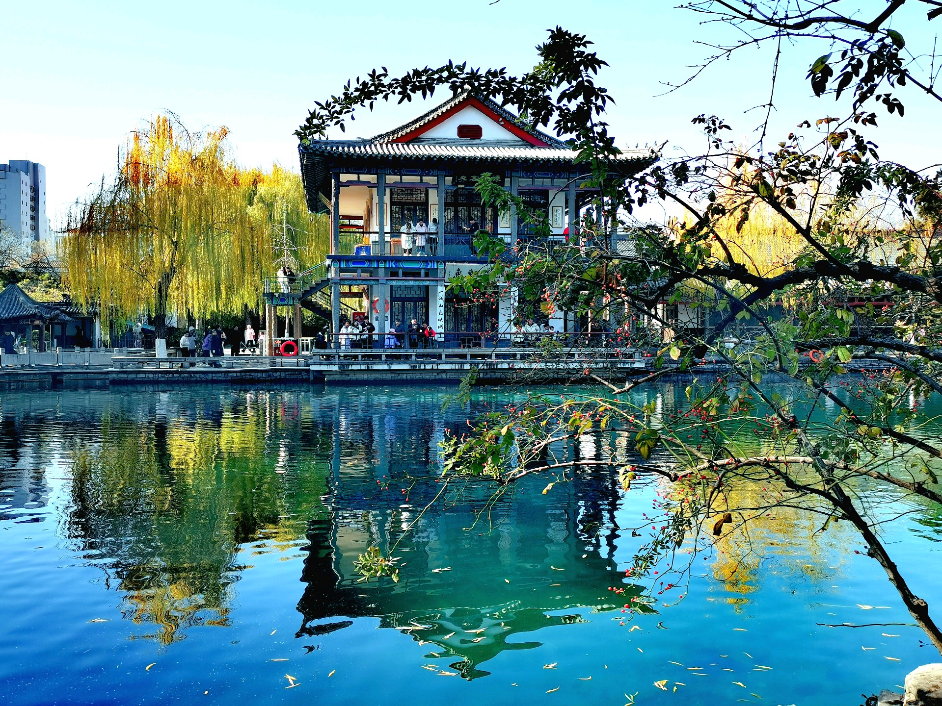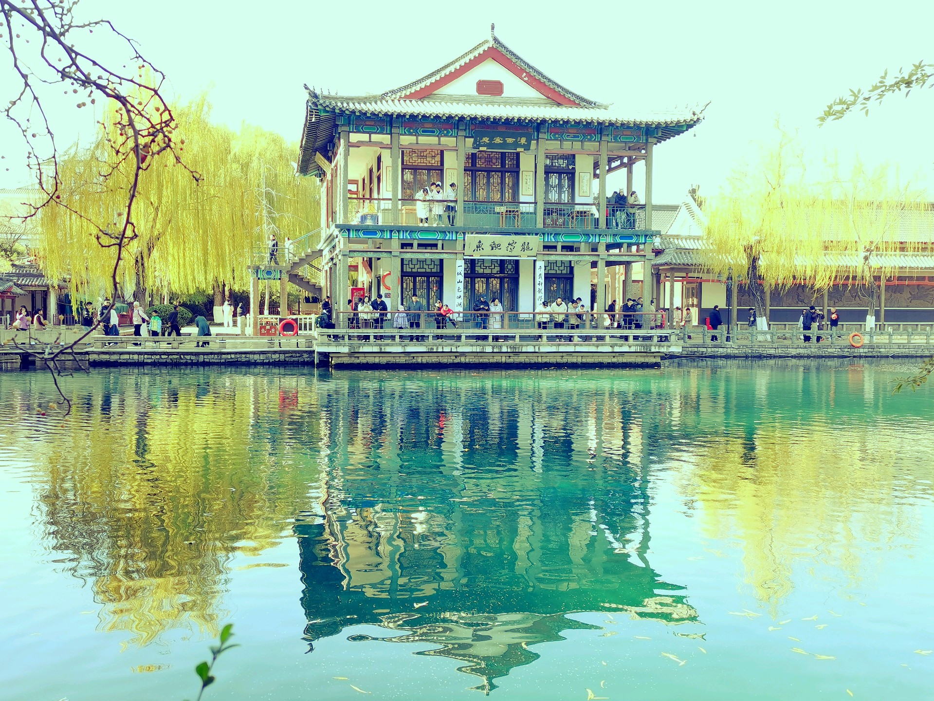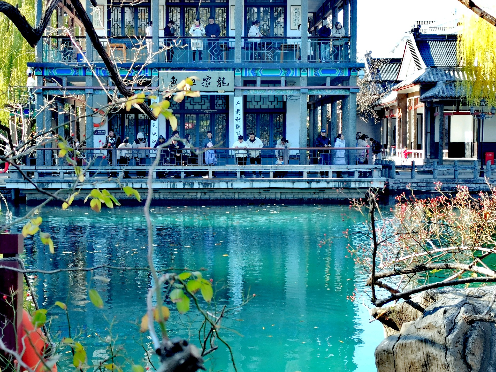柳枝摇曳,古屋静立。美在五龙潭,天下第一泉。