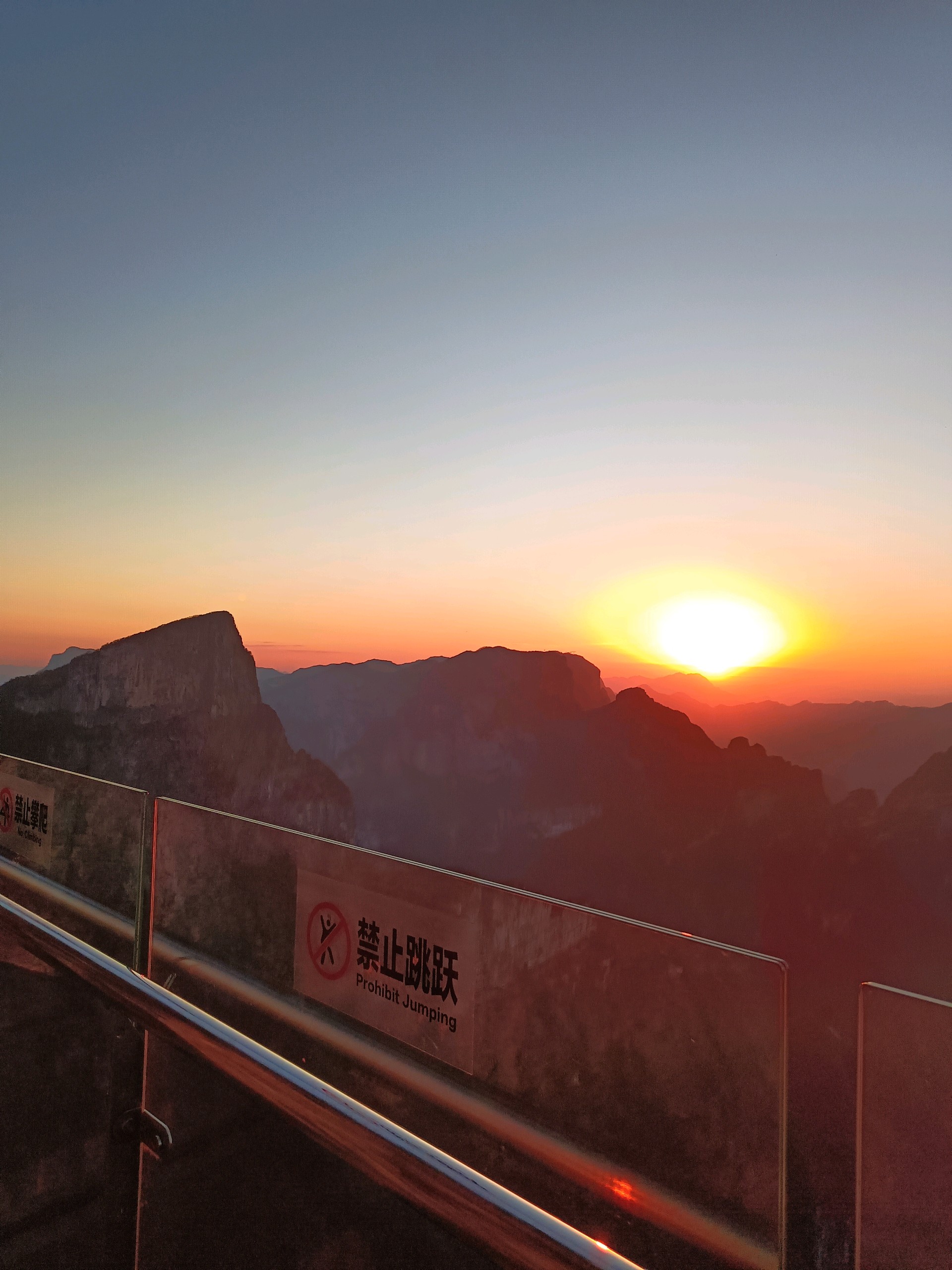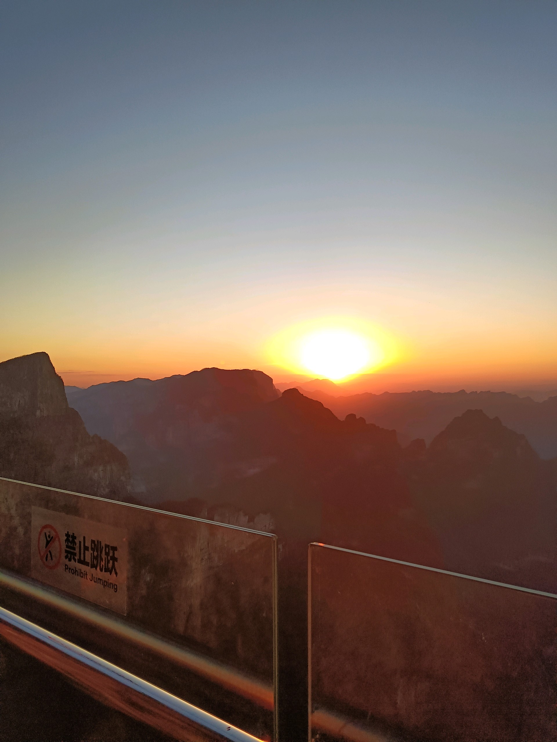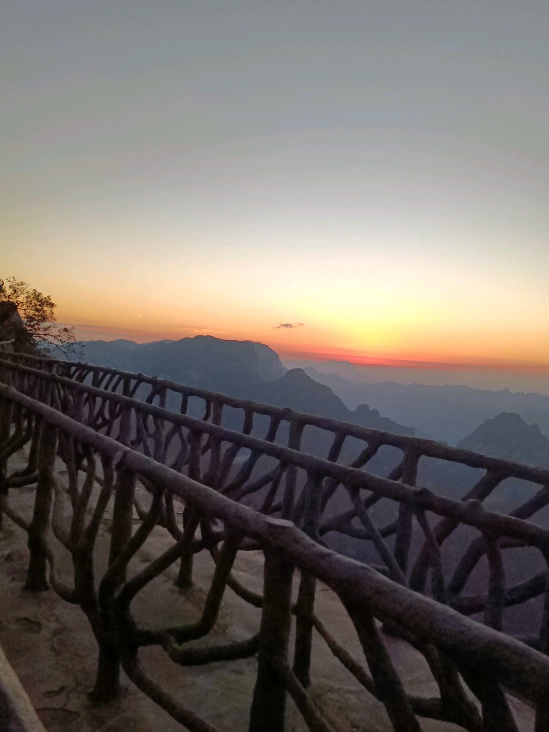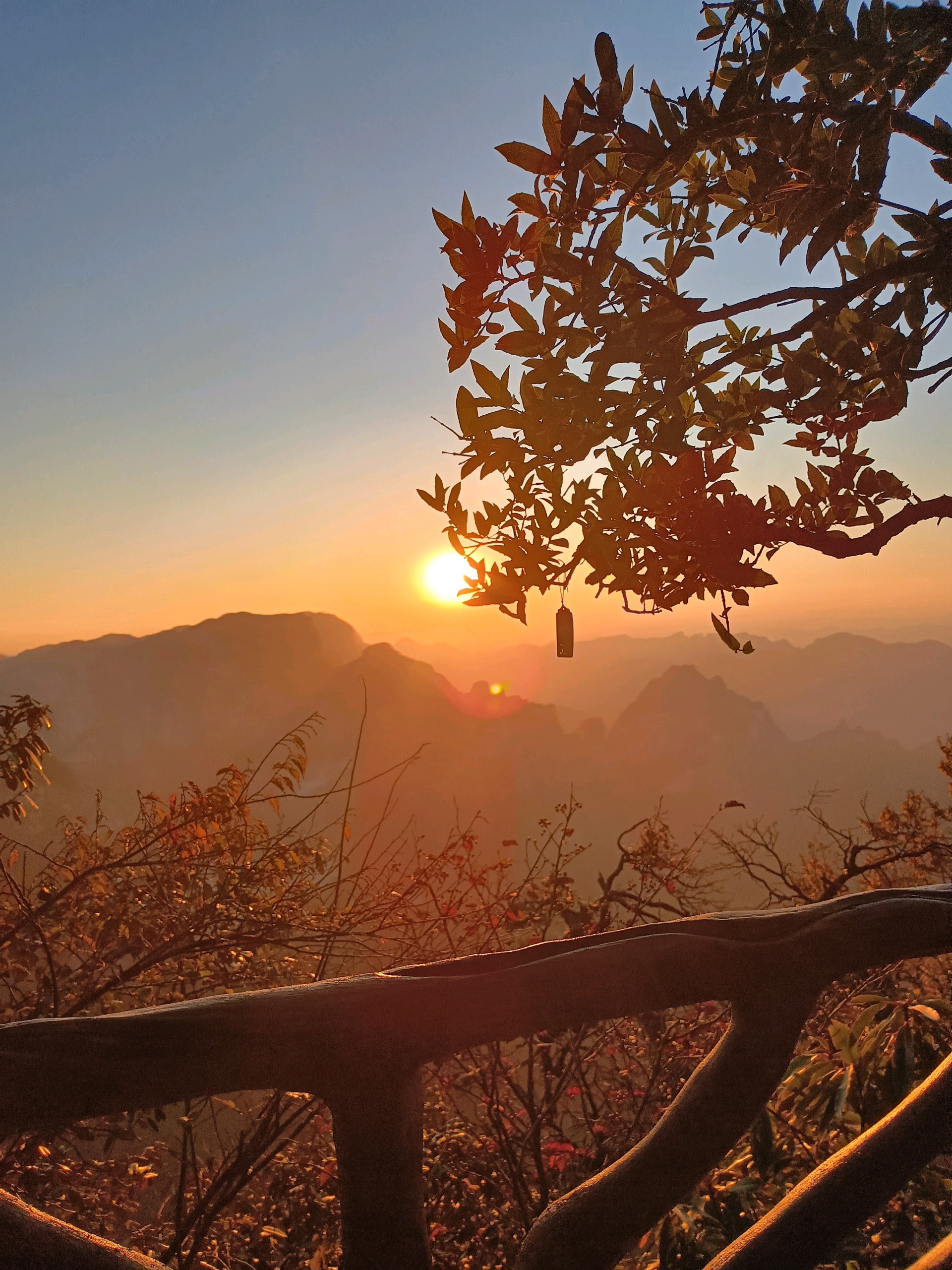 站在山顶,看向远方,金色的太阳正缓缓落下山去,一点一点,直到最后形成一道金边,太美了。