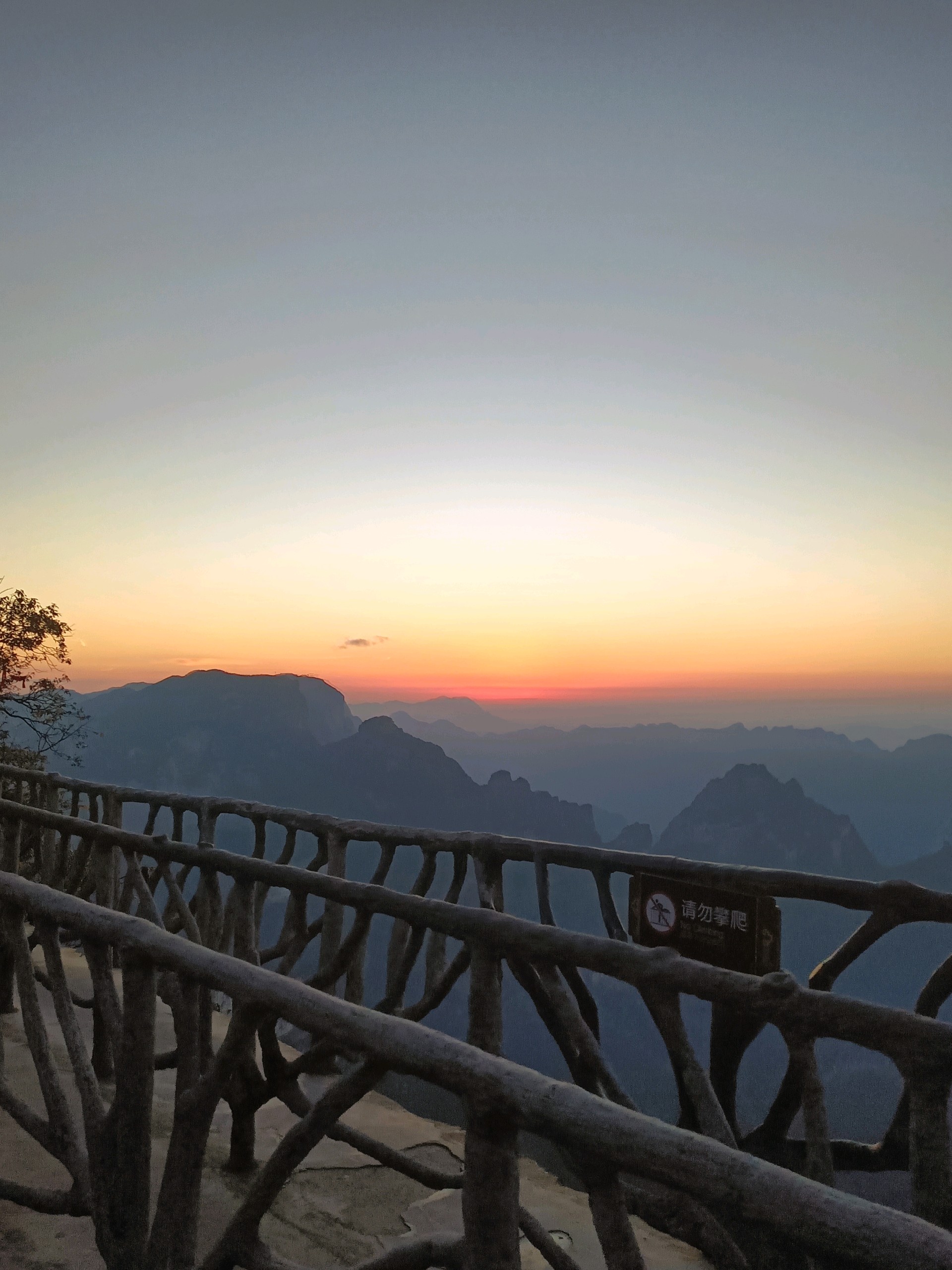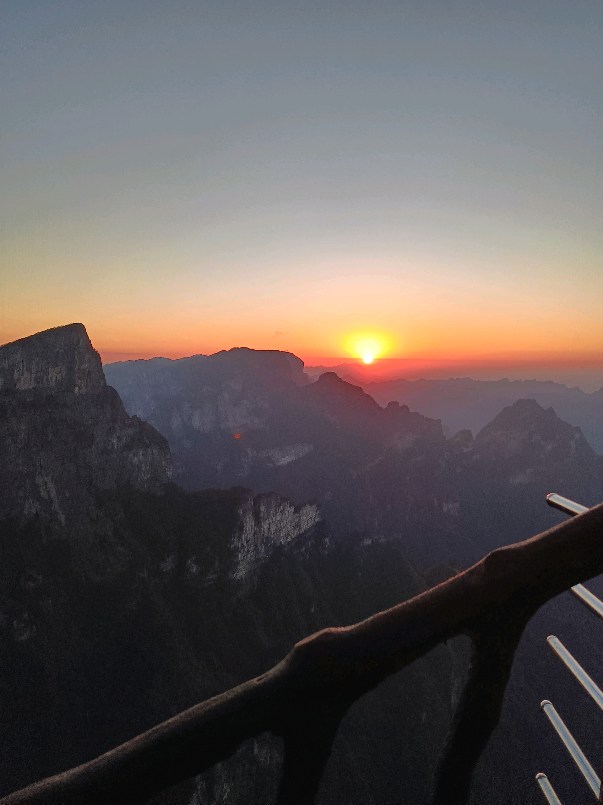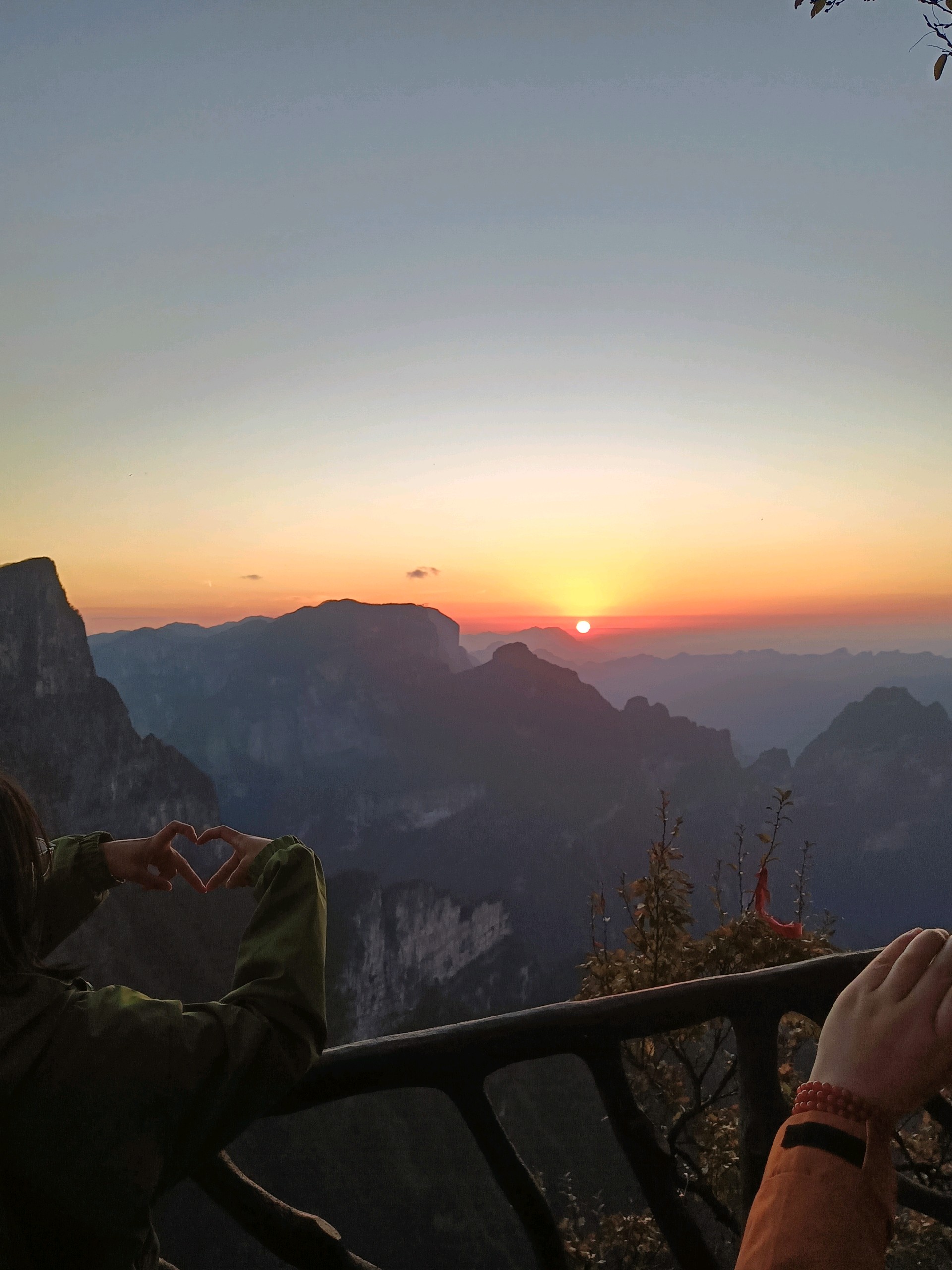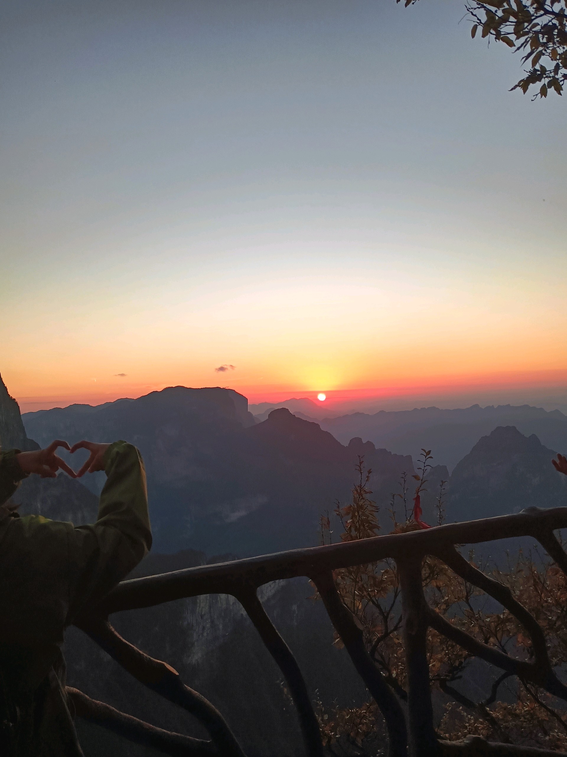 站在山顶,看向远方,金色的太阳正缓缓落下山去,一点一点,直到最后形成一道金边,太美了。