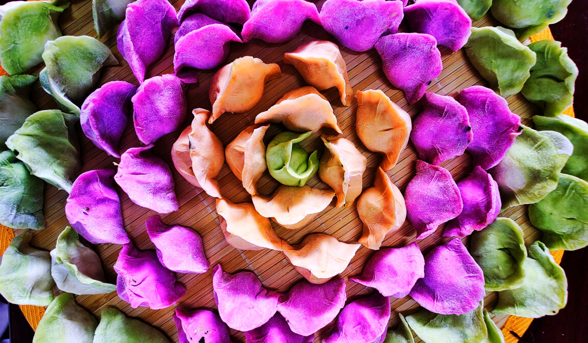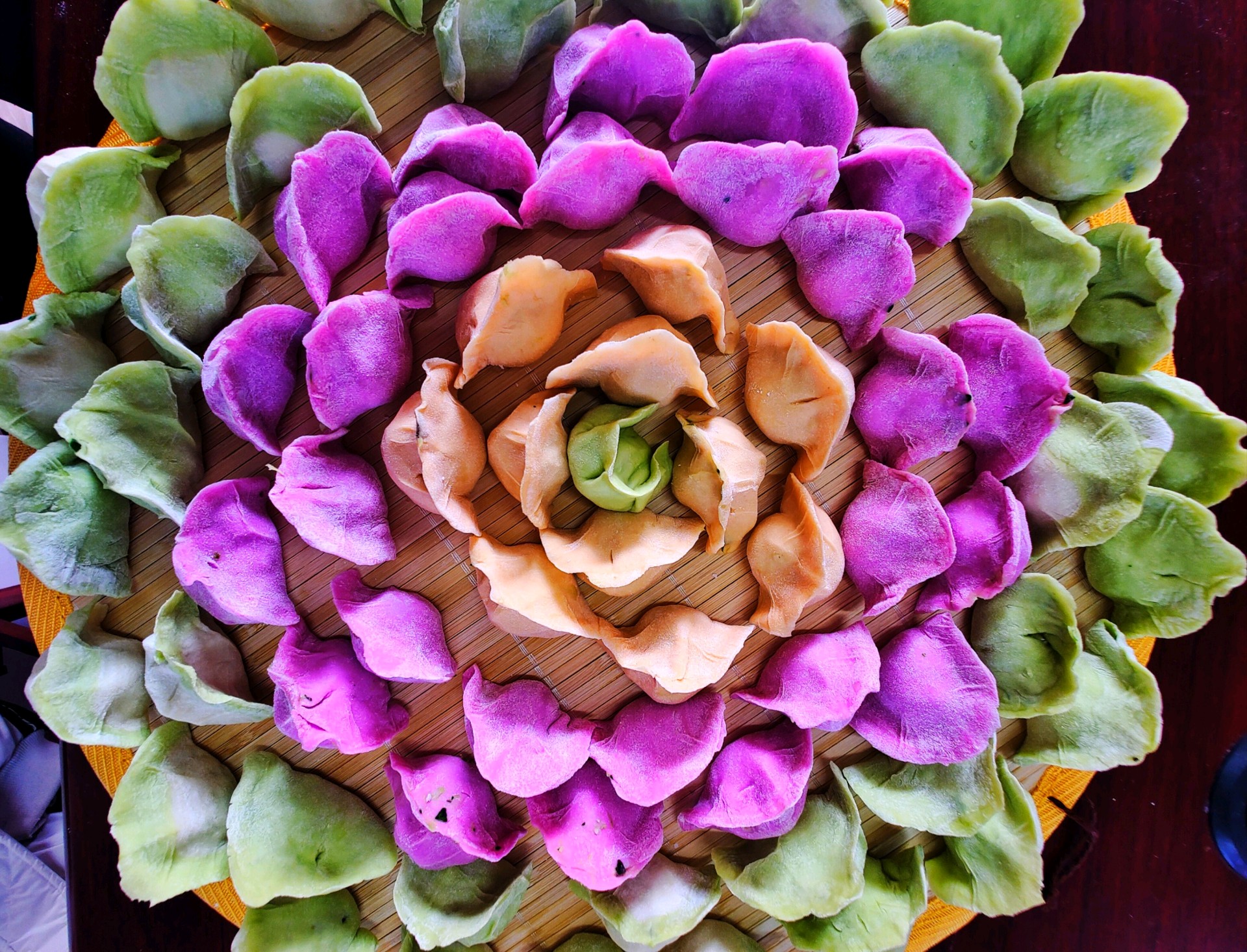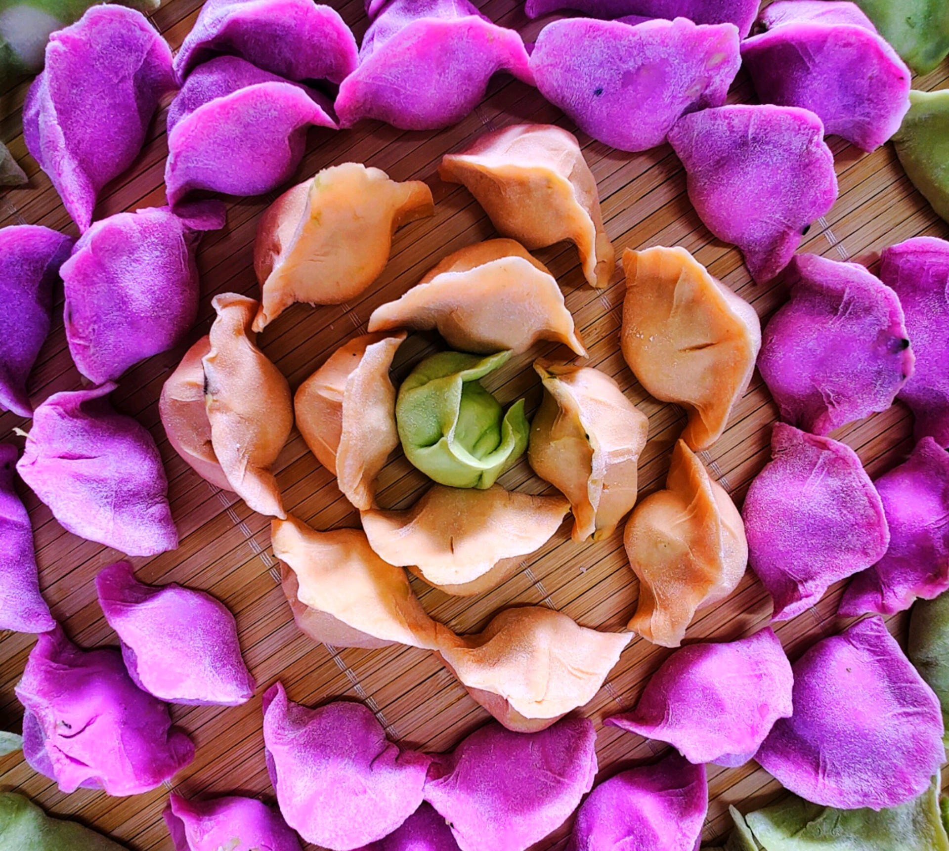 五彩饺子迎冬至“冬至不端饺子碗,冻掉耳朵没人管”。这是古人把最冷的冬至季节经过实践总结出来经验。瞧,这包好的五彩饺子,摆放成了一幅五彩图画,犹如一个争奇斗艳五彩缤纷的的花朵。饺子形如元宝,冬至吃饺子寓意美好吉祥,幸福美满。(高军摄影)