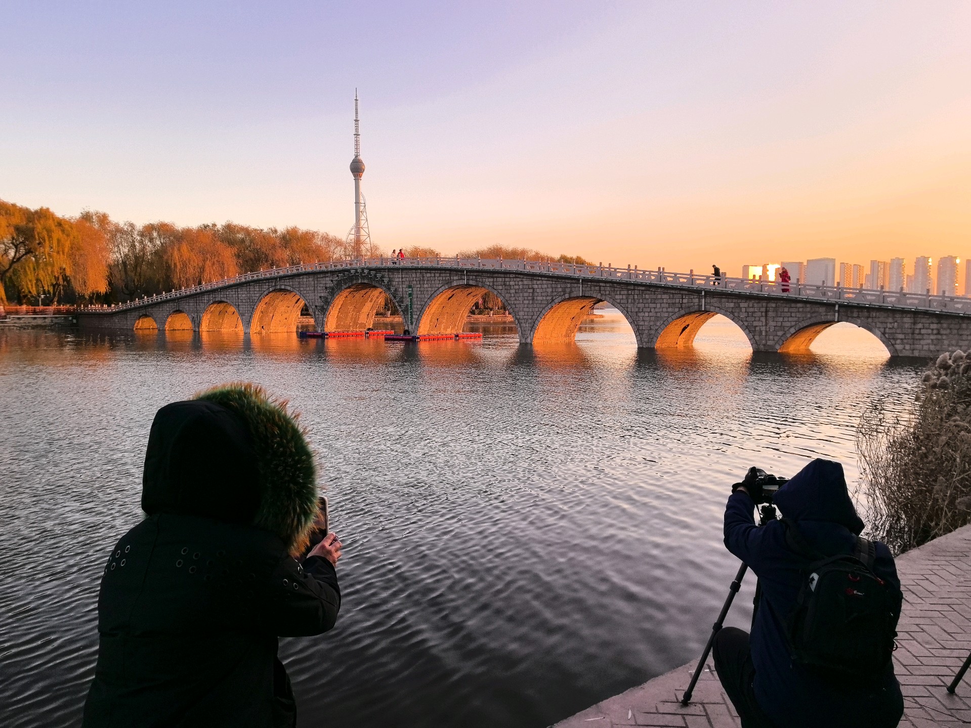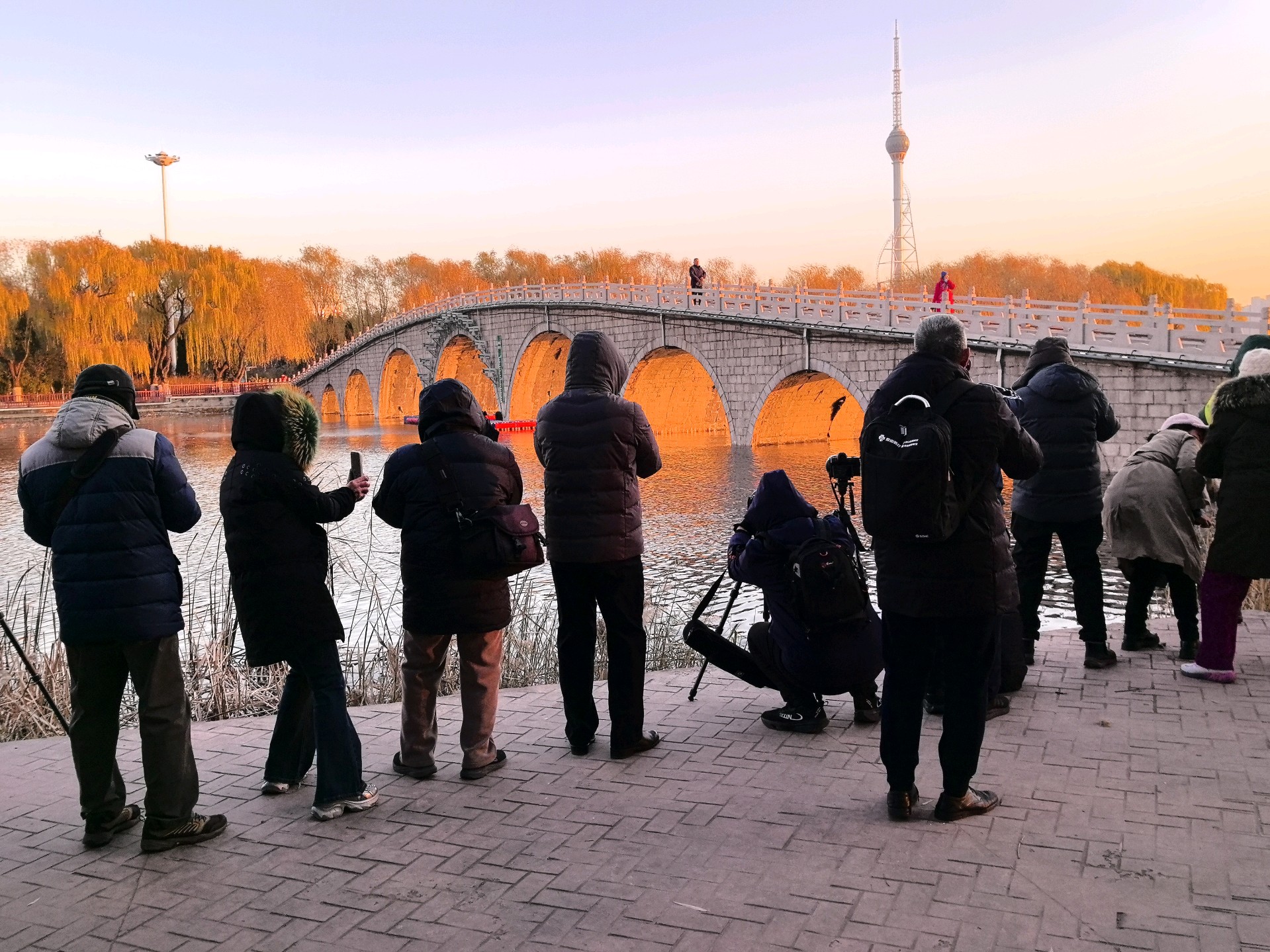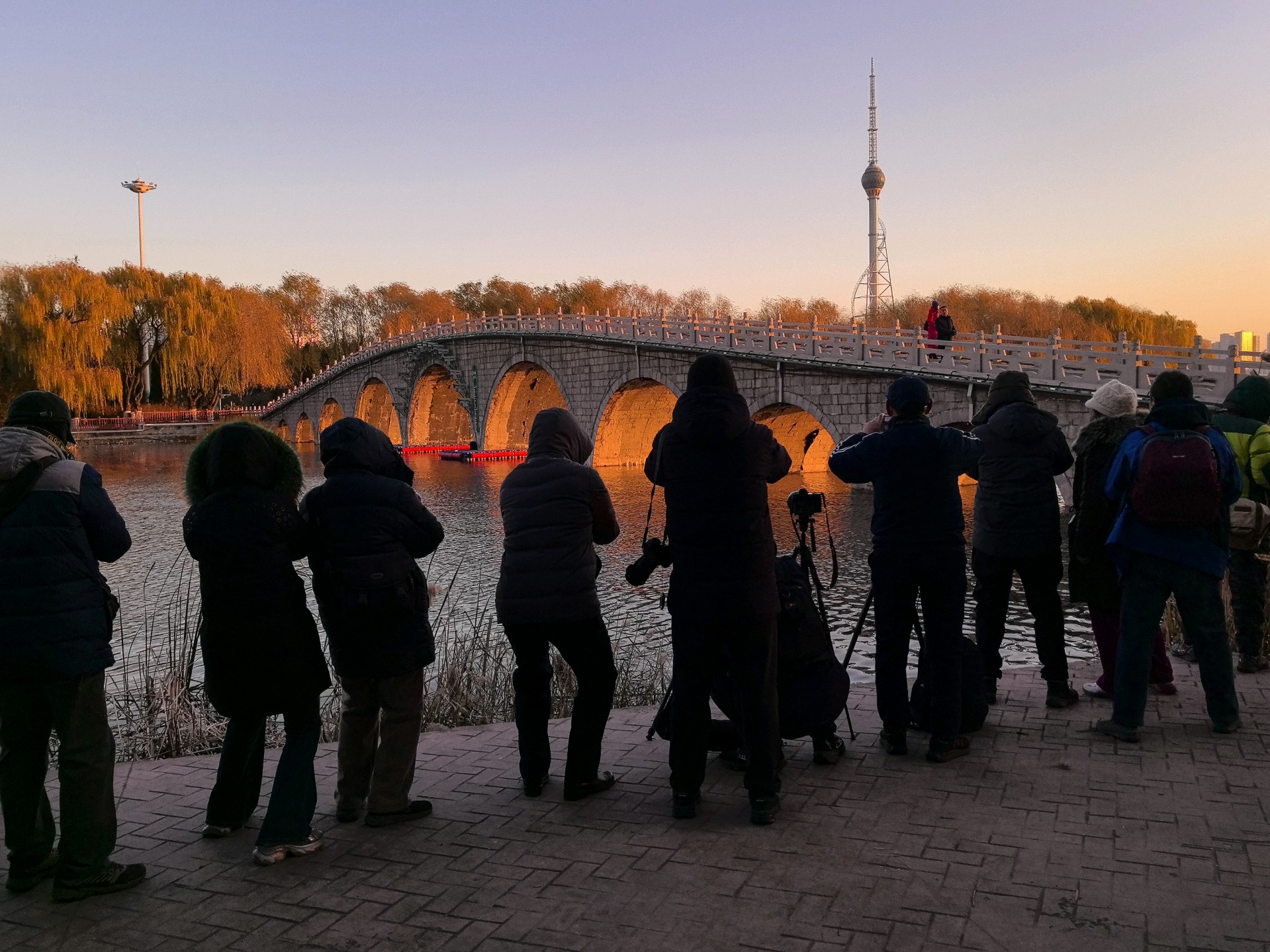 今天冬至,太阳已达南回归线,太阳与地面的夹角也是最小,清晨太阳光照射到九孔桥北边的洞壁上,金光灿灿,吸引了众多摄影爱好者及市民们的留驻与拍照,形成一条独特的风景线。