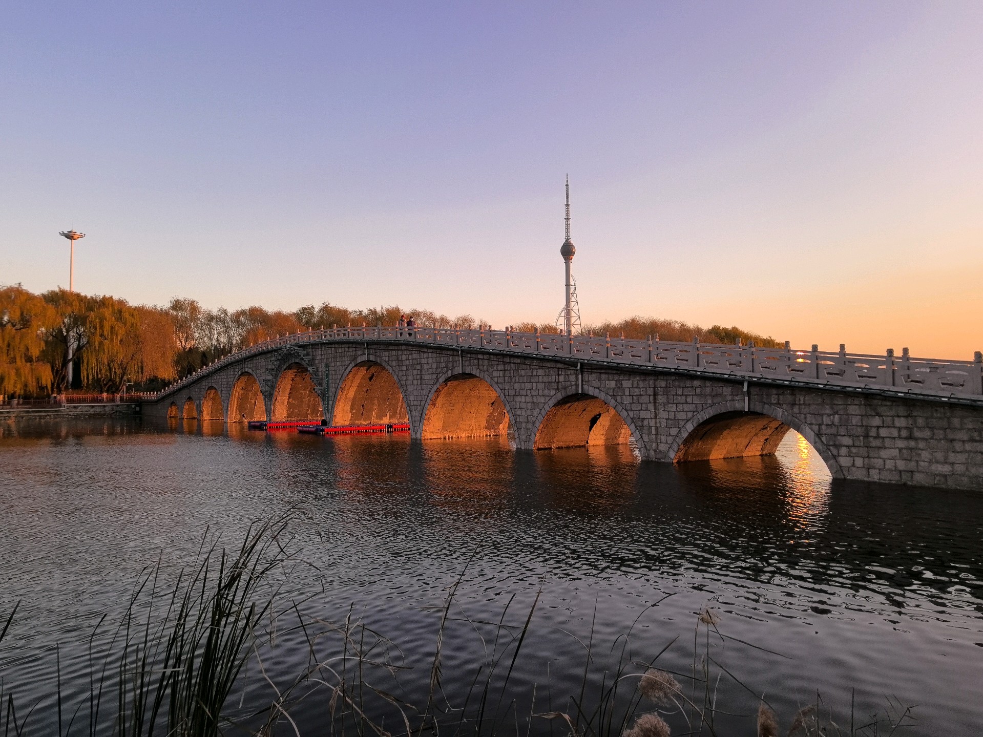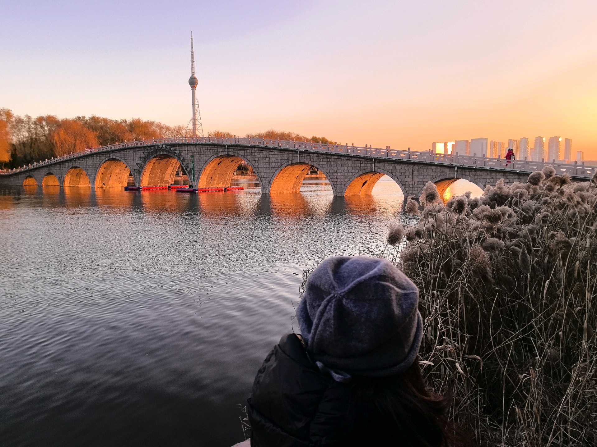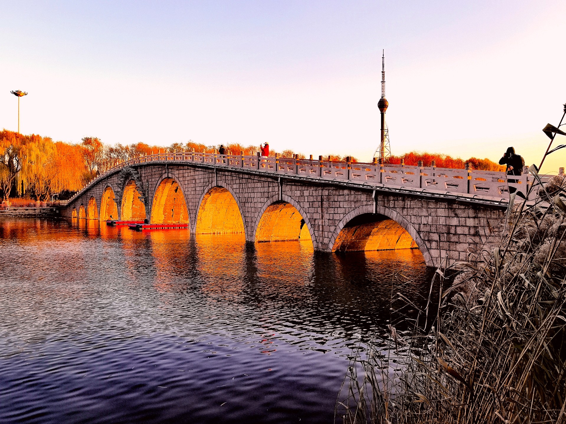 今天冬至,太阳已达南回归线,太阳与地面的夹角也是最小,清晨太阳光照射到九孔桥北边的洞壁上,金光灿灿,吸引了众多摄影爱好者及市民们的留驻与拍照,形成一条独特的风景线。