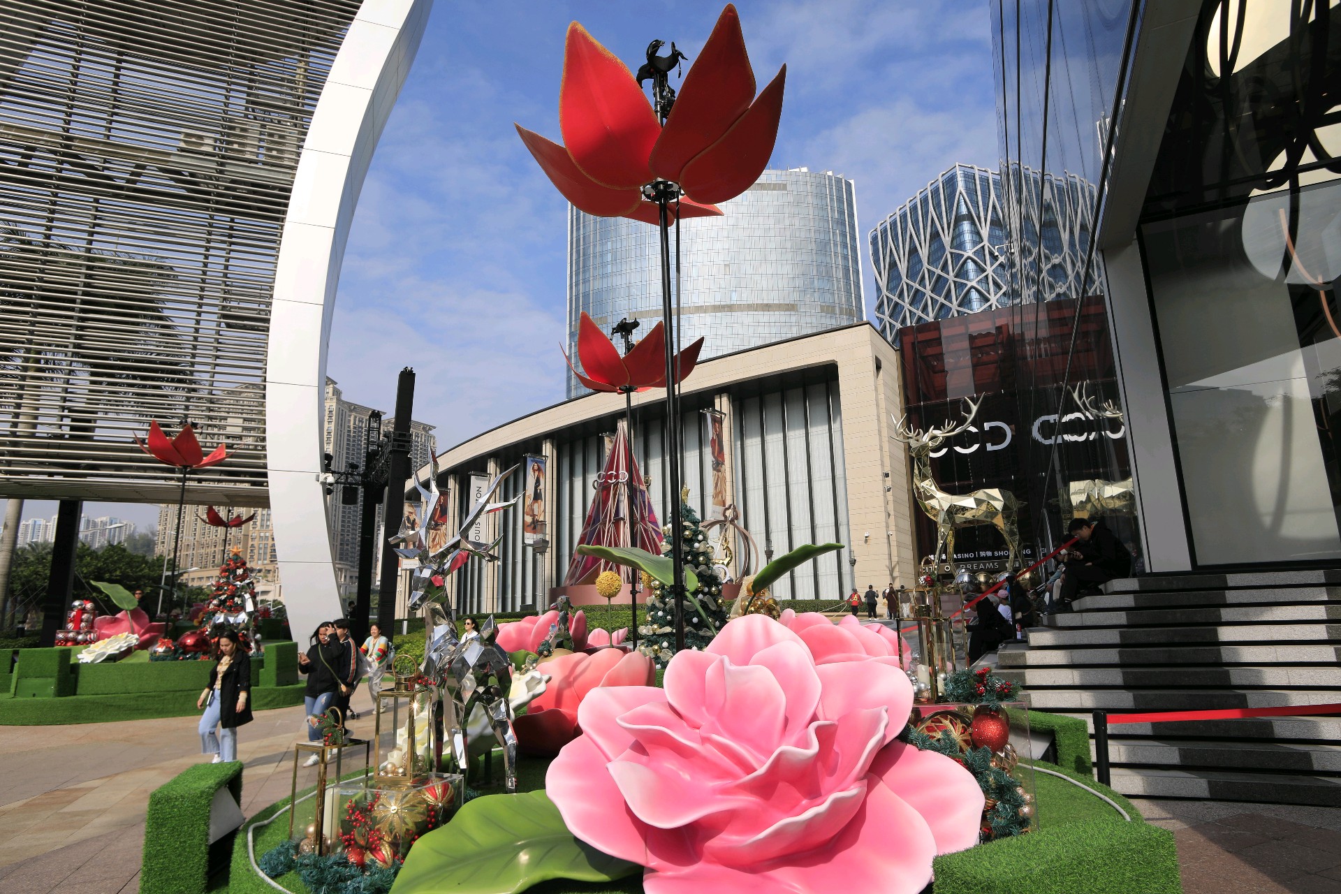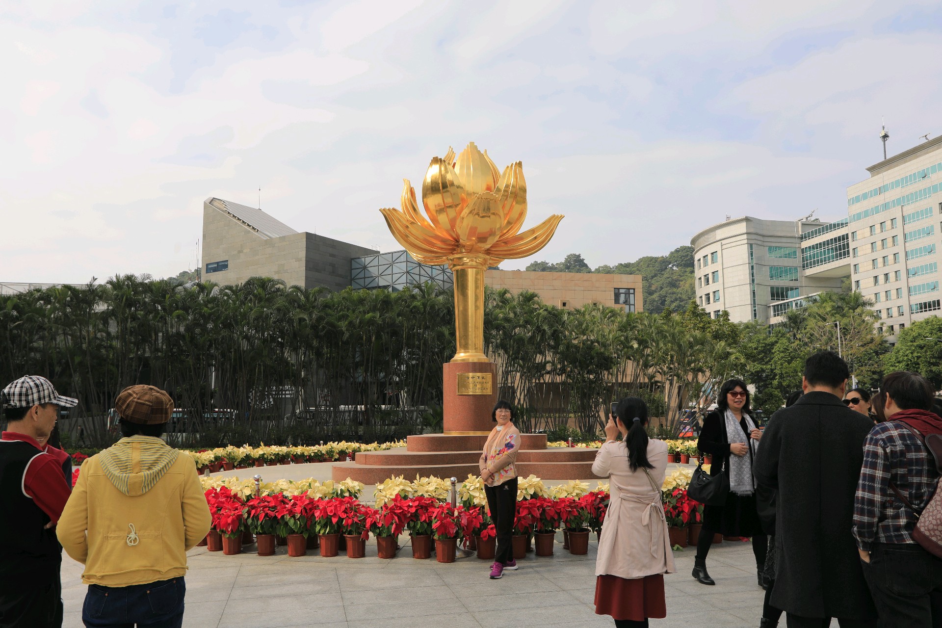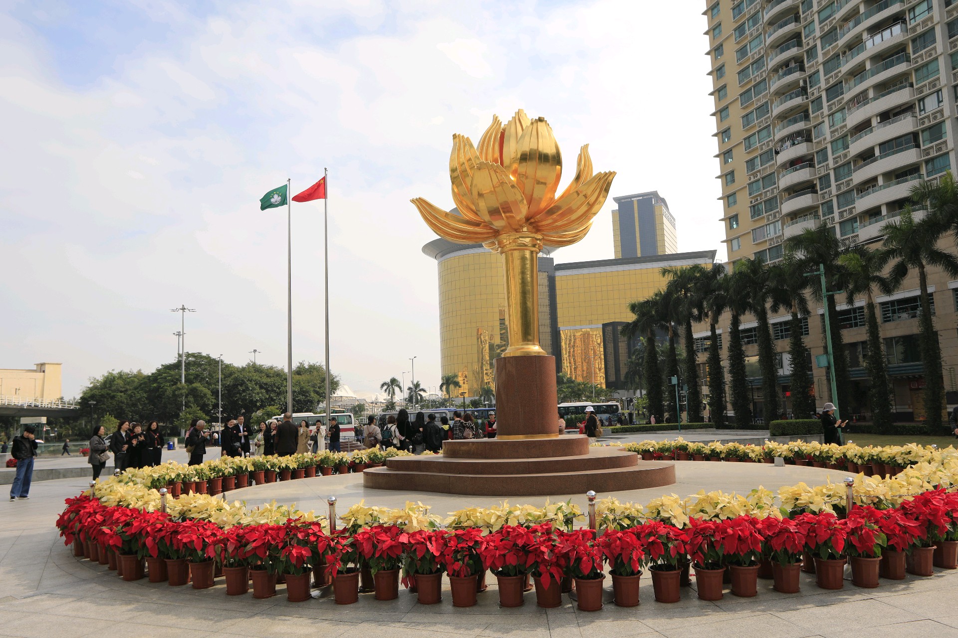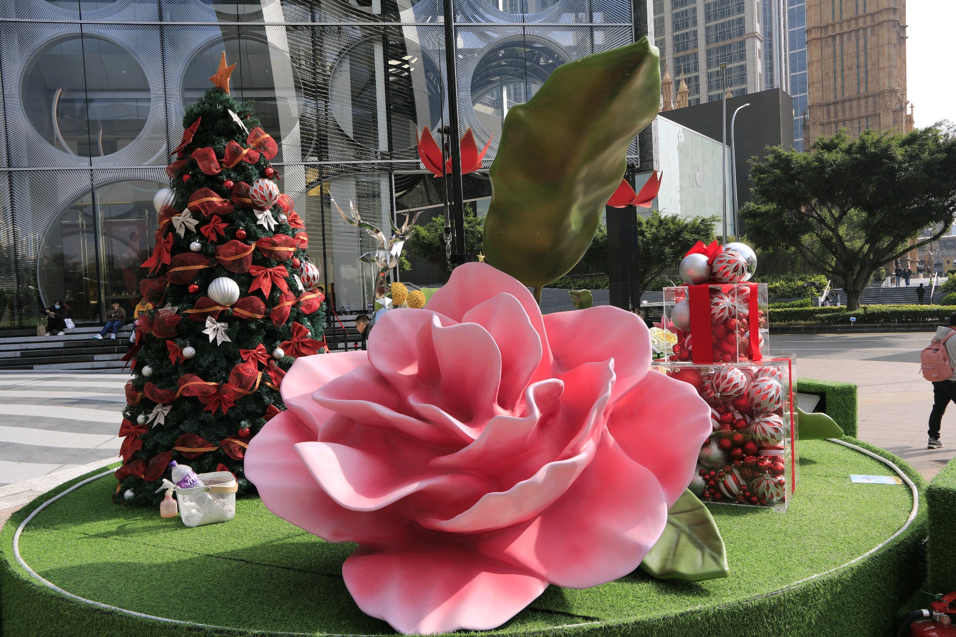 2024年12月24日,游客在澳门金莲花广场拍照打卡。澳门鲜花盛开、张灯结彩、喜气洋洋,全城沉浸在节日里,幸福和喜悦写在人们脸上,更洋溢在每个人心间。王东元 摄影