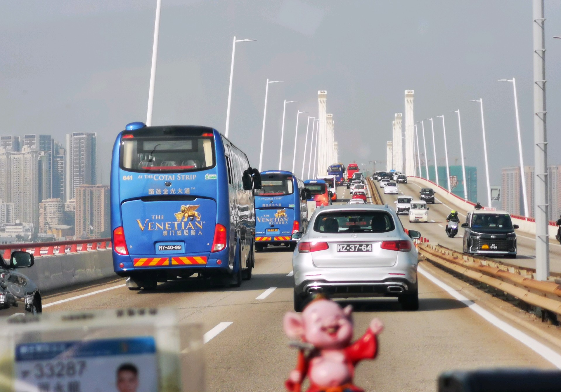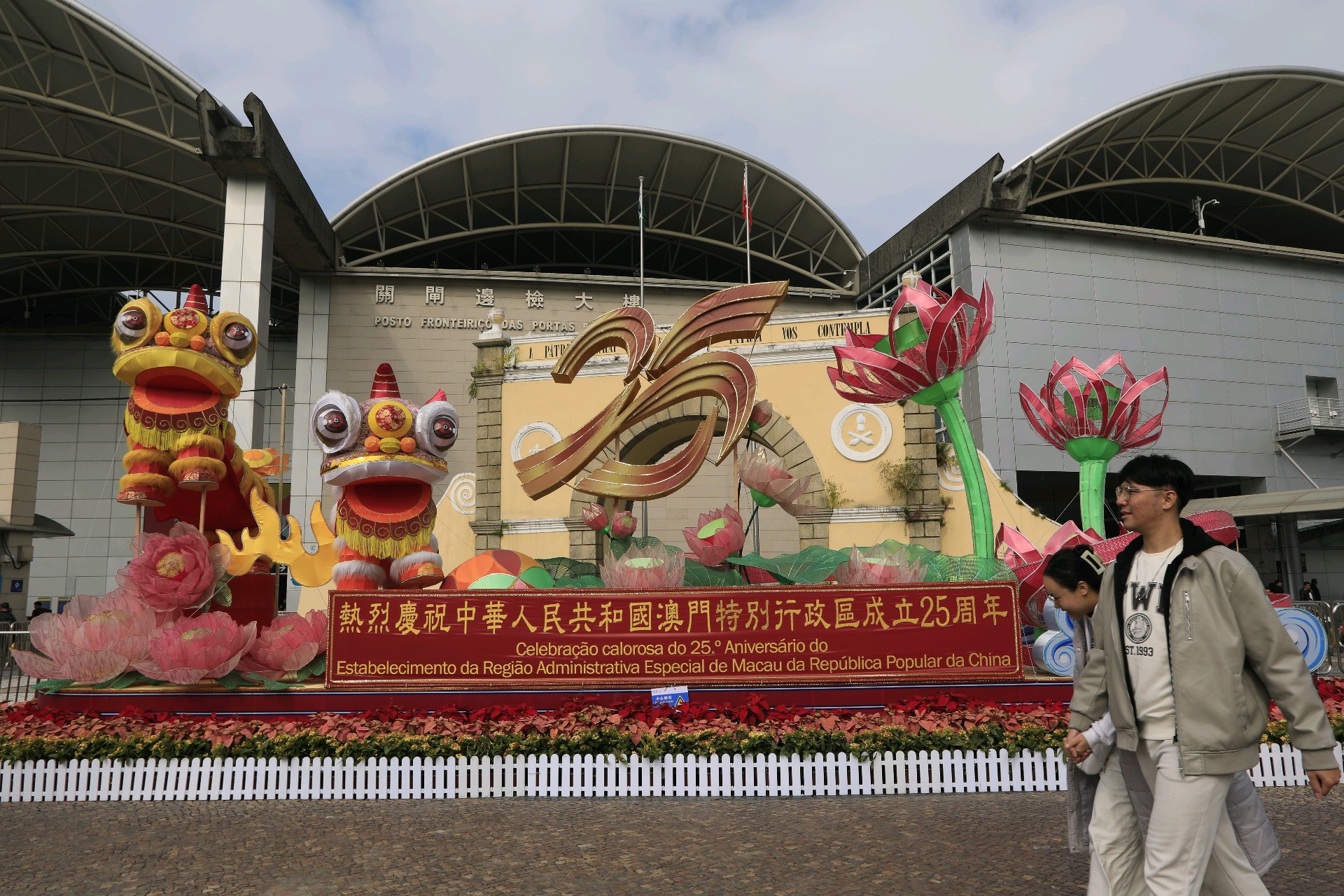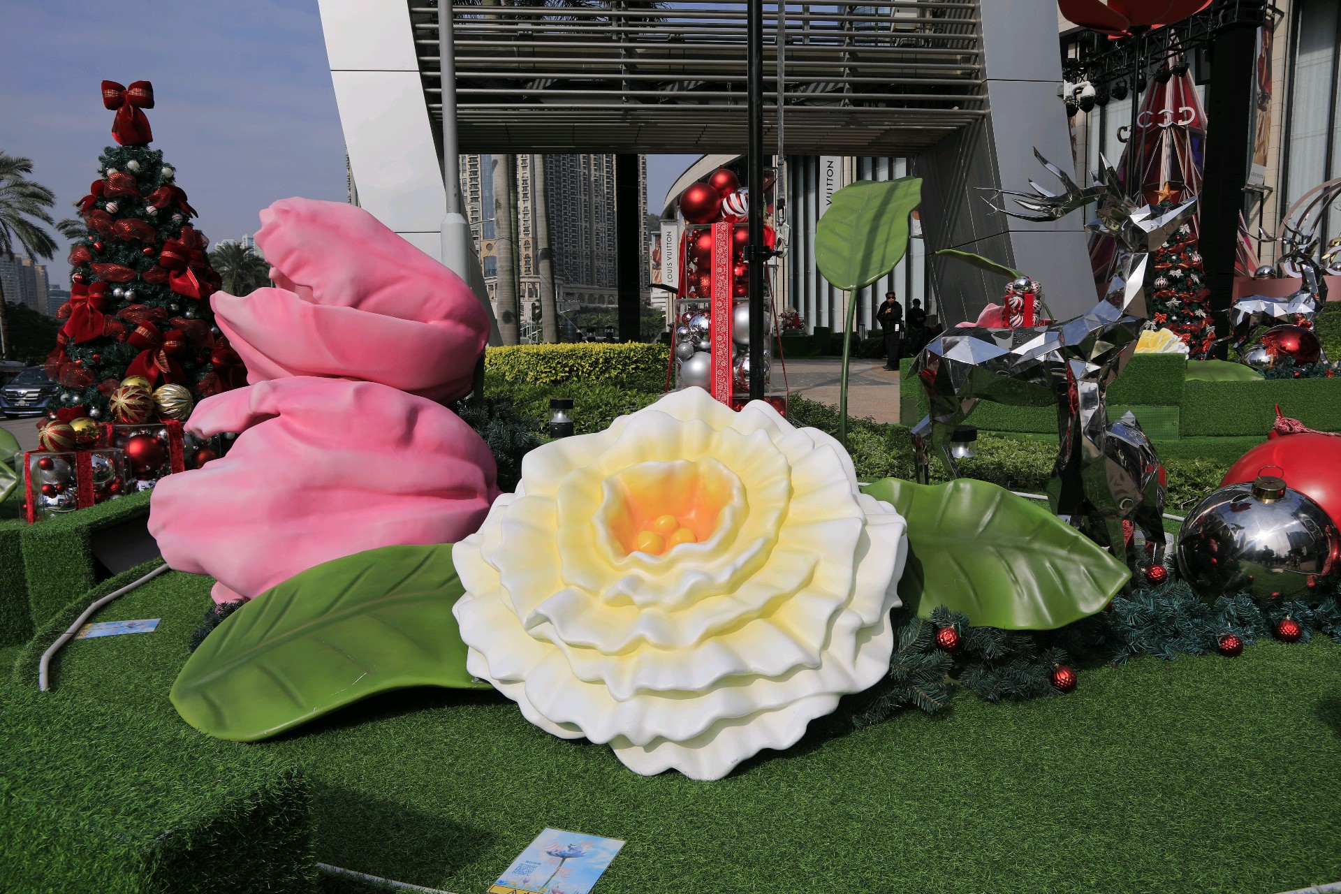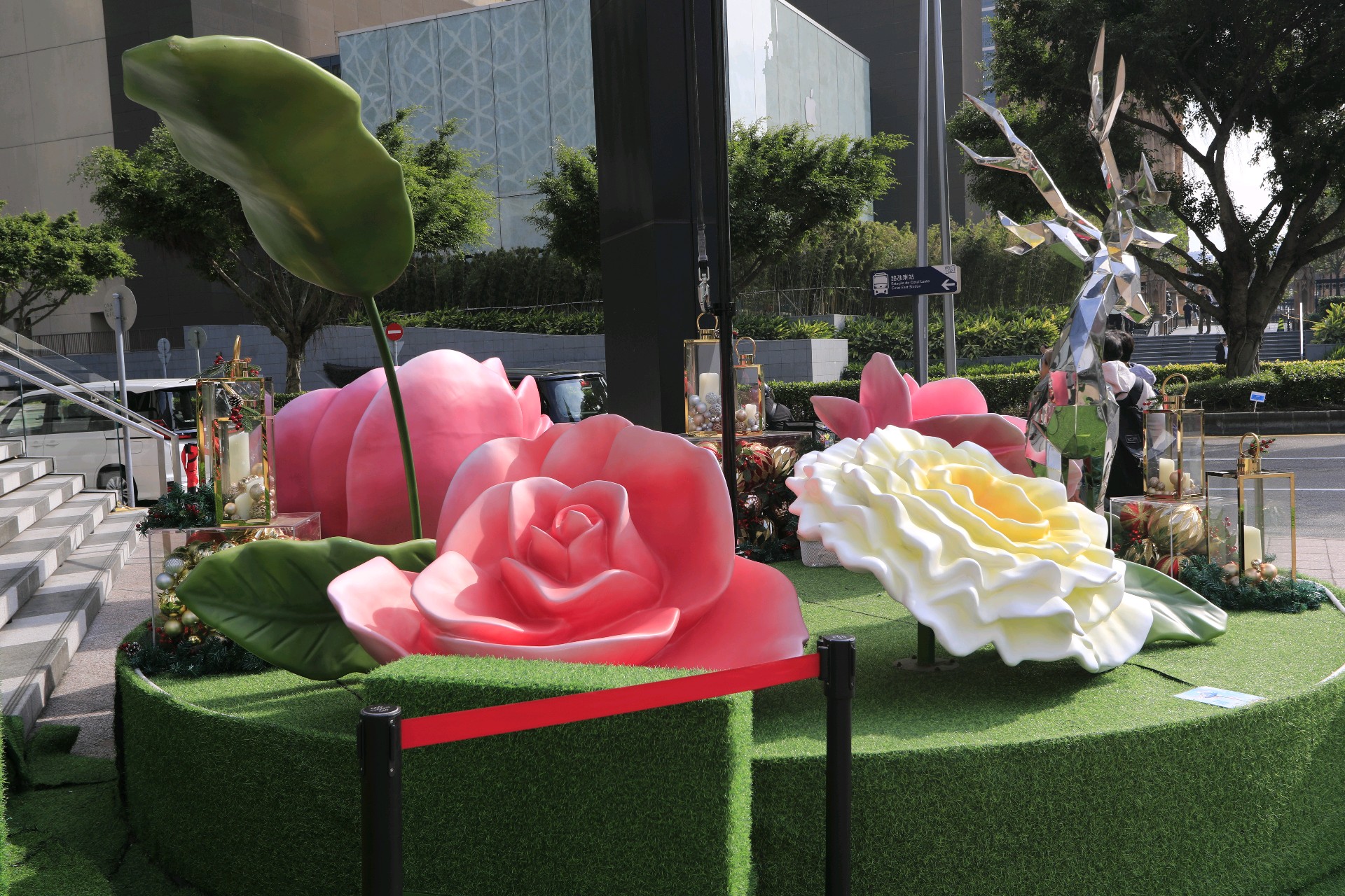 2024年12月24日,游客在澳门金莲花广场拍照打卡。澳门鲜花盛开、张灯结彩、喜气洋洋,全城沉浸在节日里,幸福和喜悦写在人们脸上,更洋溢在每个人心间。王东元 摄影