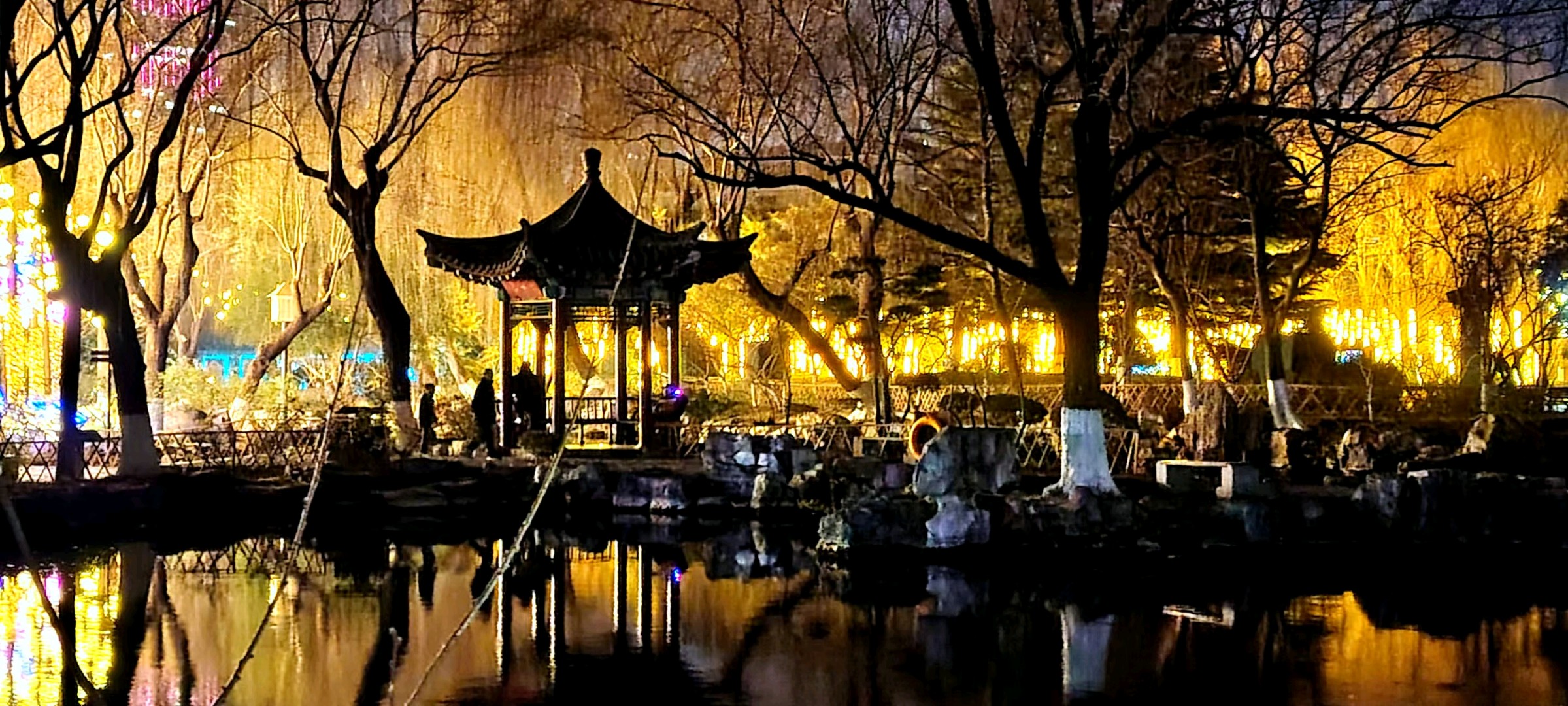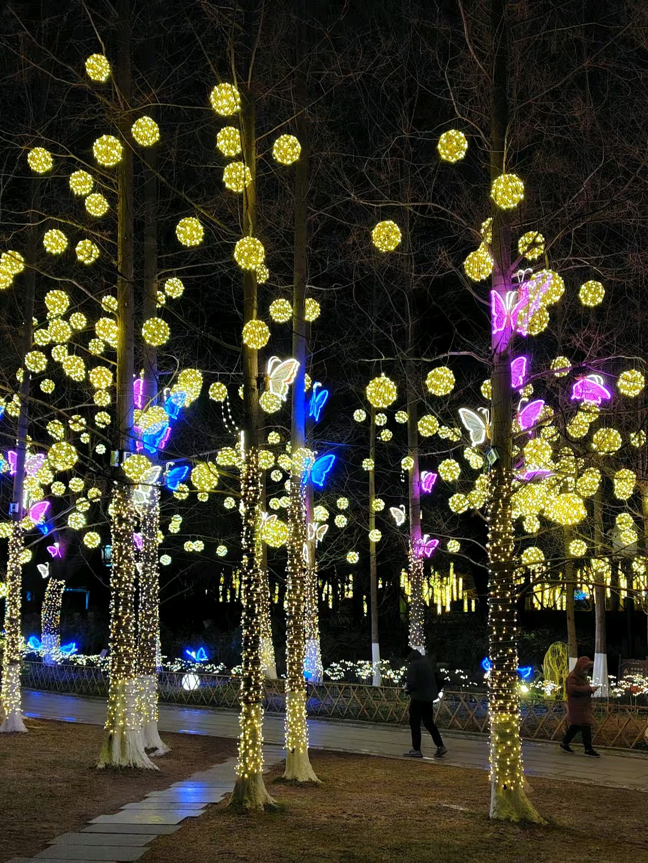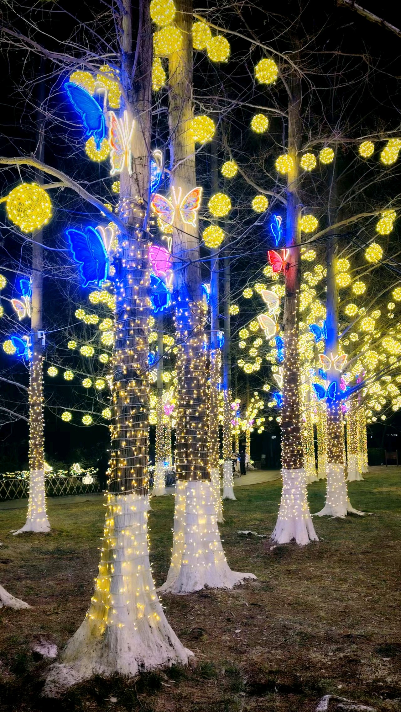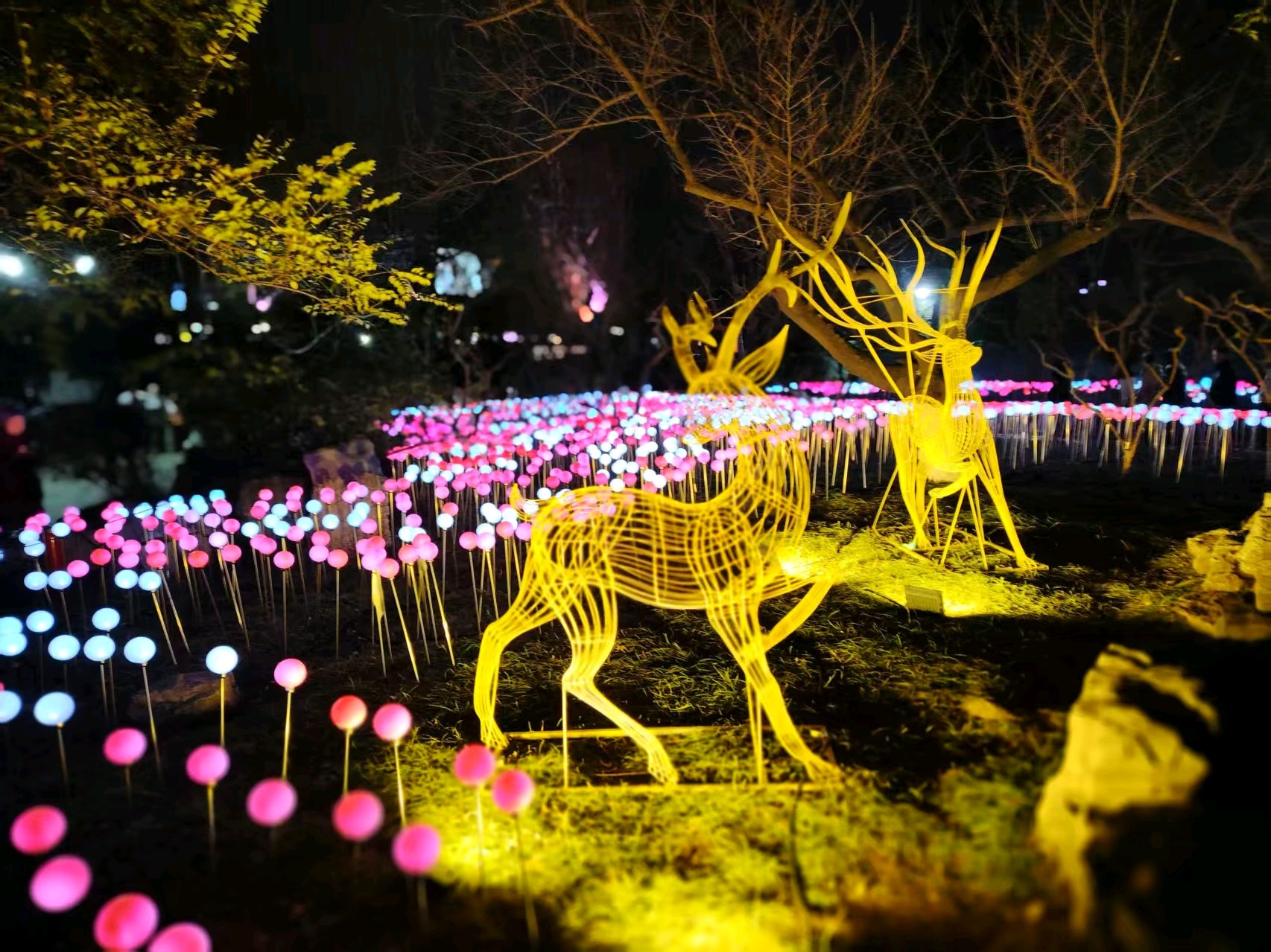 五龙潭可谓花灯最早亮灯的公园,华灯初上,满树的彩蝶飞舞,蜂鸣四起,一串串对联高高悬挂,文化味十足,小鹿在樱花树下跳跃,呈现一派欢快的节日氛围。