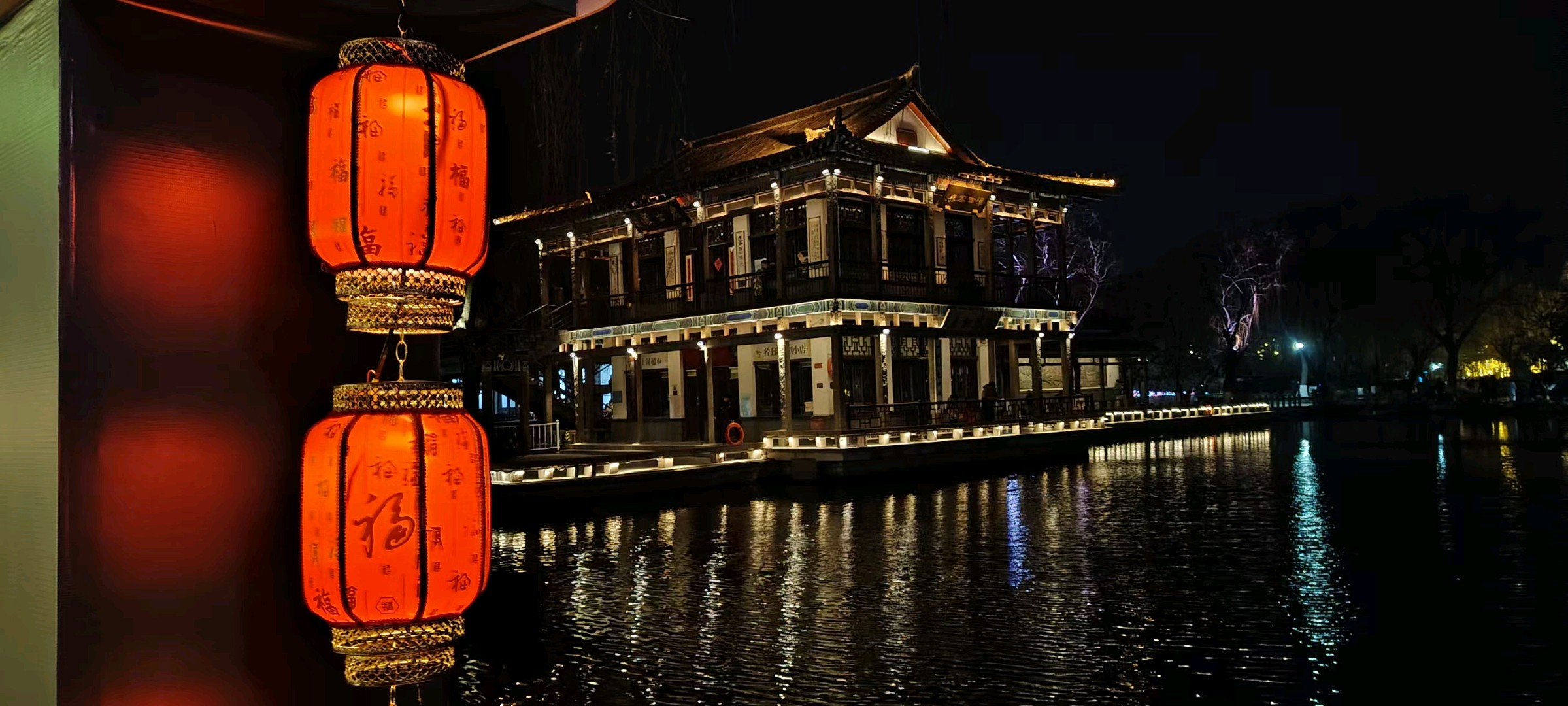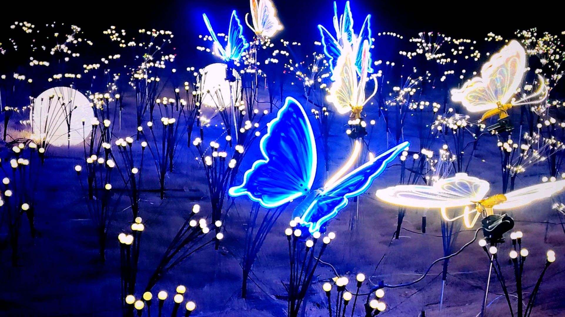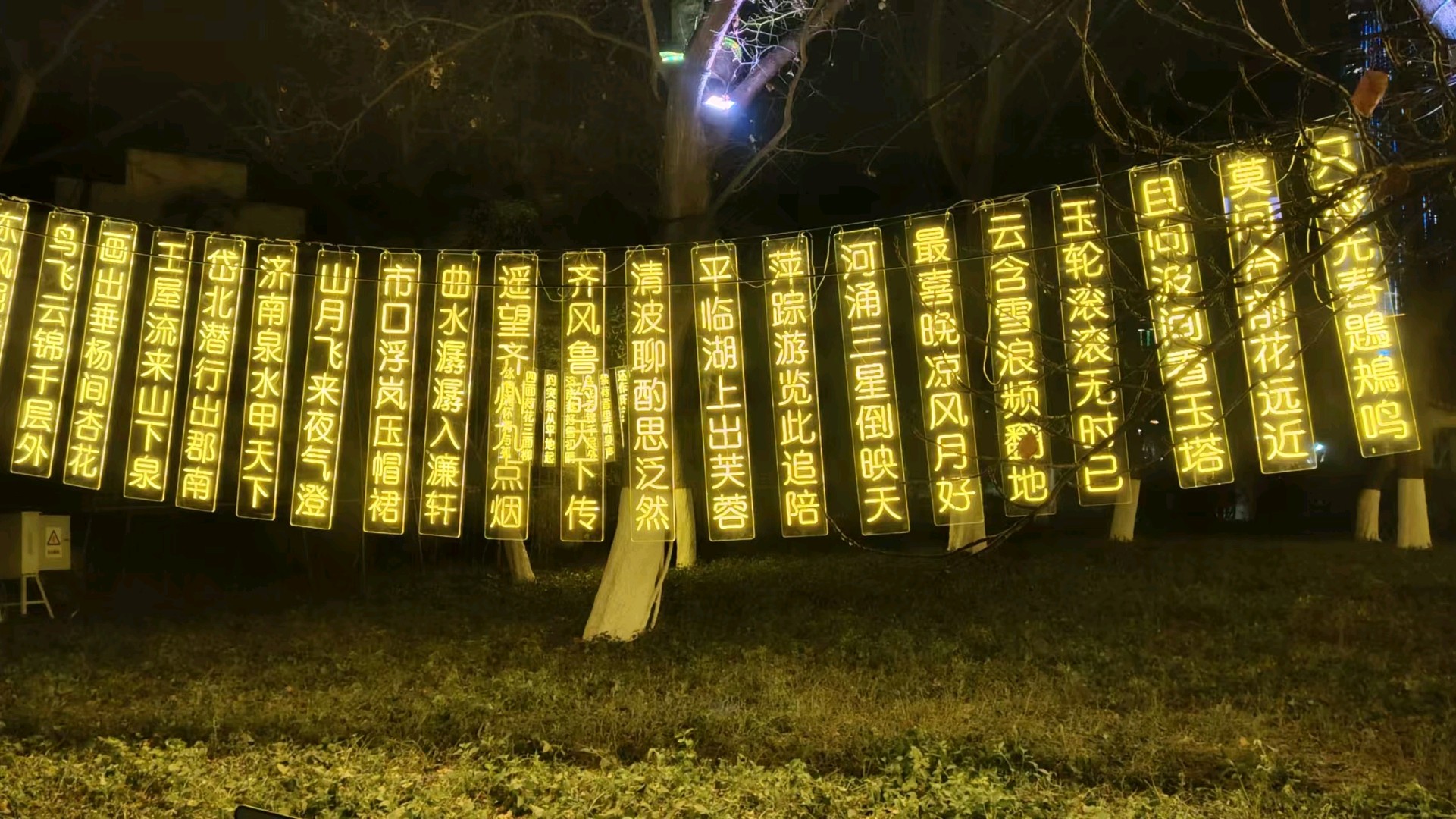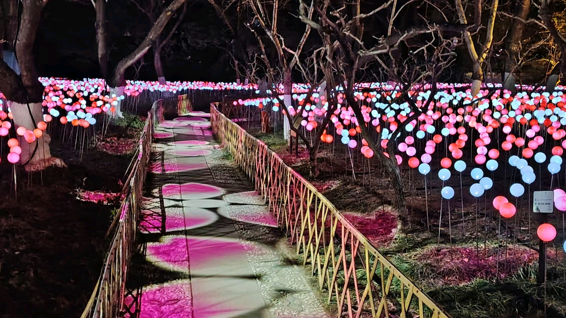 五龙潭可谓花灯最早亮灯的公园,华灯初上,满树的彩蝶飞舞,蜂鸣四起,一串串对联高高悬挂,文化味十足,小鹿在樱花树下跳跃,呈现一派欢快的节日氛围。