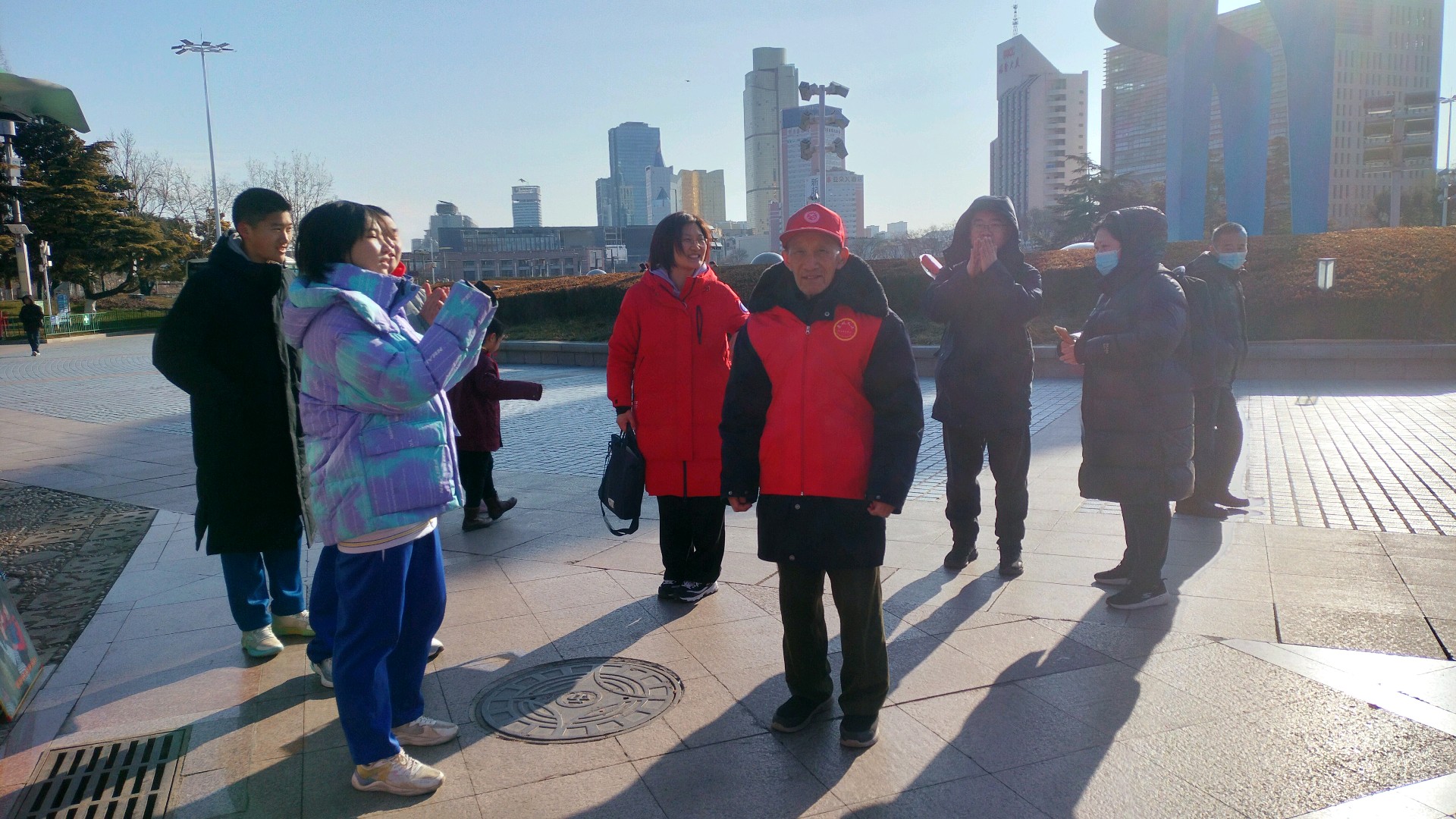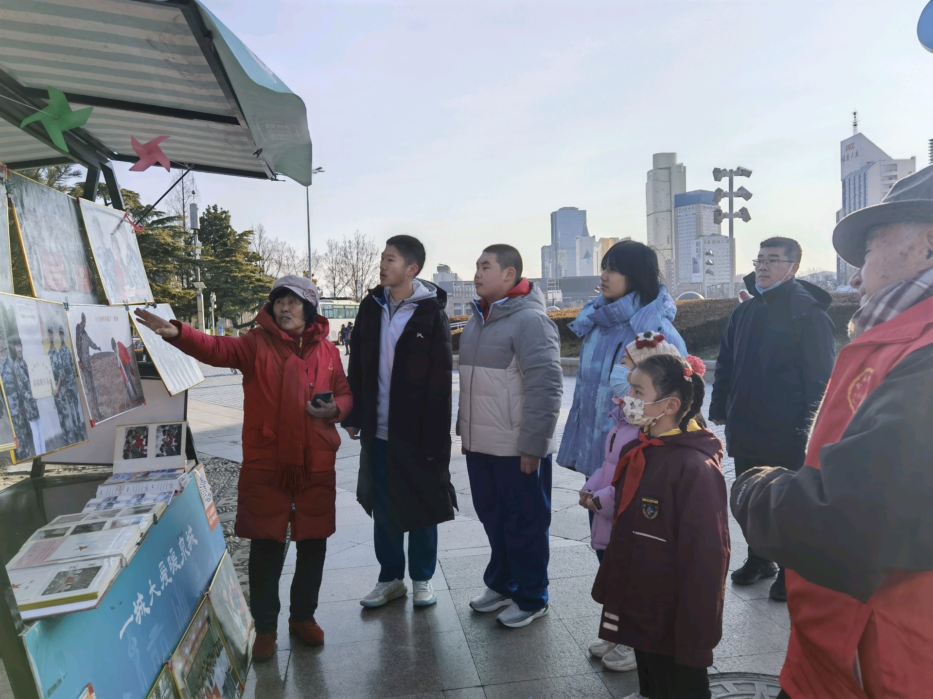 山东师范大学附属中学高一十班同学,在泉城广场做志愿者维护大客厅环境,为游客提供一些便利服务,并和家长一起观看拥军图片,进行爱国主义教育和国防教育;武警老兵钱玉田的几十年老战友,在观看拥军图片时巧遇,有说不完的话;济南的兵爸爸和兵妈妈,看到拥军照片,他们好似看到在新疆当兵的儿子,格外亲切。
