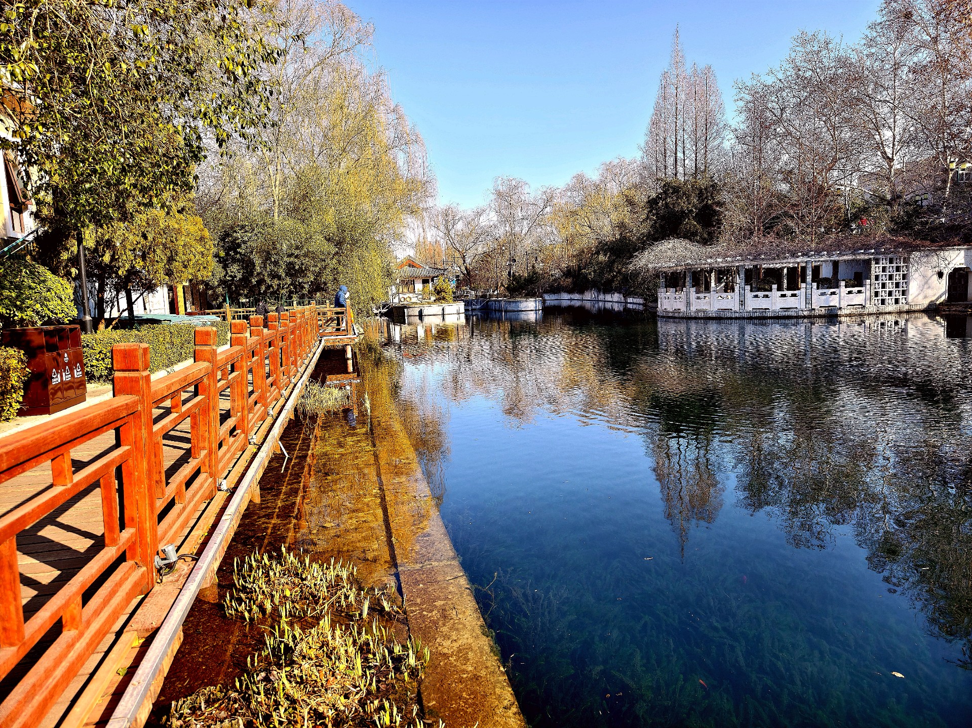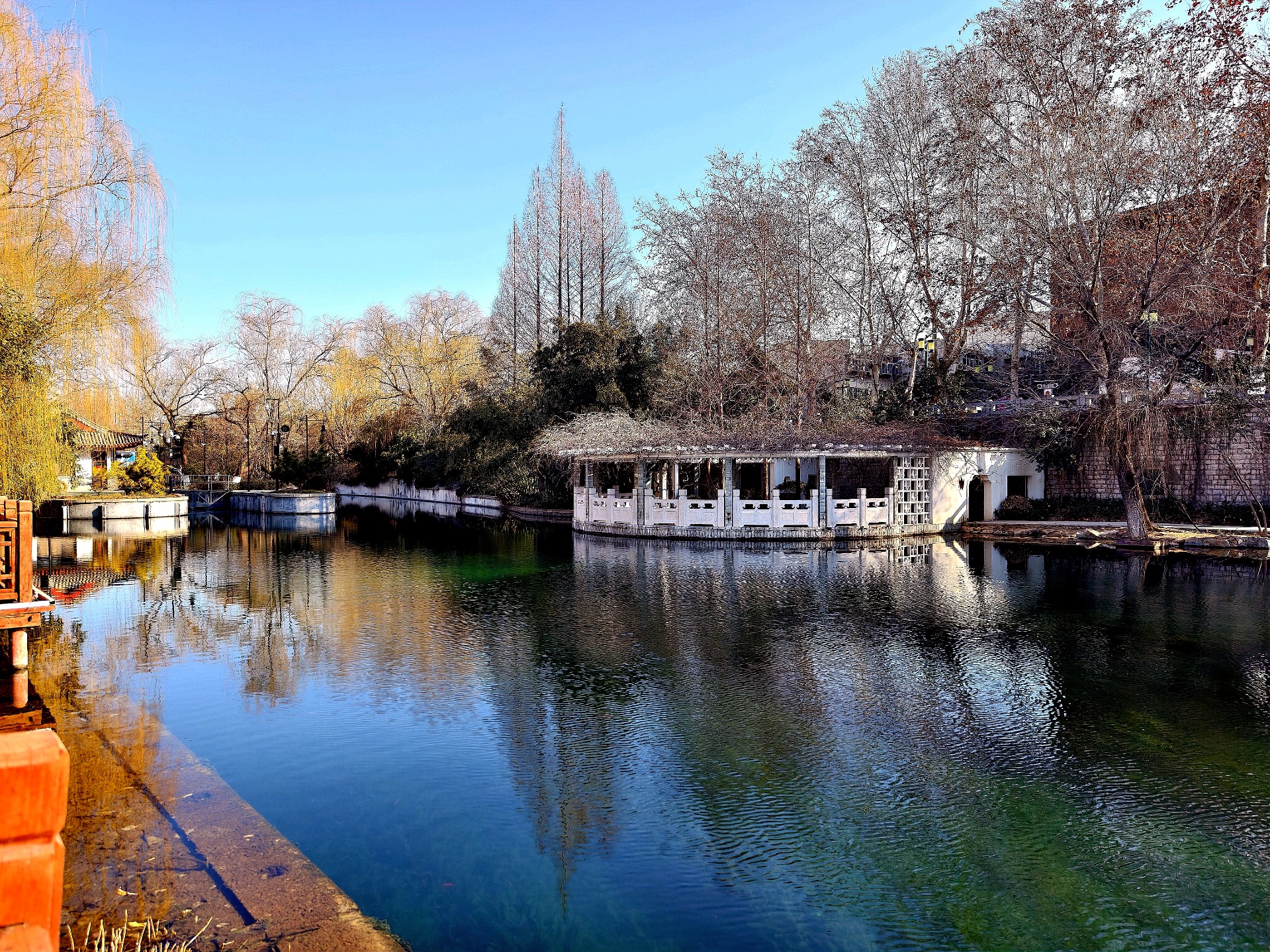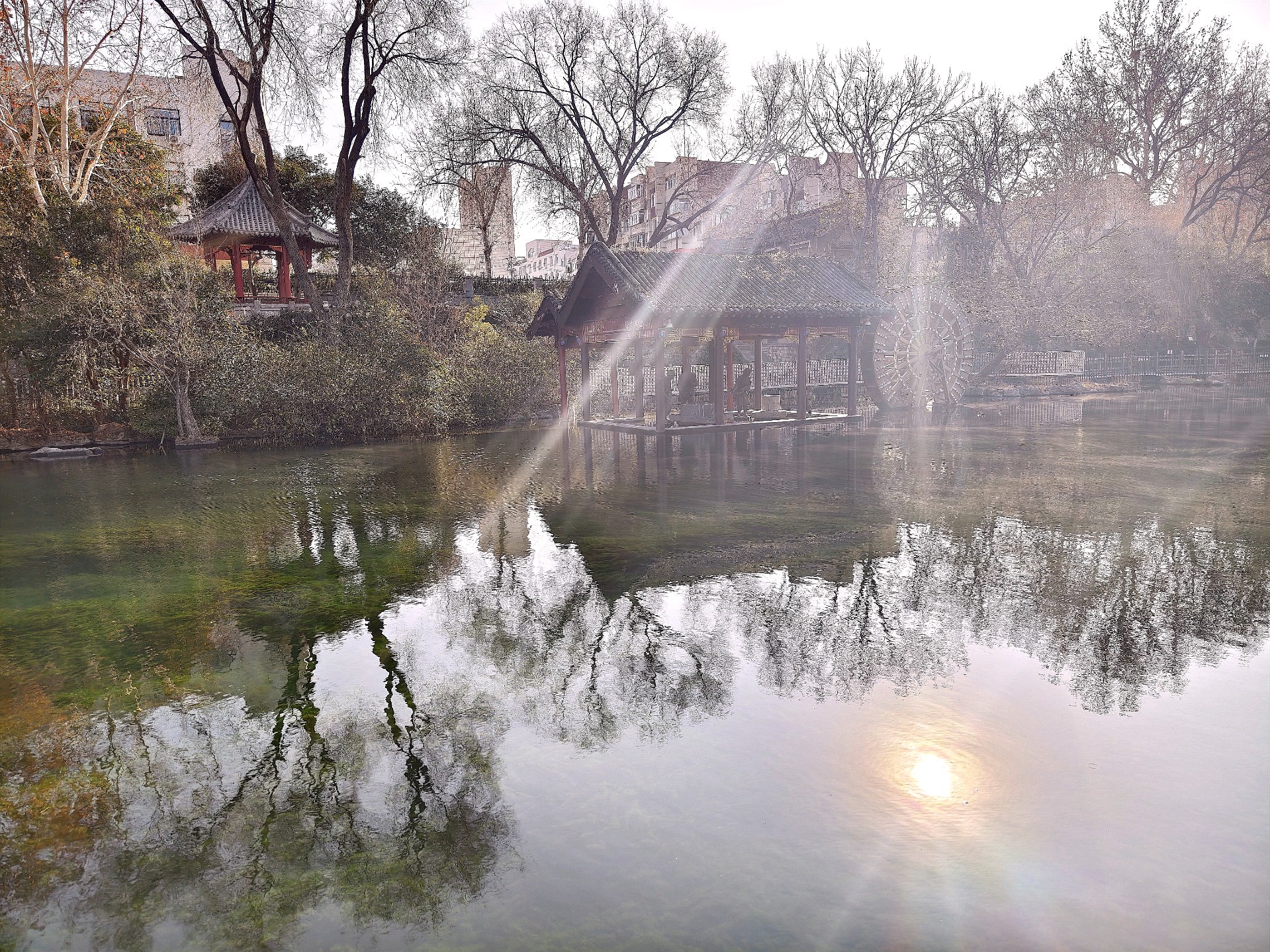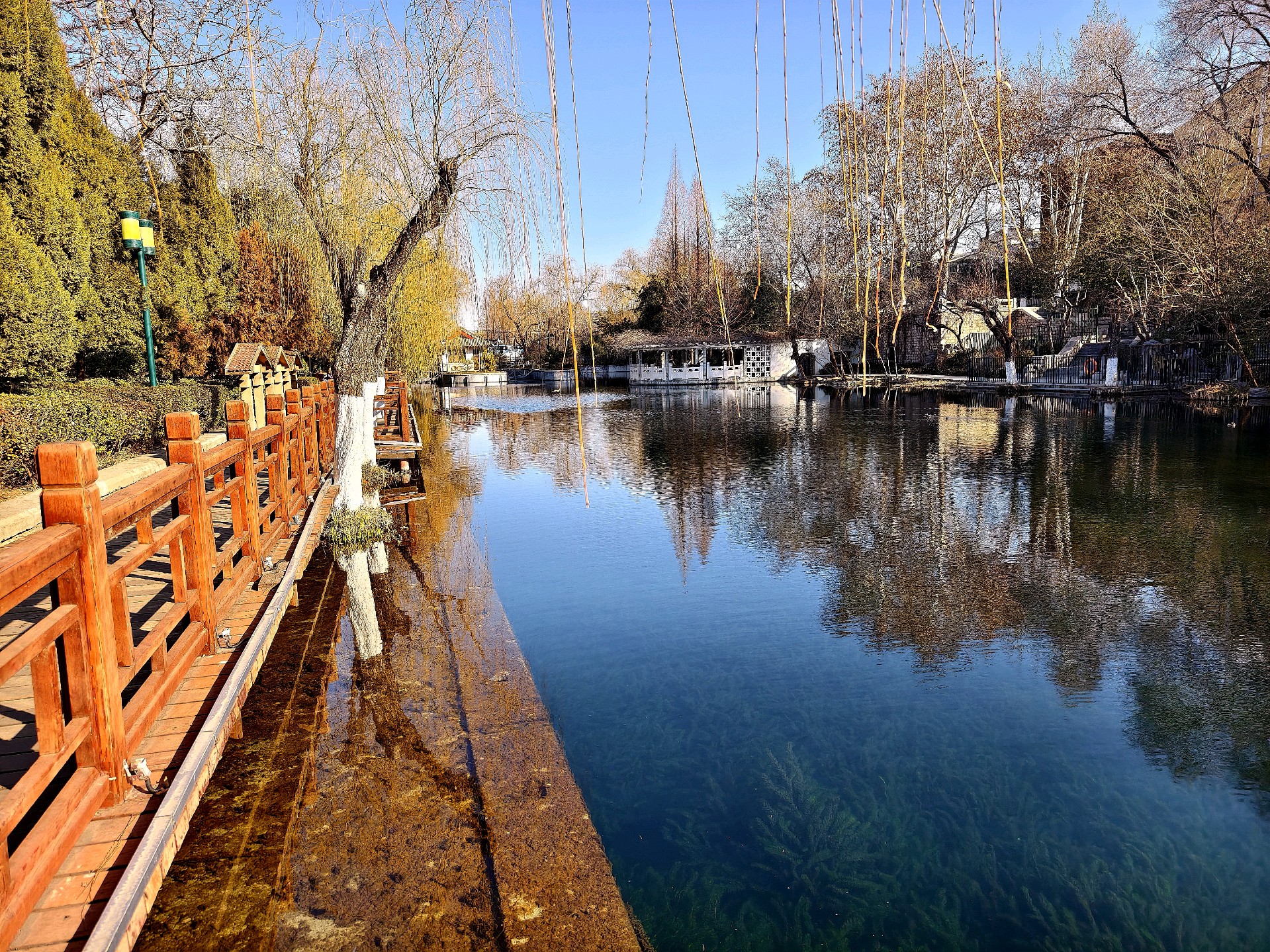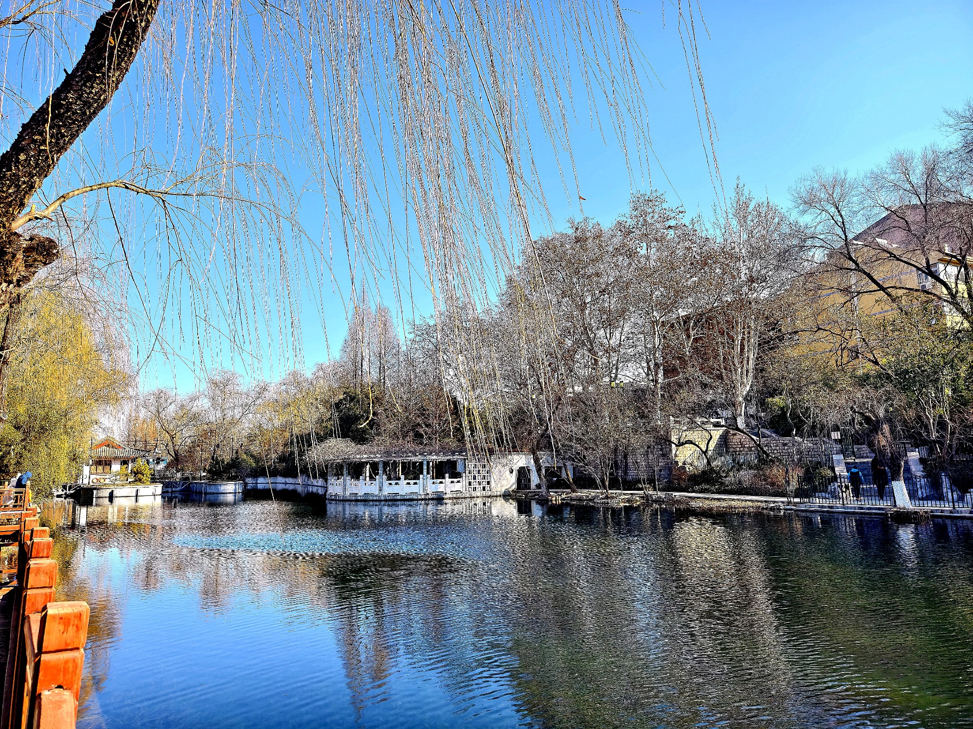 今日清晨的护城河,阳光灿烂,水天一色。垂柳的枝条犹如一根根金条垂向透明的泉水河,护城河畔美景分外妖娆令人陶醉。