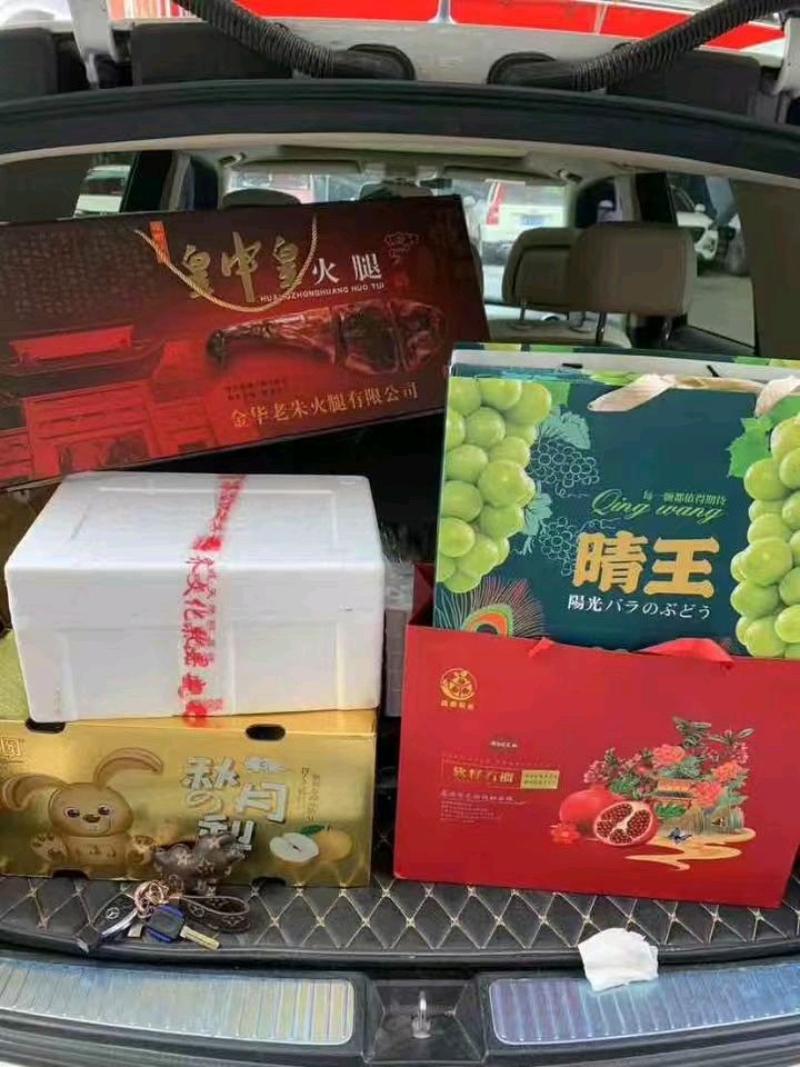 后备箱里装满了满满的爱。父母知道我和他们宝贝的孙女爱吃水果,给我们带回了多种丰盛的水果礼盒,泡沫盒里装满了大虾和鱼……一路上承载着父母的爱。