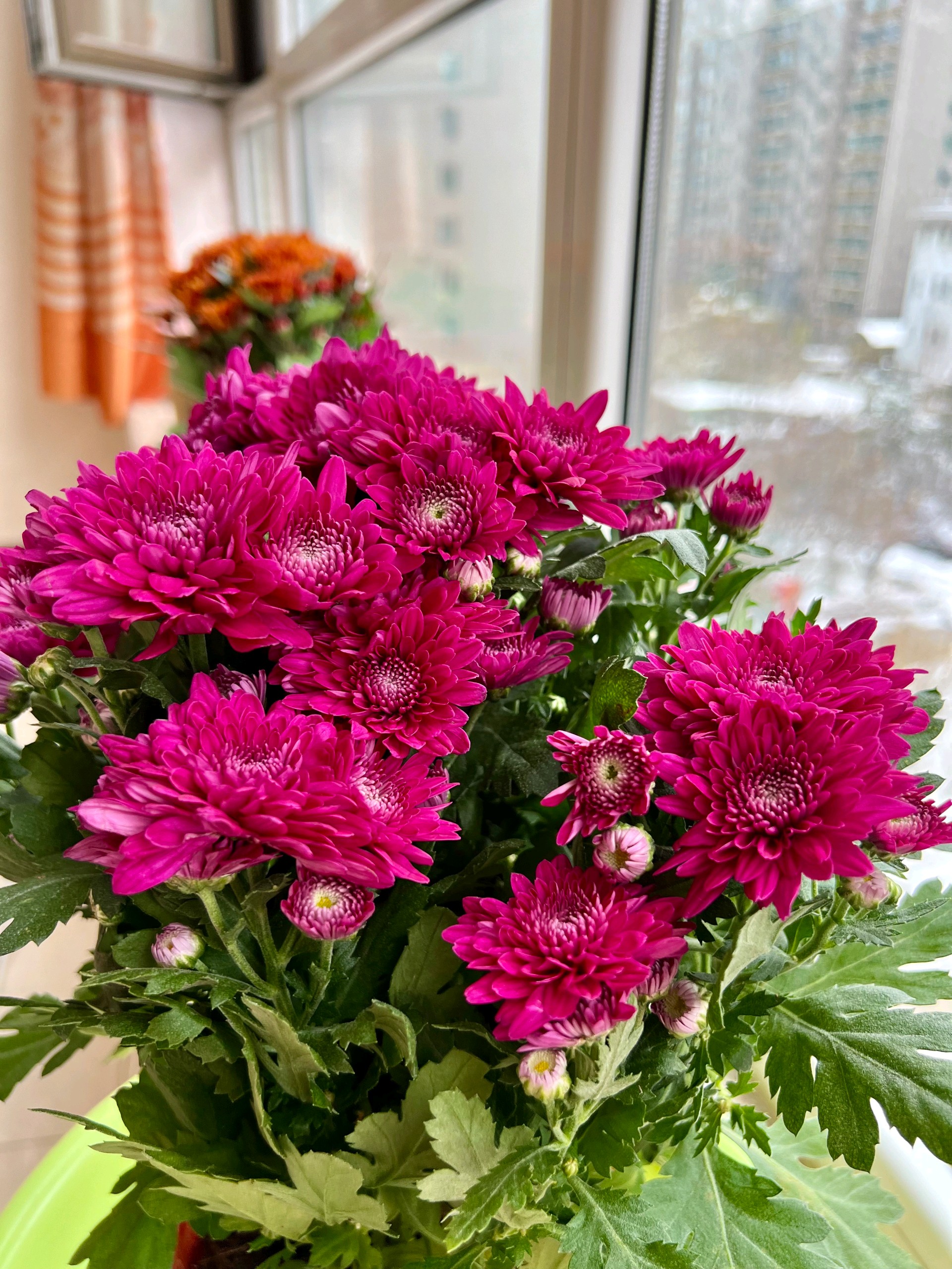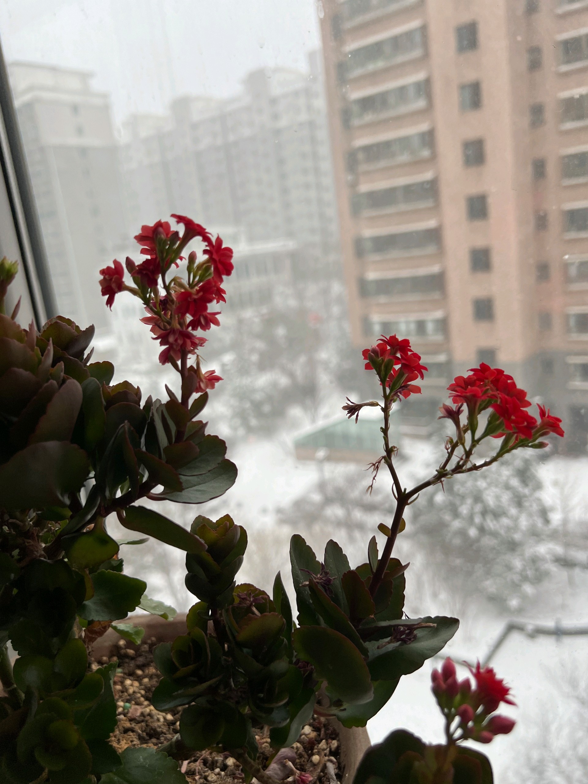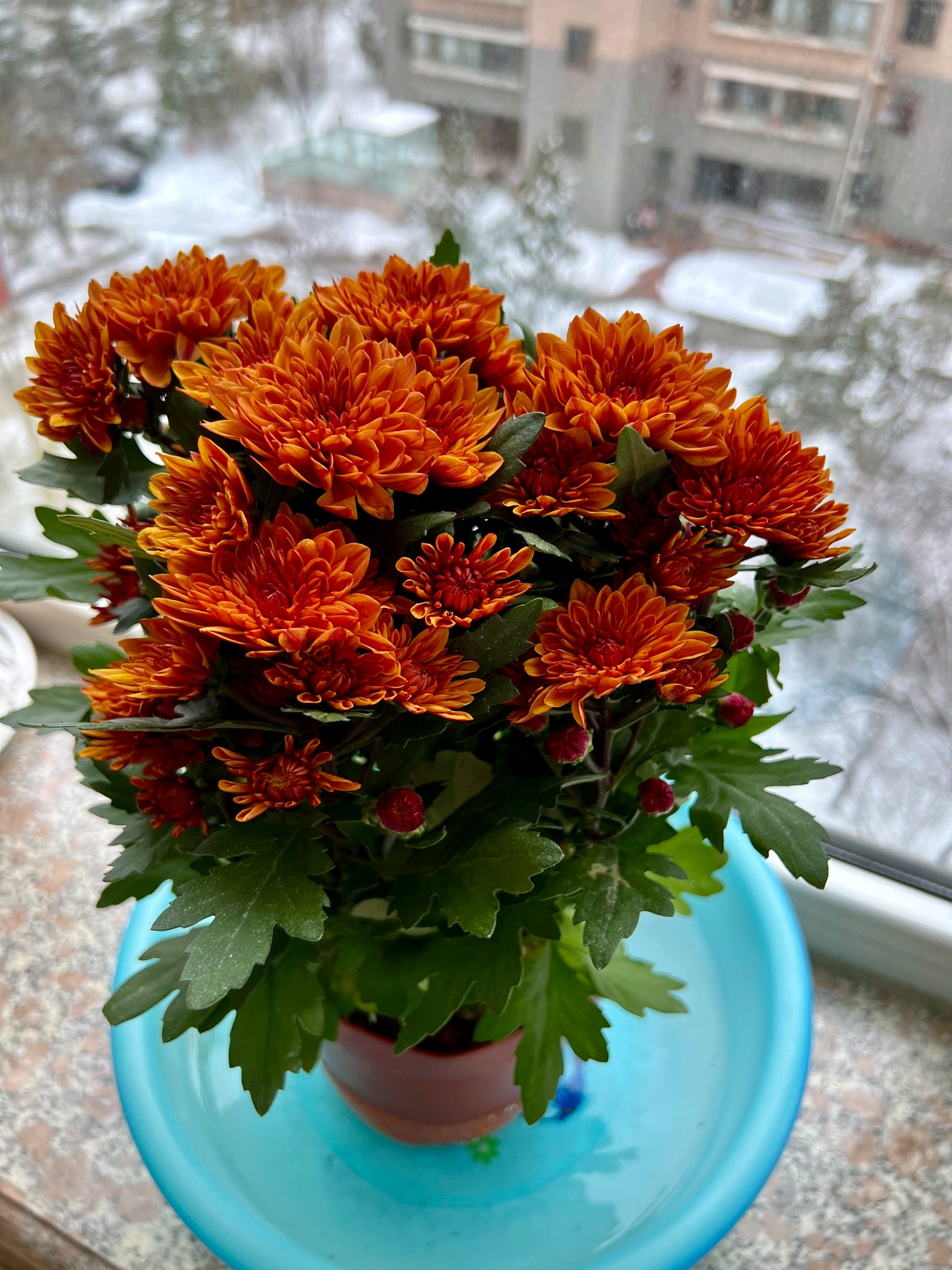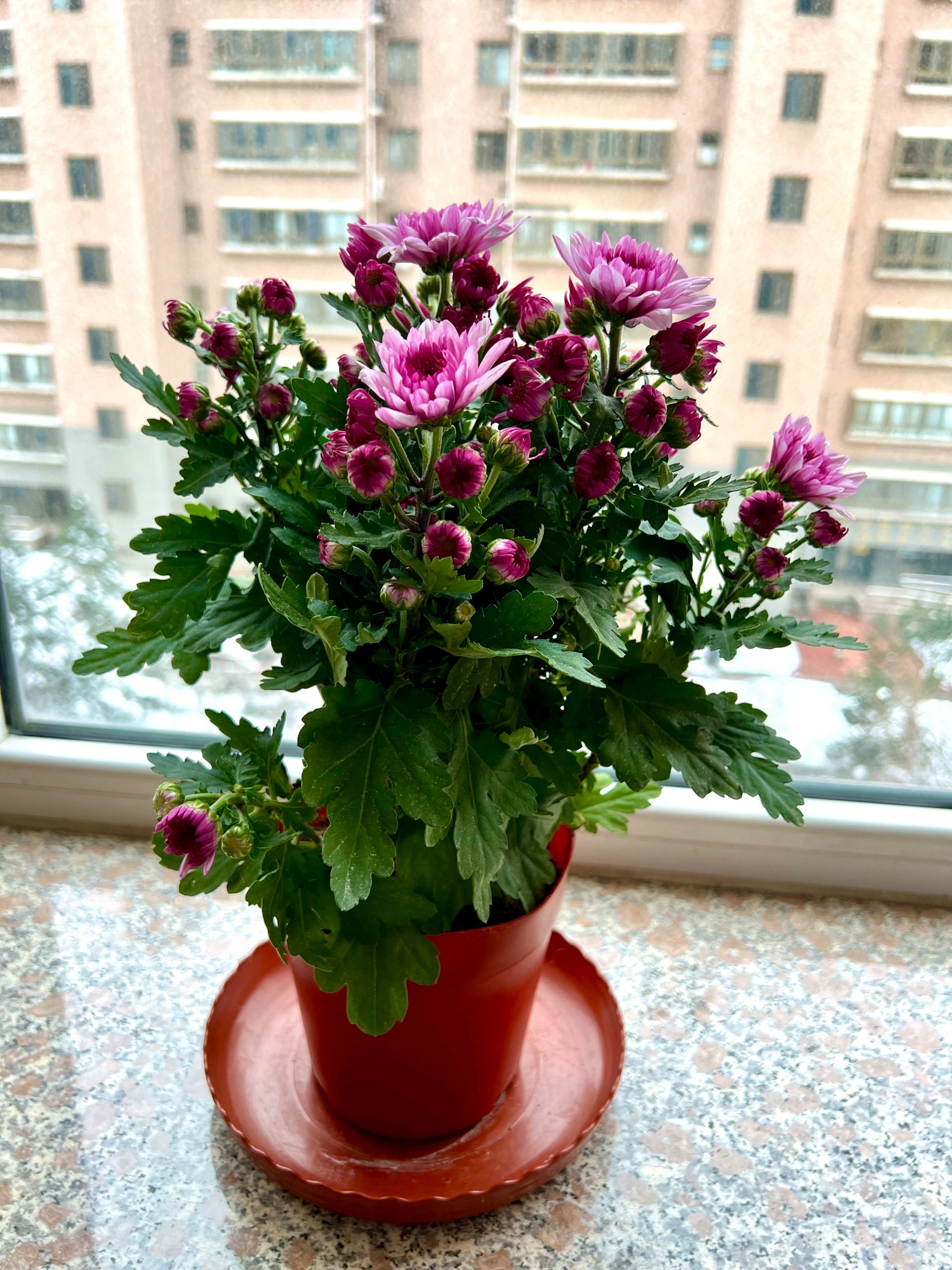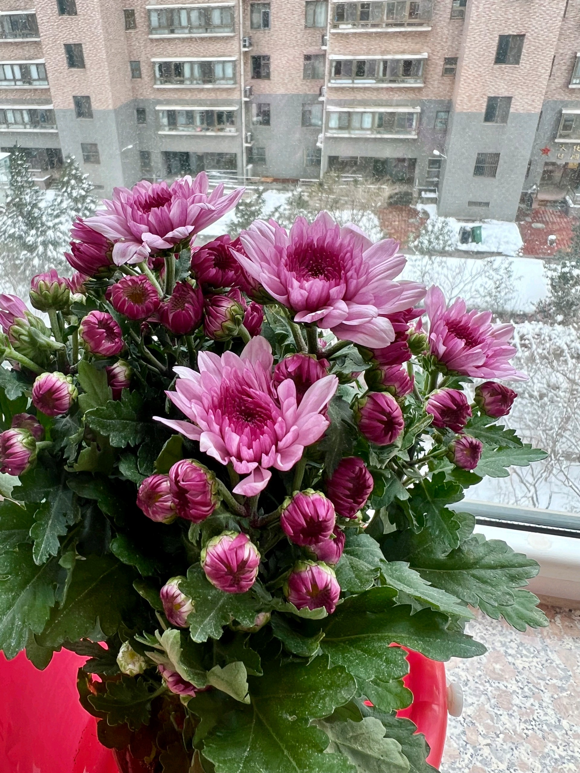 温室里的花朵与雪景交相辉映,我养的的四季荷兰菊美丽绽放