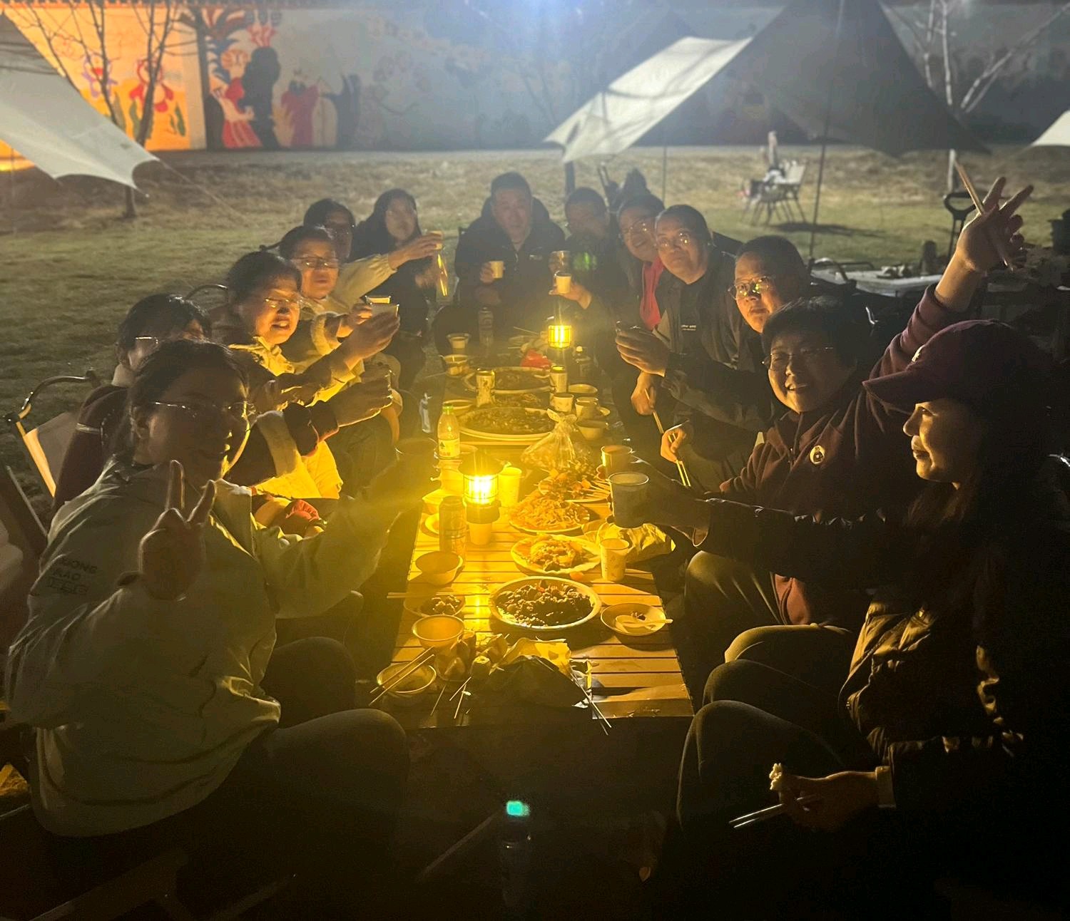 傍晚的“厨”类拔萃环节,老师们纷纷化身大厨,男教师主动承担后勤工作,现场充满烟火气。夜幕降临,篝火晚会和烟火秀将活动气氛拉满,大家载歌载舞,笑容灿烂。