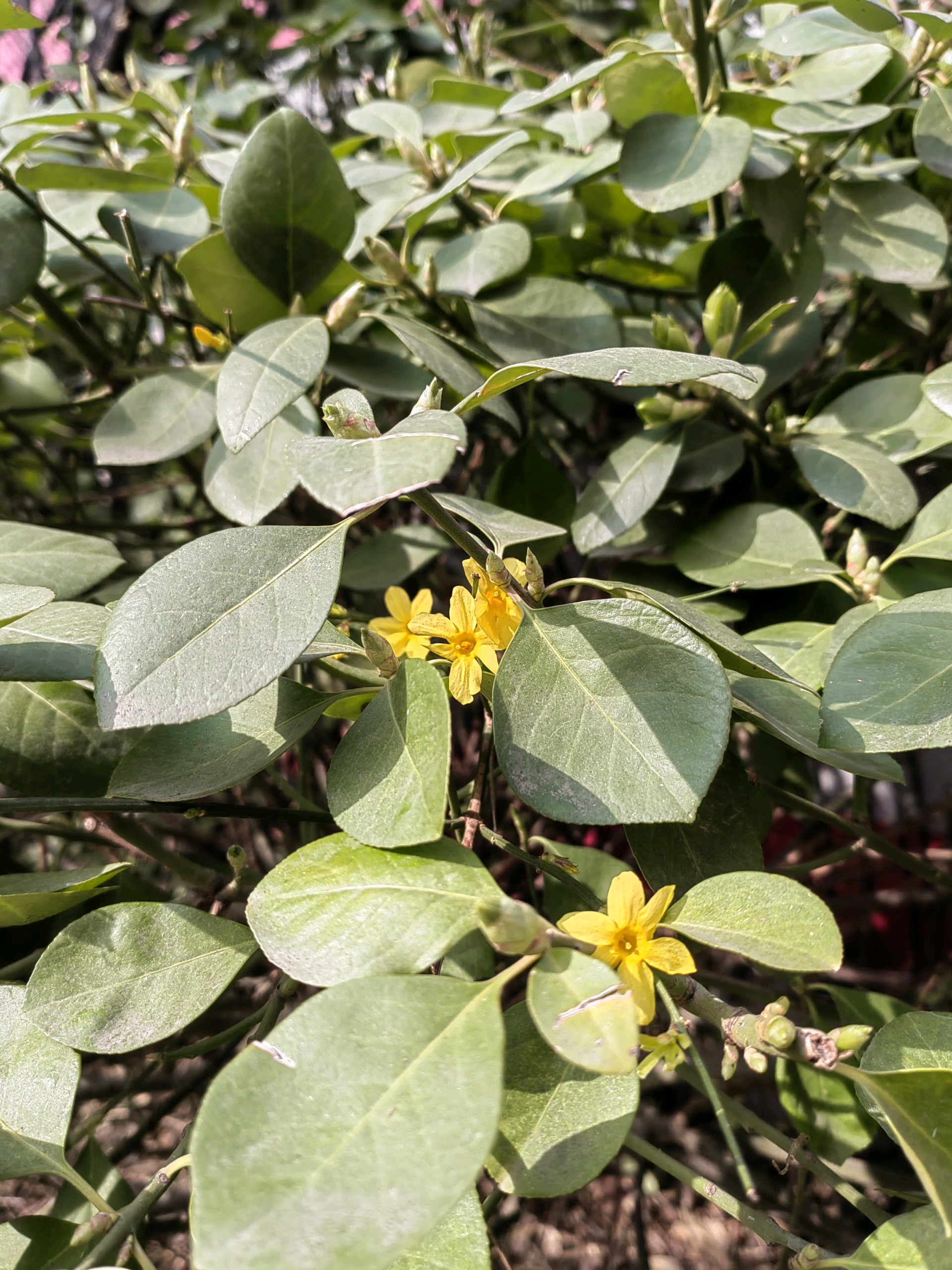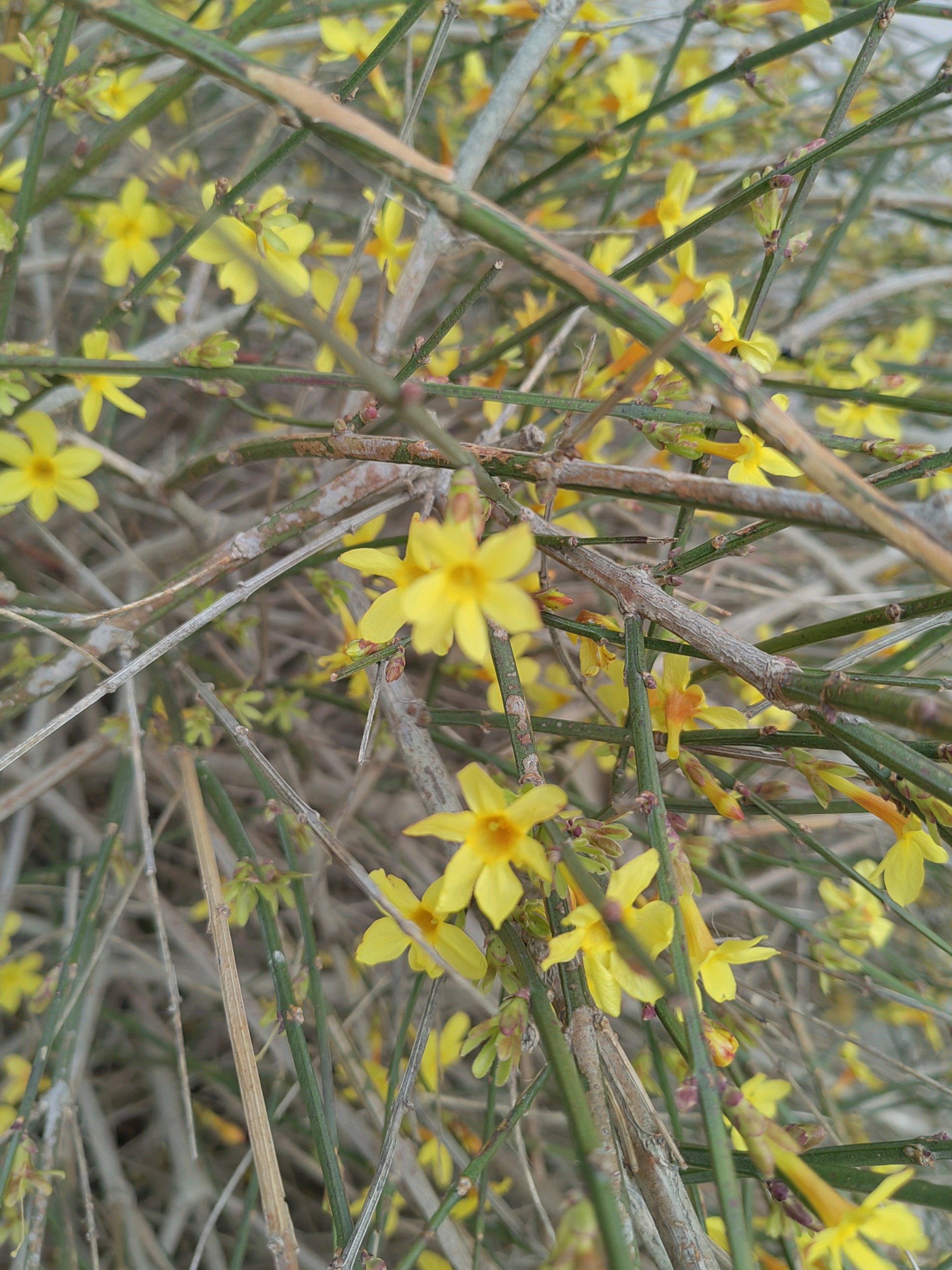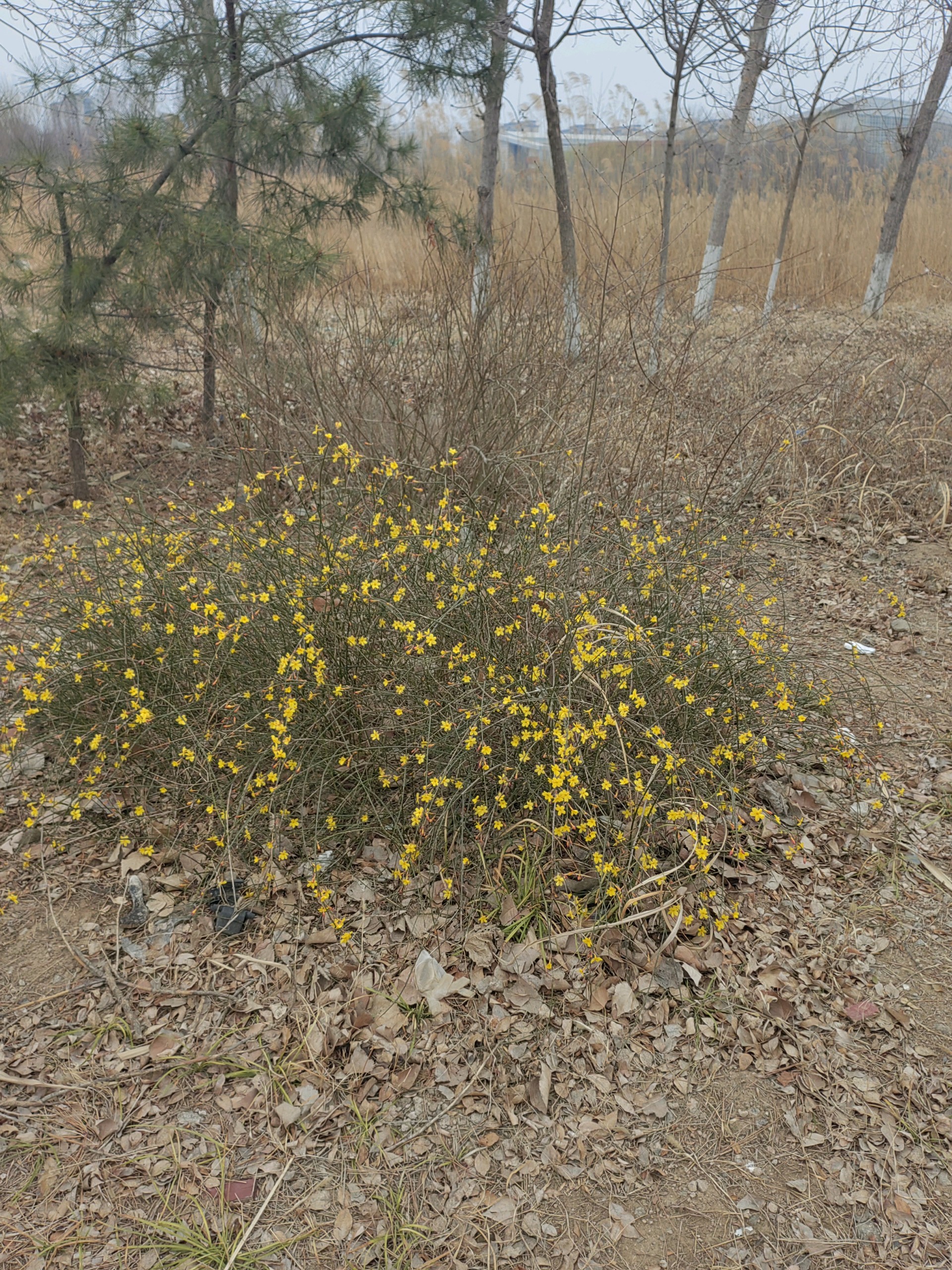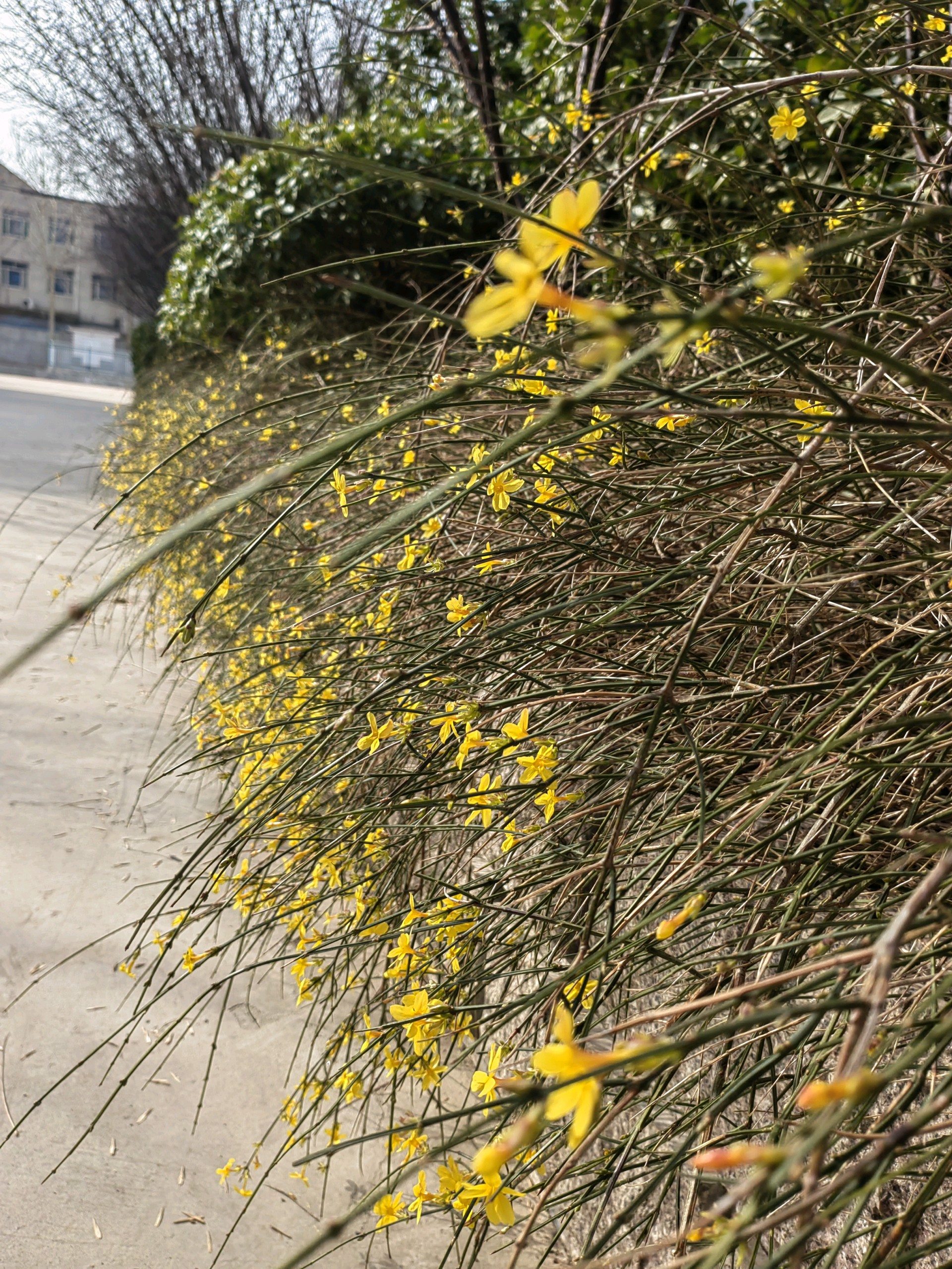 春日来赏花,迎春花儿笑。花开一串串,金光撒一片。