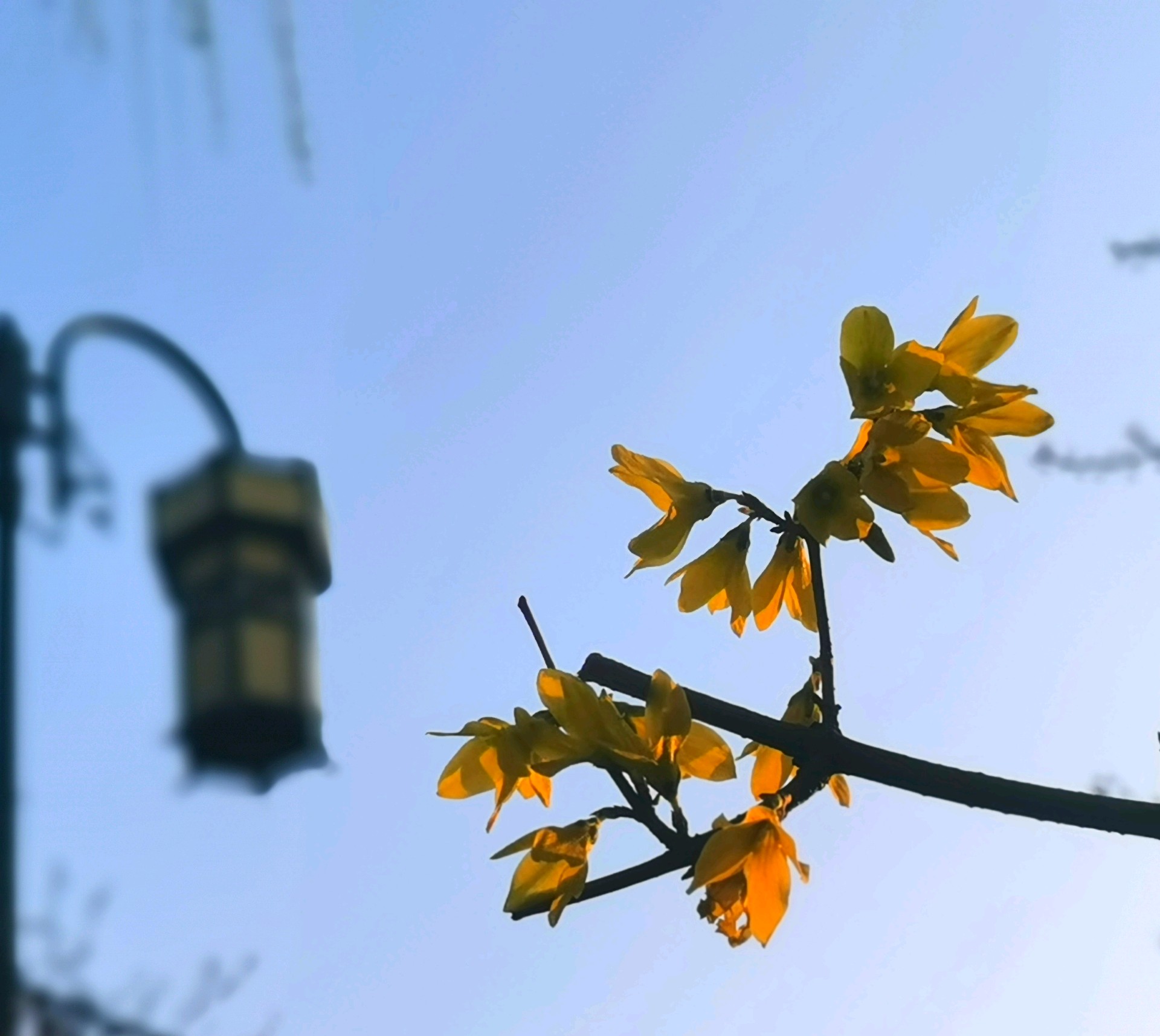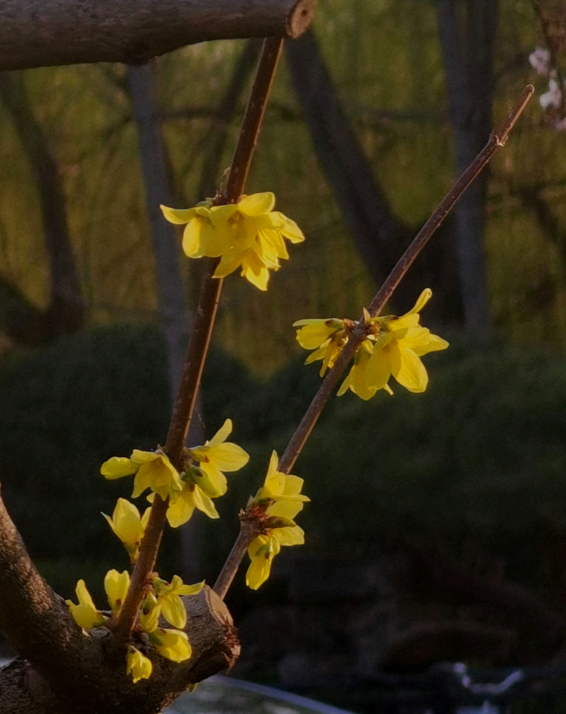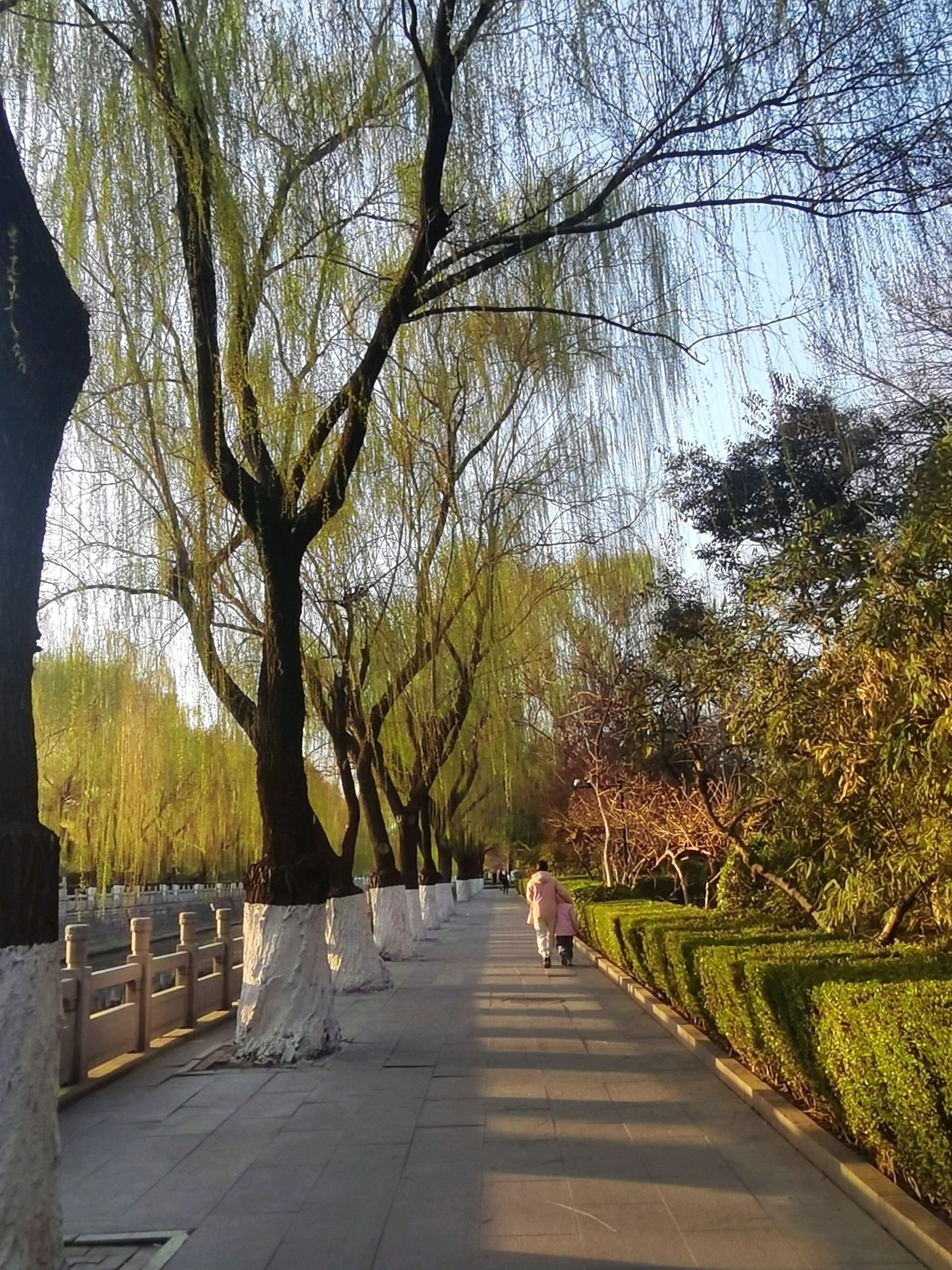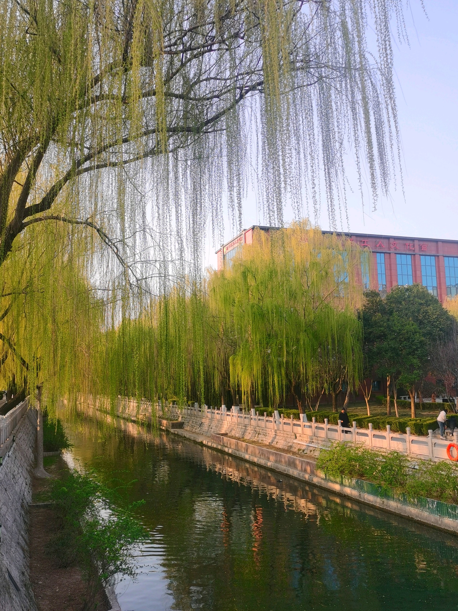 二月春风似剪刀,护城河岸的柳树吐绿,嫩嫩的枝条随风摆动,好像在于行人问好。花坛中的连翘也开出了黄色的小花,一串串,一枝枝。