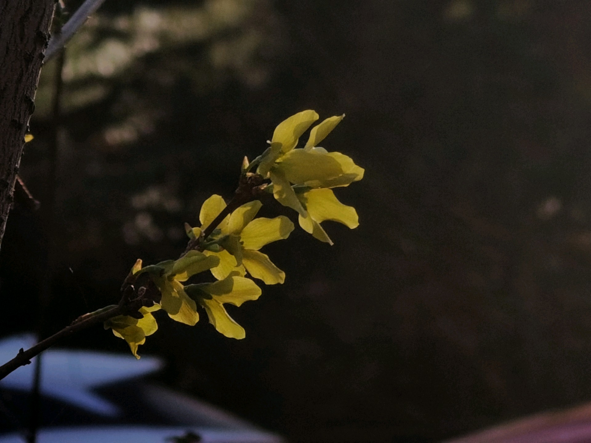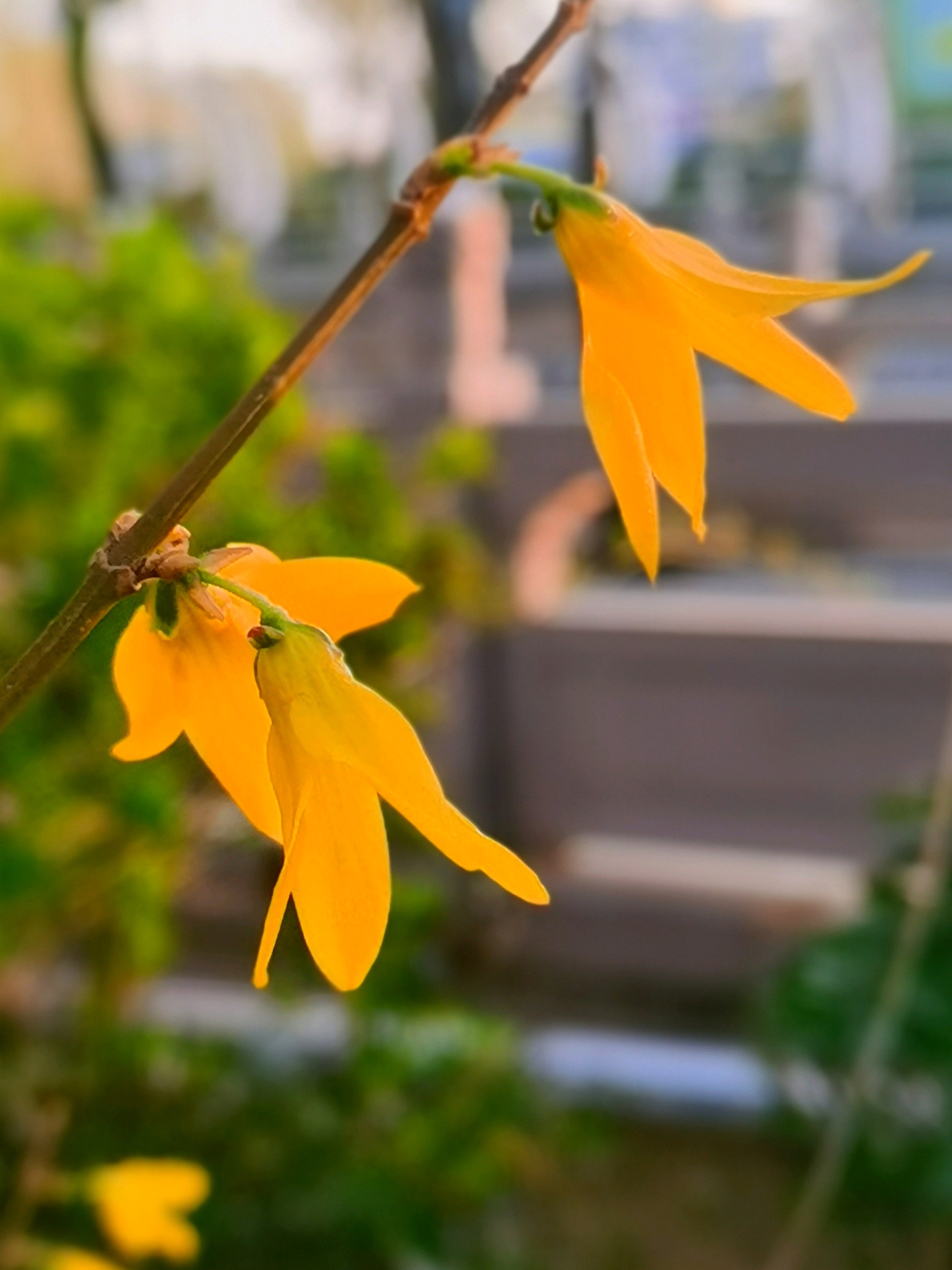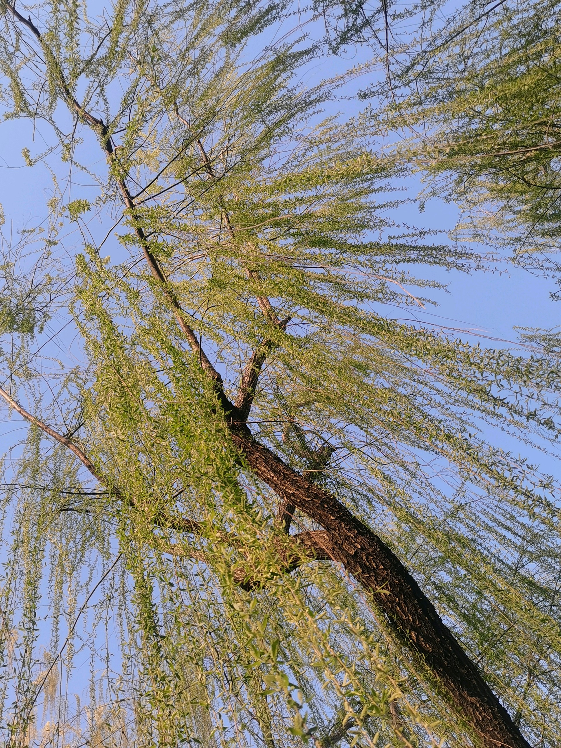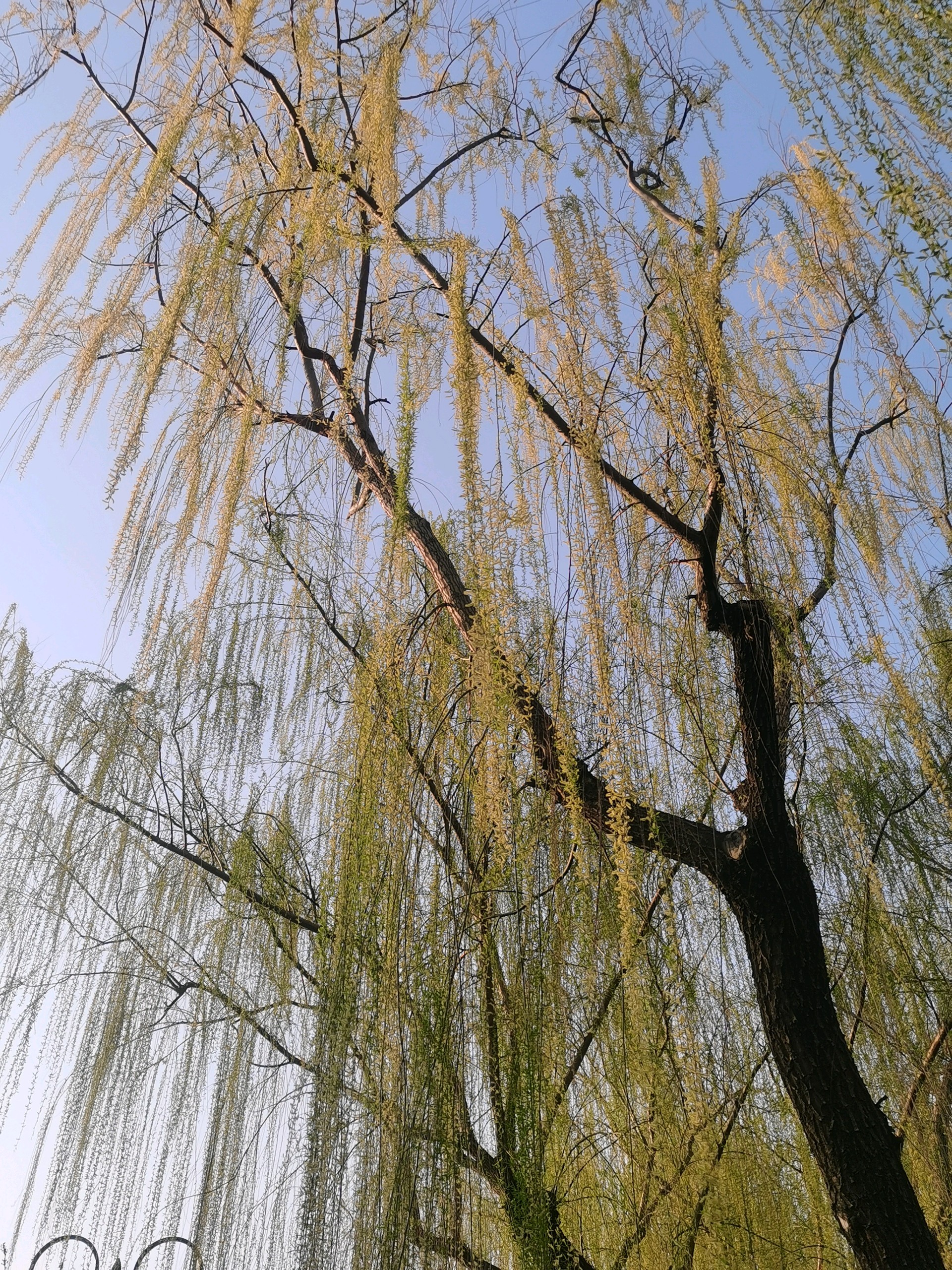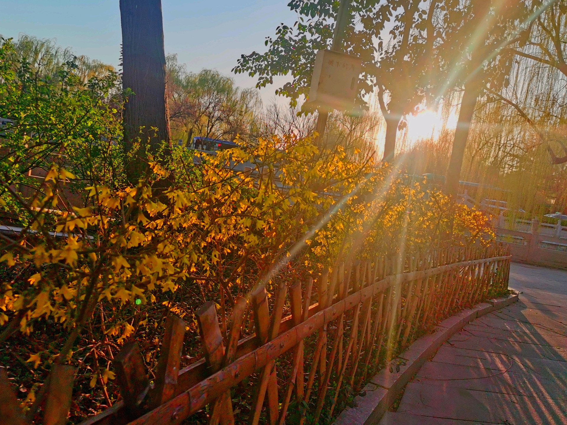 二月春风似剪刀,护城河岸的柳树吐绿,嫩嫩的枝条随风摆动,好像在于行人问好。花坛中的连翘也开出了黄色的小花,一串串,一枝枝。