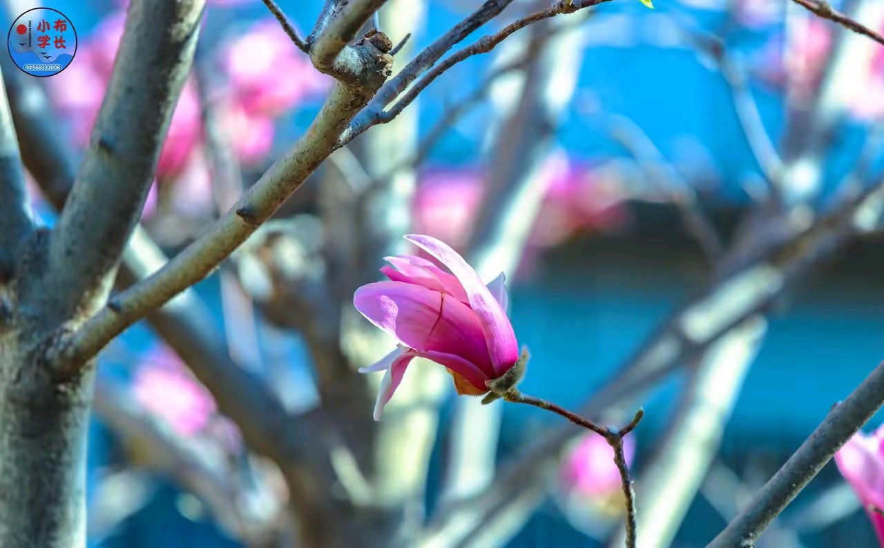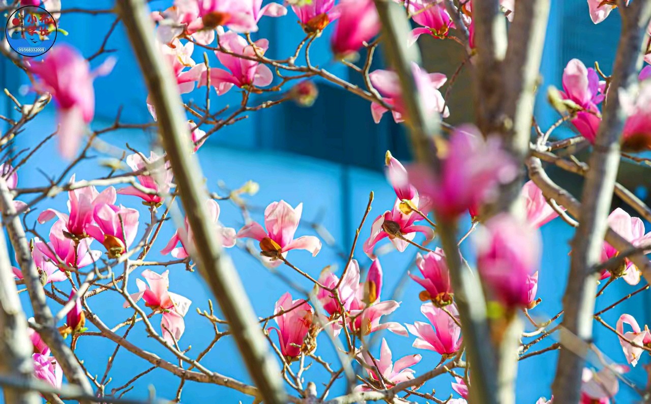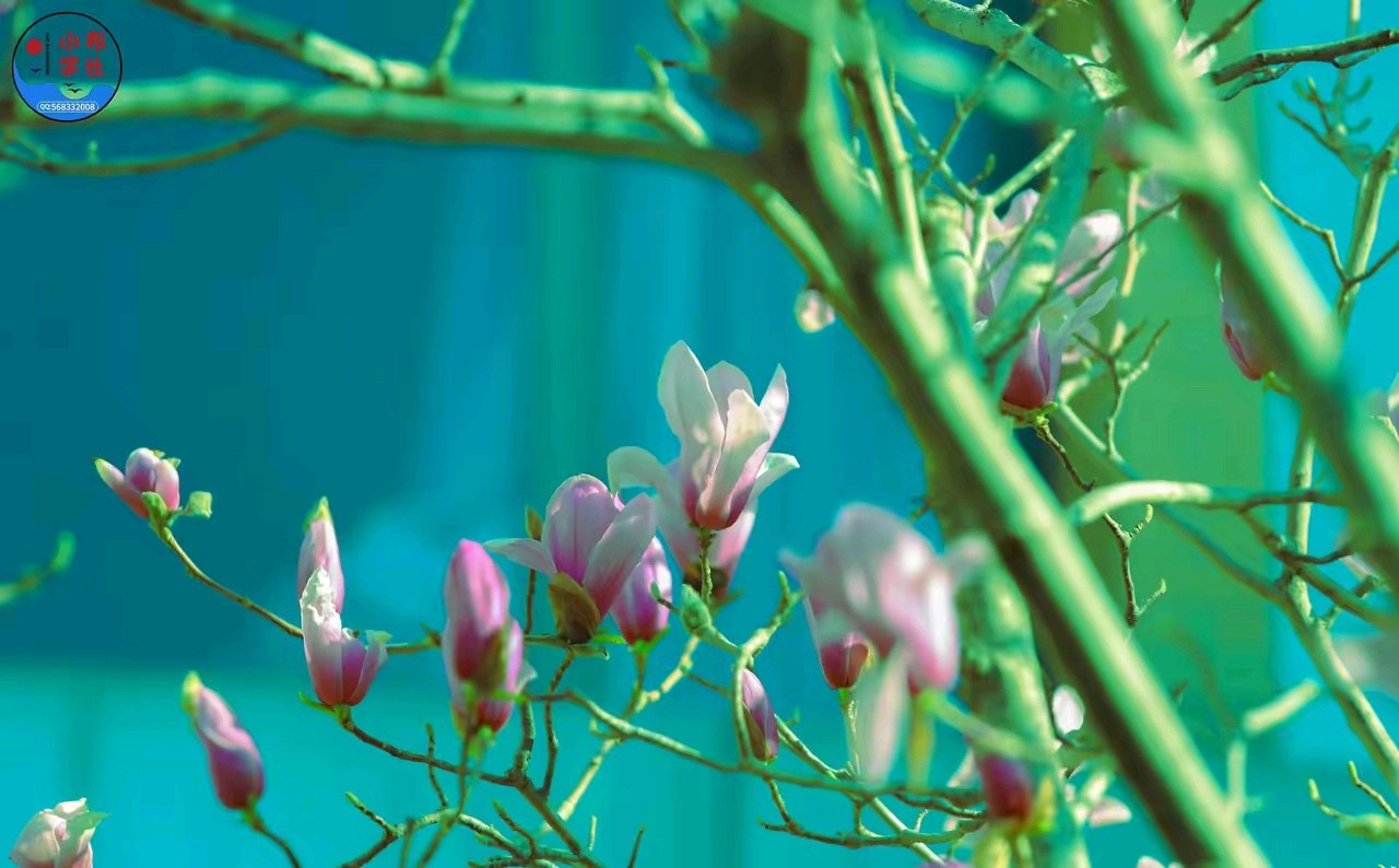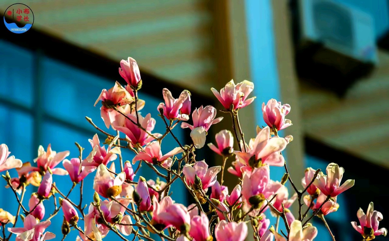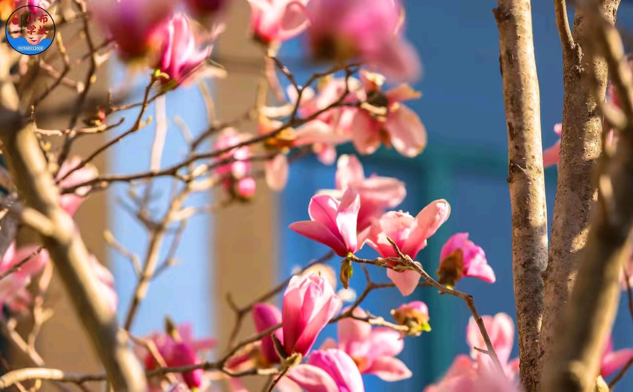 春日的阳光,透过粉嫩的玉兰花,风景很美。