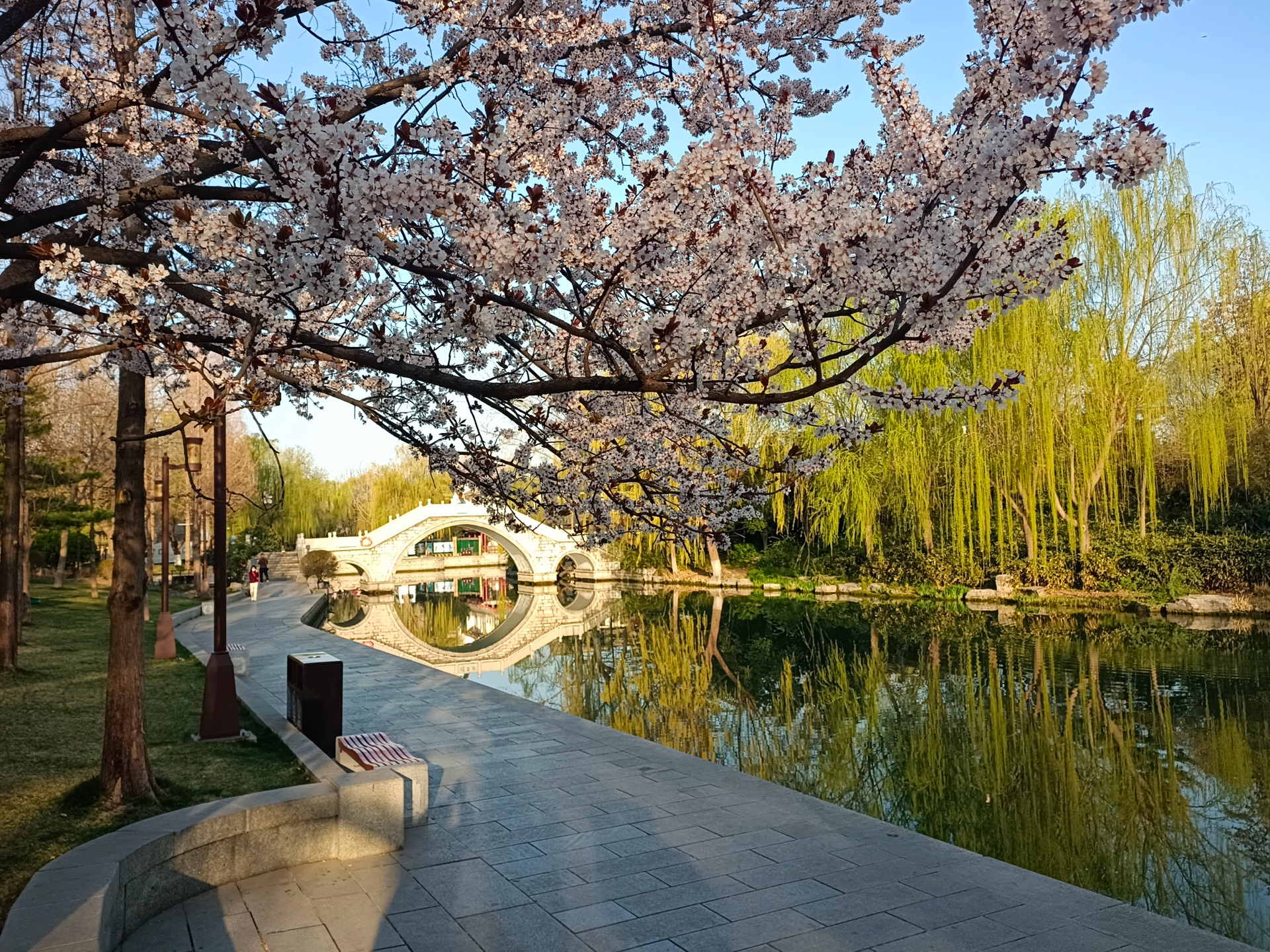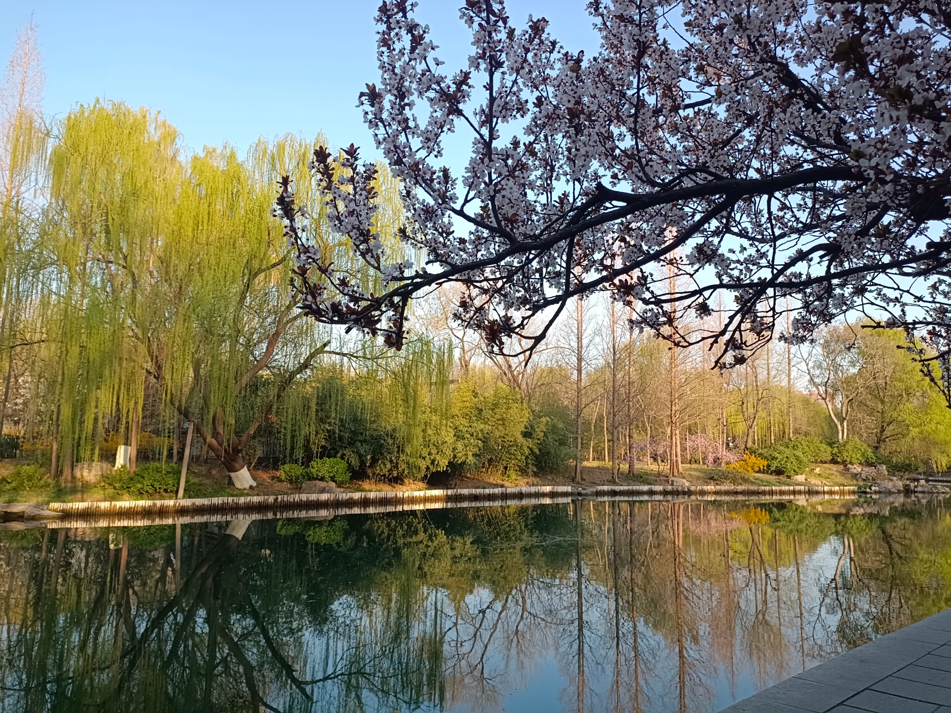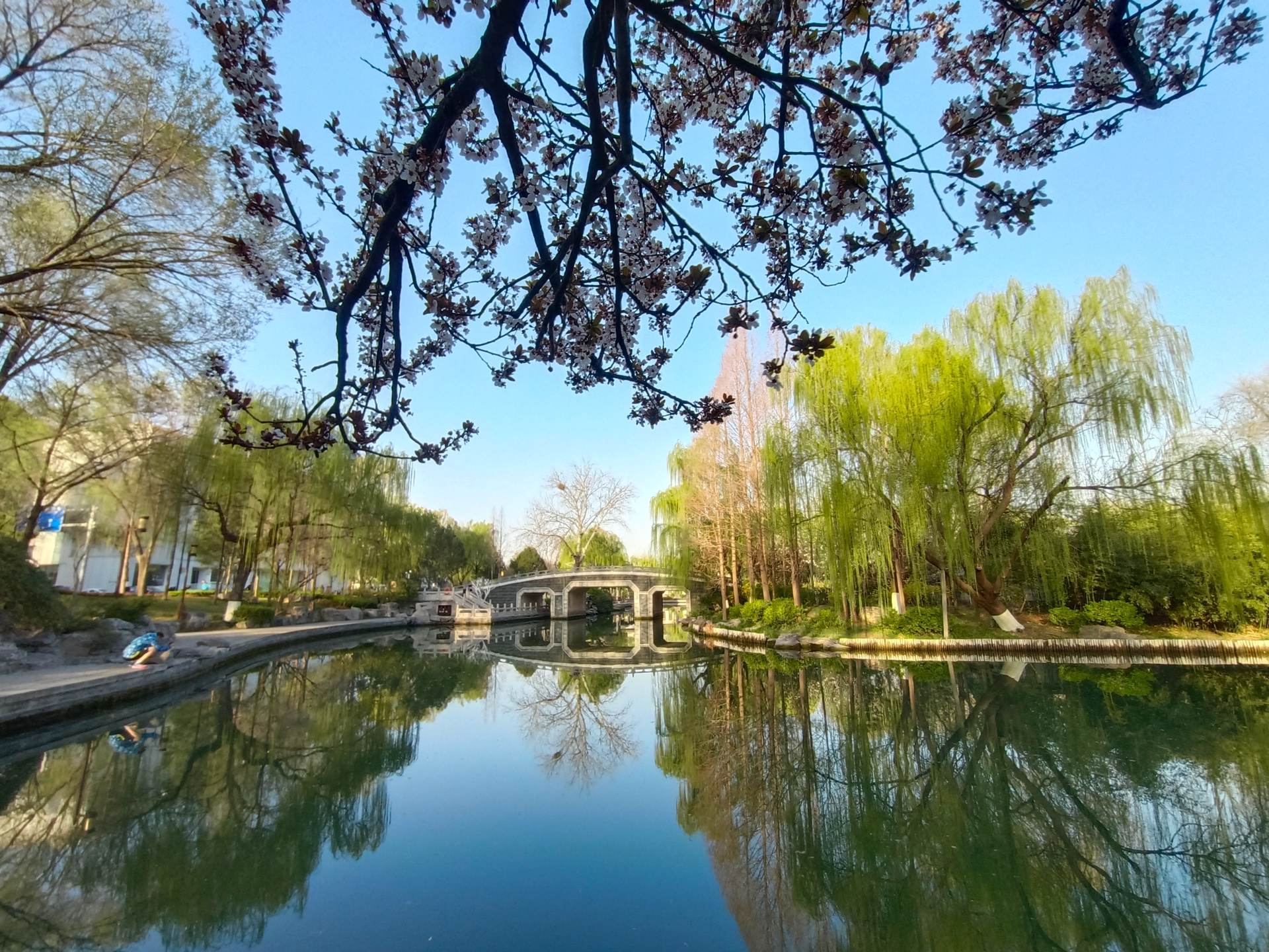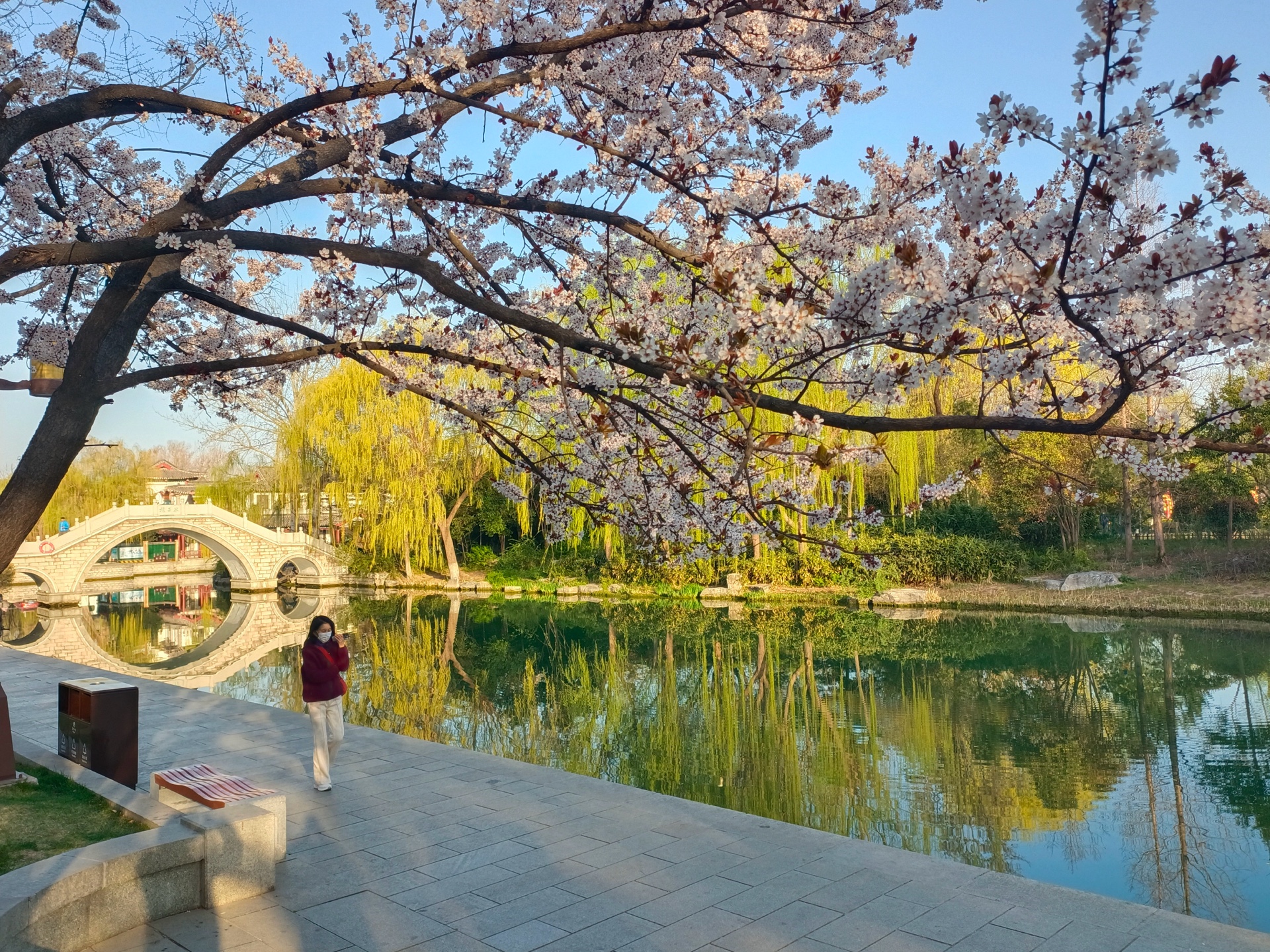 #我的春日赏花攻略#如果到济南旅游,三月和十月最该去的道路就是明湖路。三月下旬的明湖路万物复苏、百花盛开,蓝天下,黄色的连翘、嫩绿的柳枝、白色的杏花、红色的梅花在湖水的映衬下构成一幅优美的画面,真是人间仙境、美不胜收。拍摄于今早八点