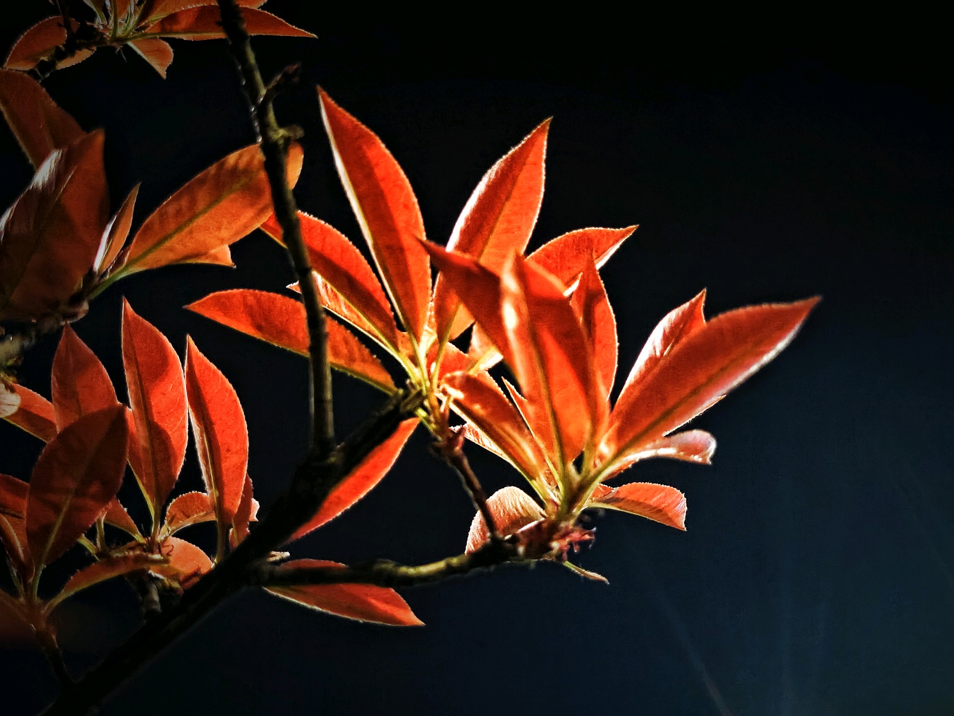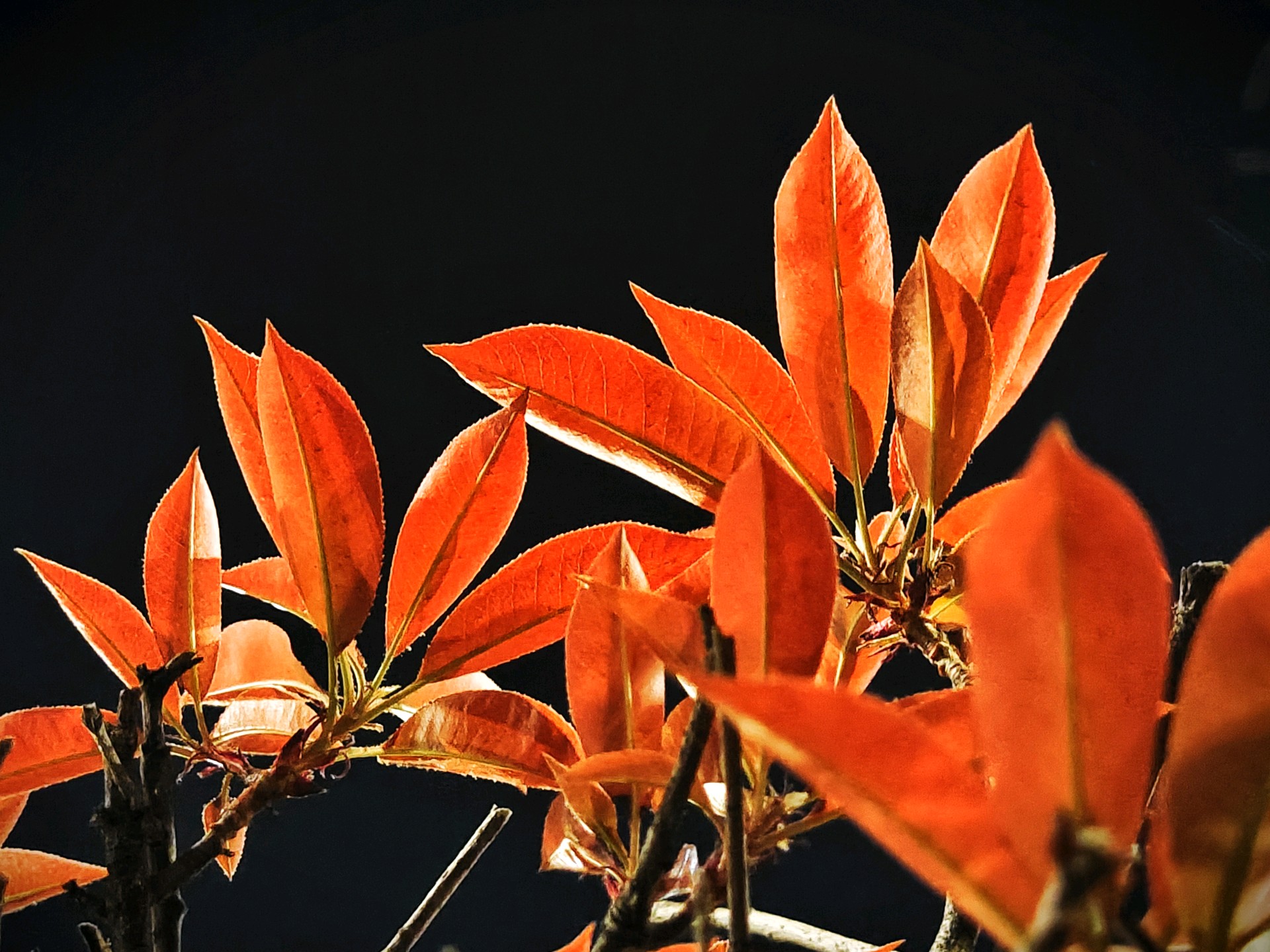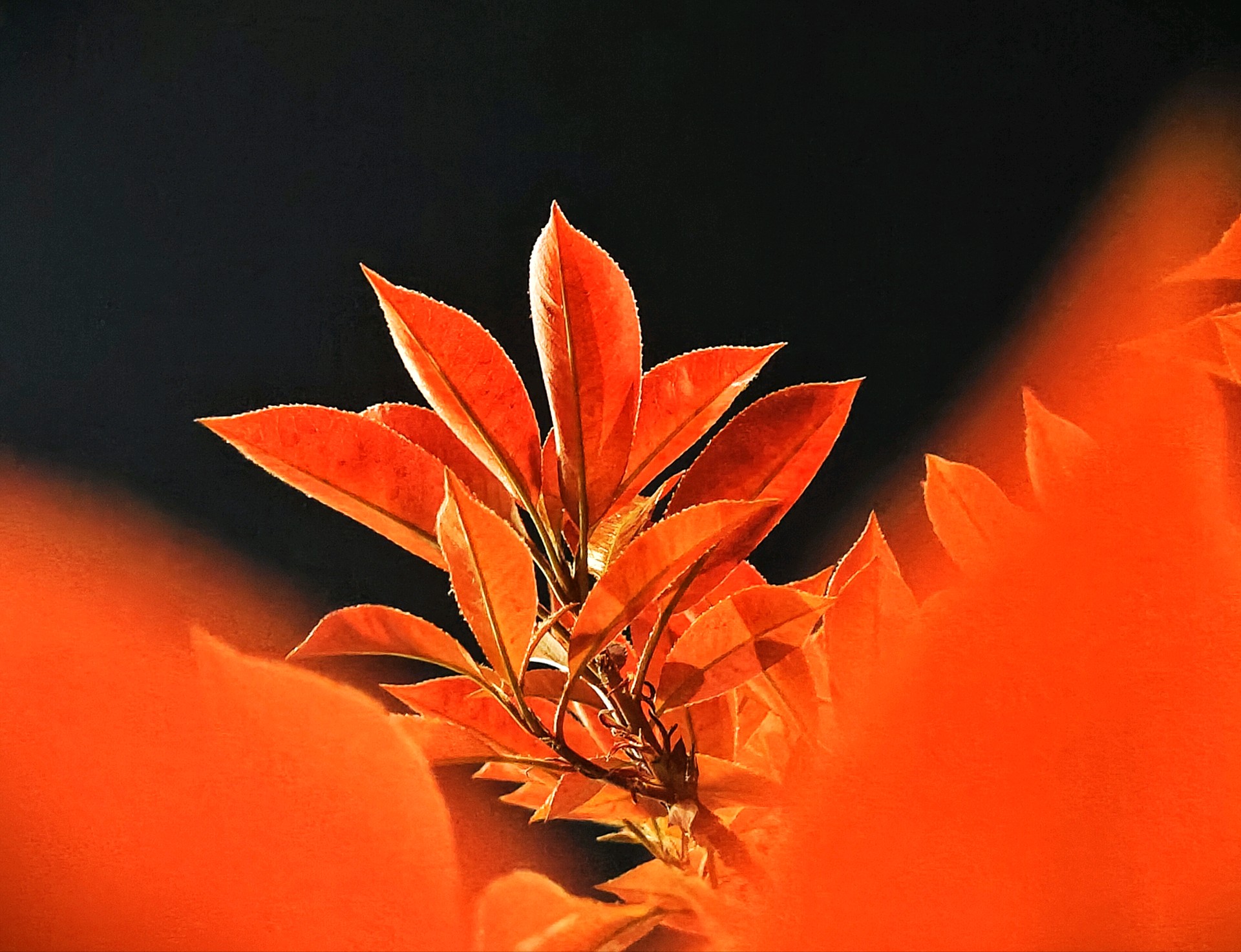 瞧,新长出的嫩叶颜色极为火红,宛如燃烧着的火焰,不但鲜艳夺目、充满生机,还增添了一道道亮丽的景色。