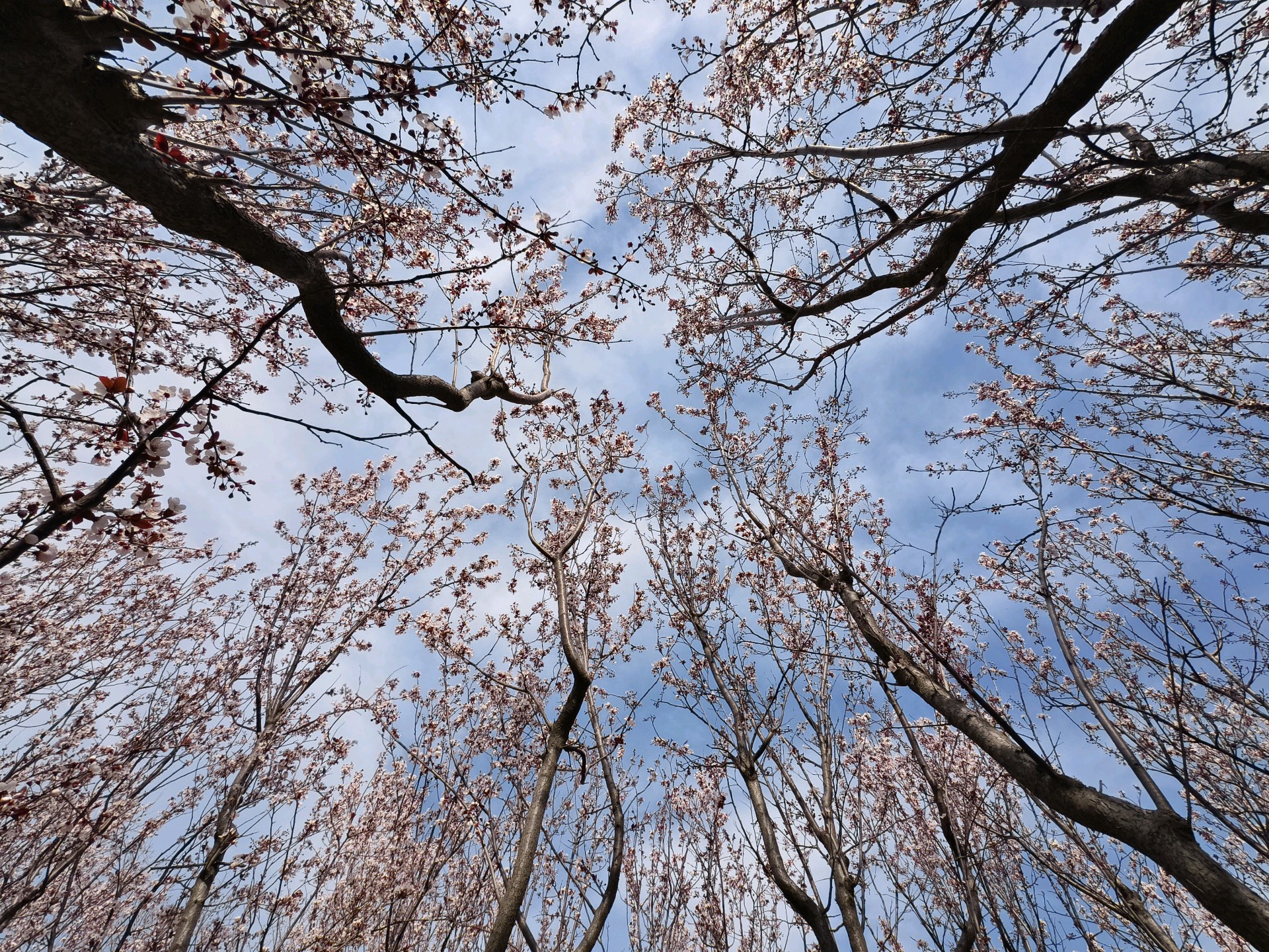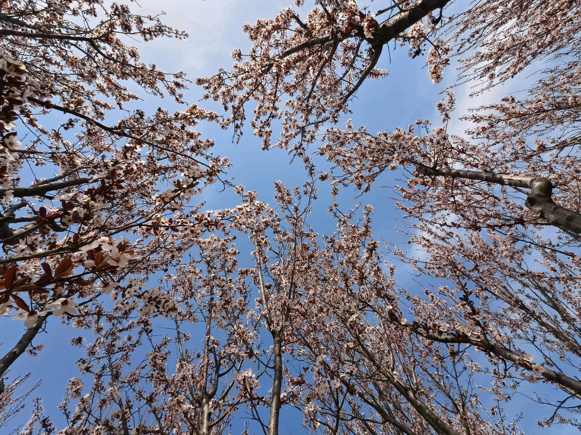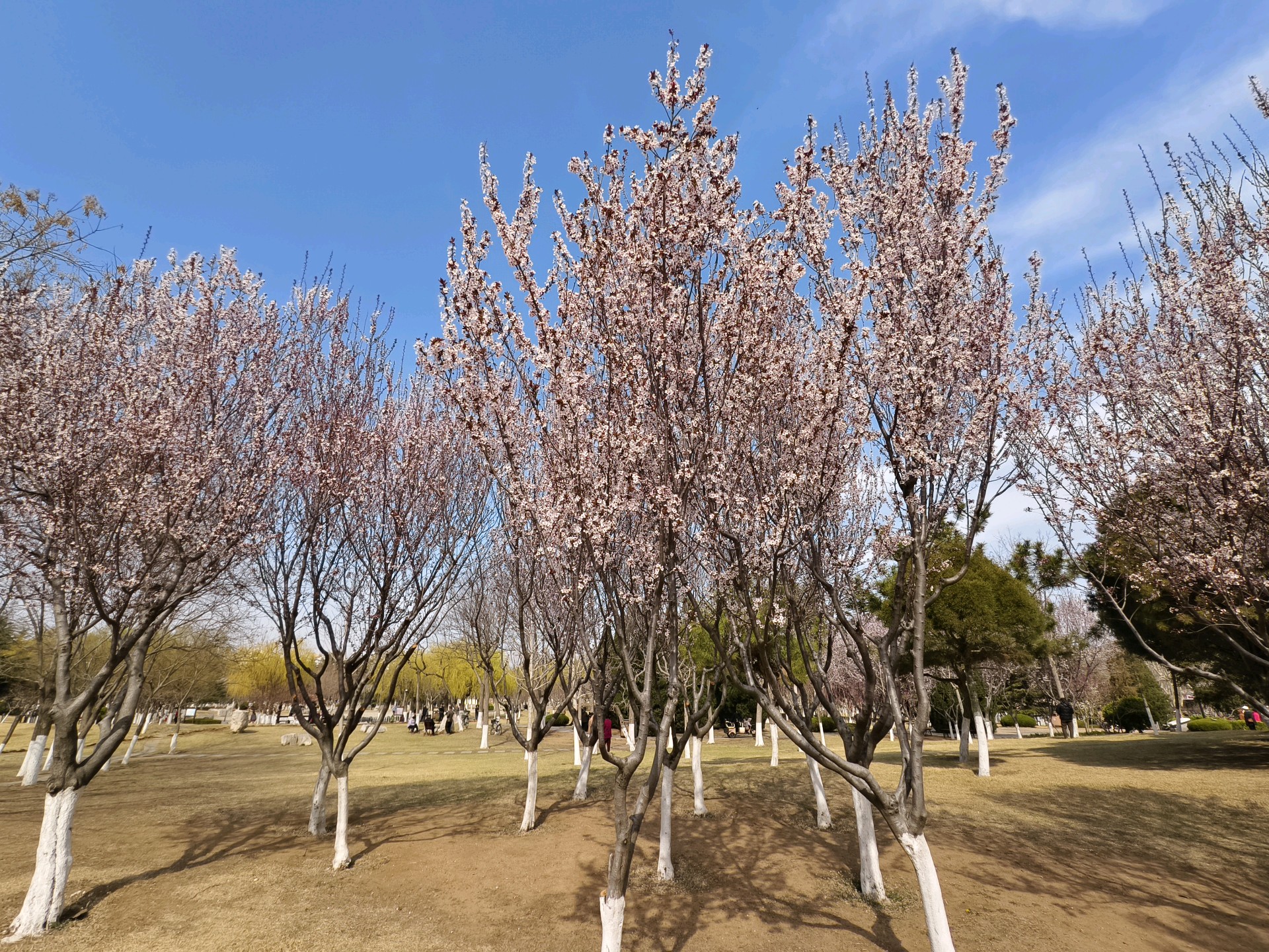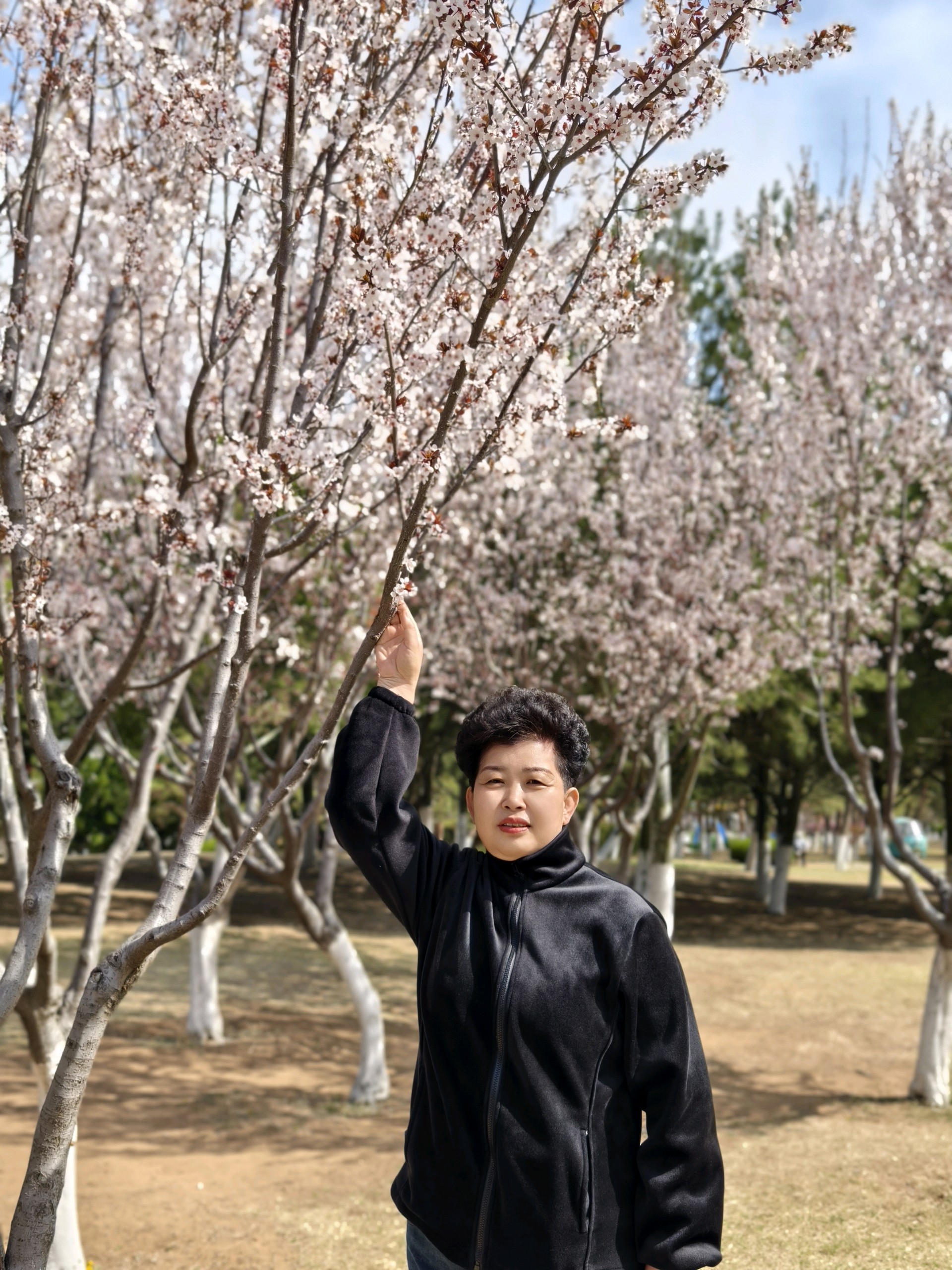 走进蓬莱黄海绿洲公园,发现紫叶李已经绽放。白色小花挂在高高的树上,貌似樱花,甚是好看。