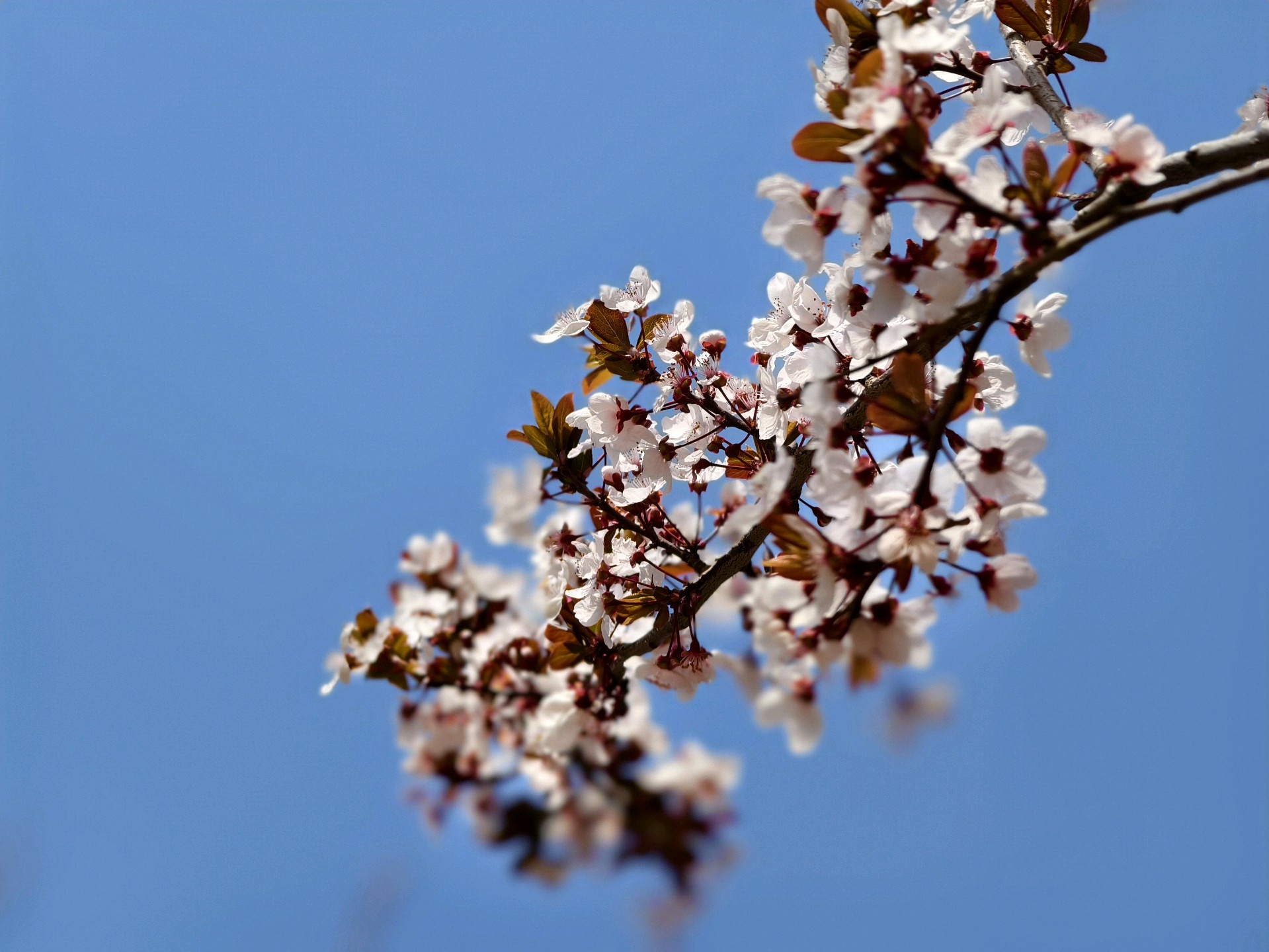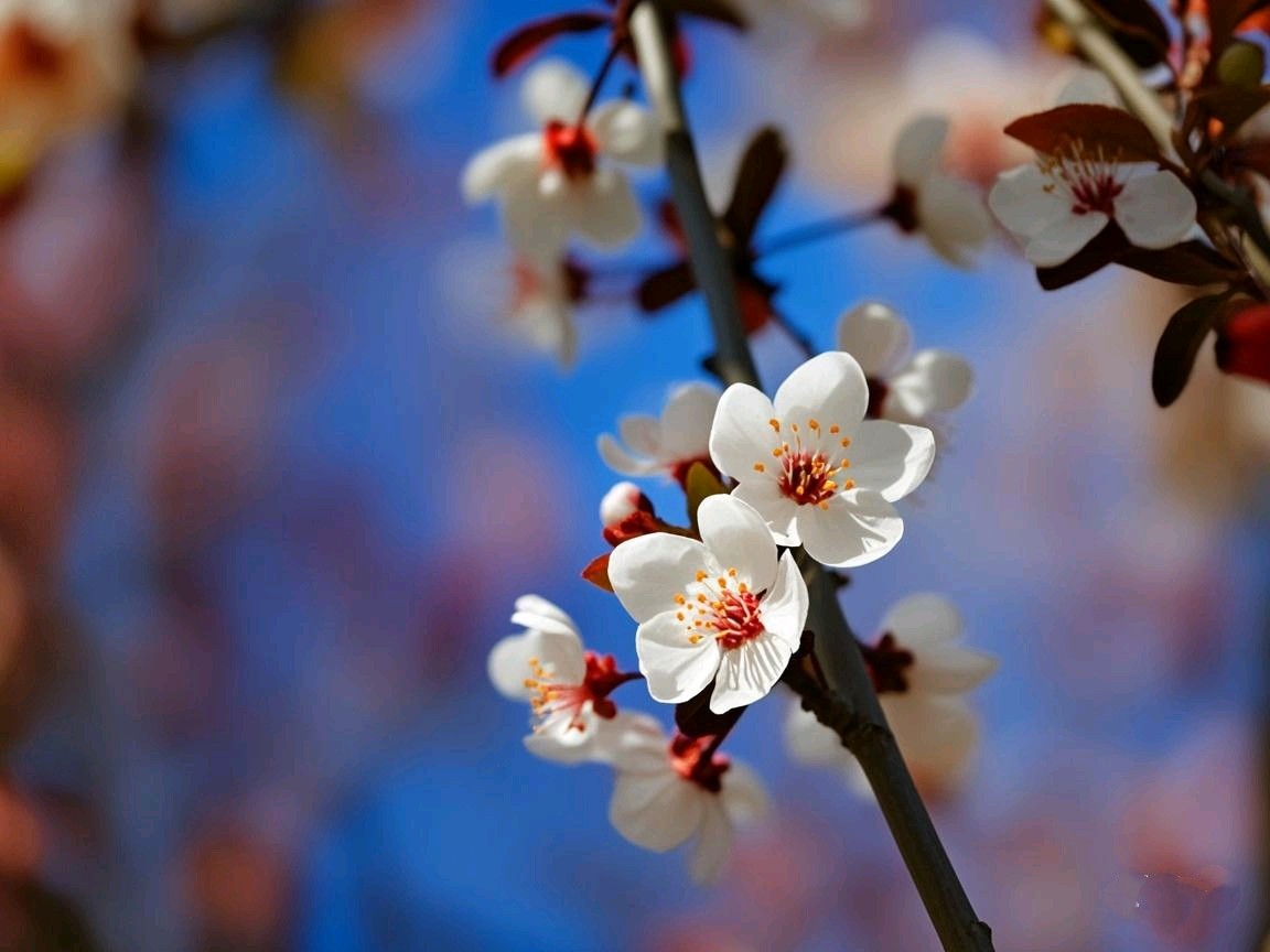 紫叶李为蔷薇科李属的落叶灌木或小乔木,以紫色叶片和白色花朵为特色,广泛用于园林绿化。拍摄于蓬莱