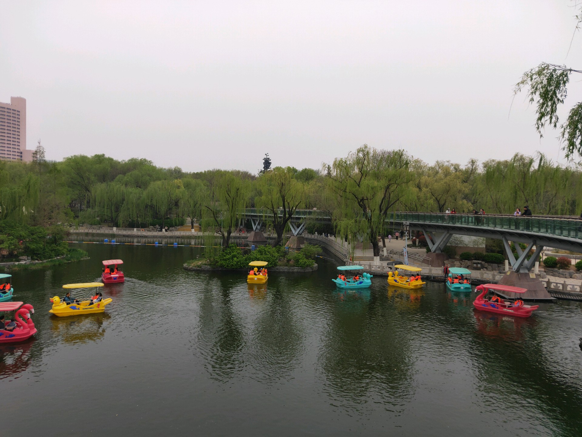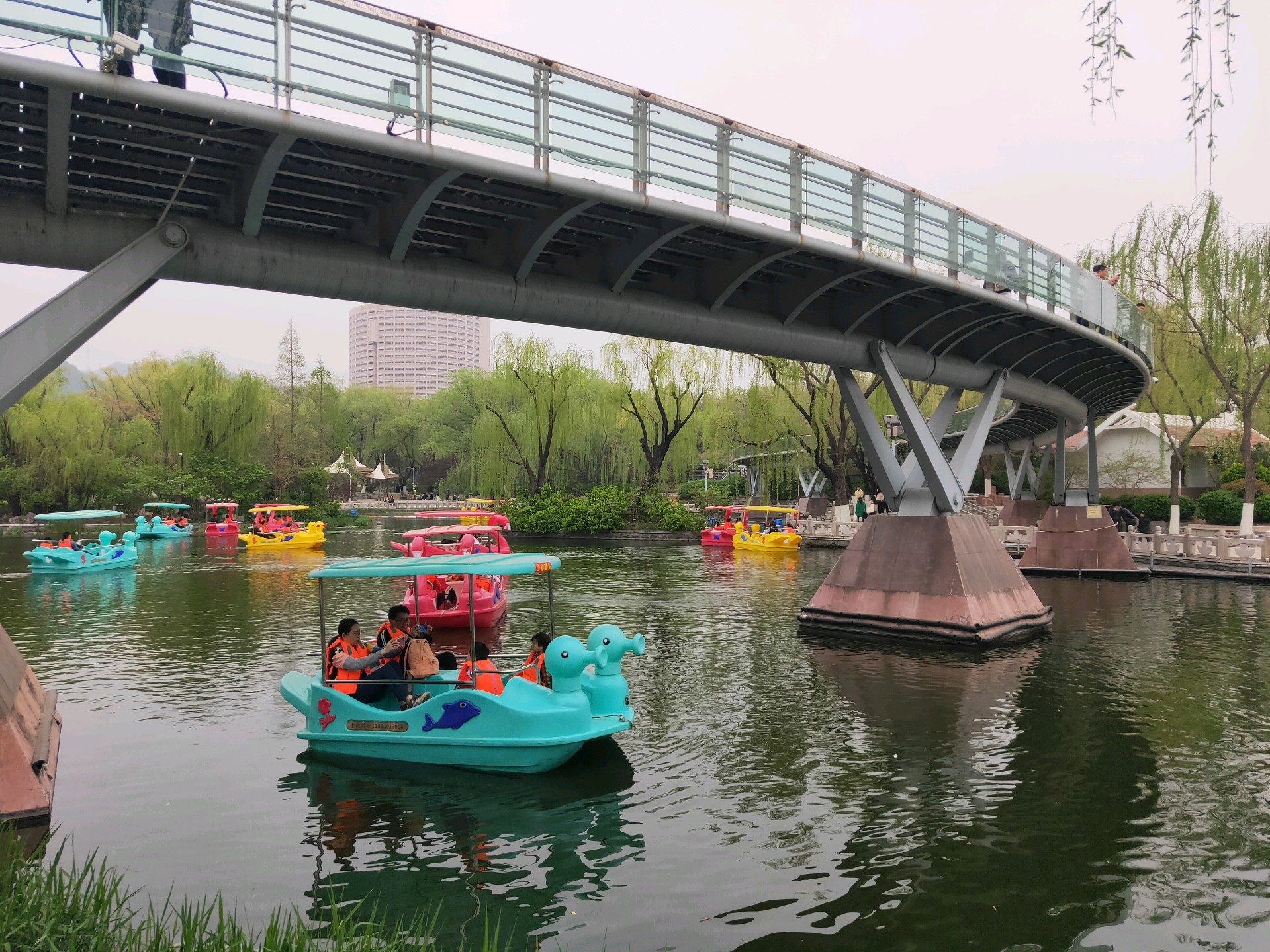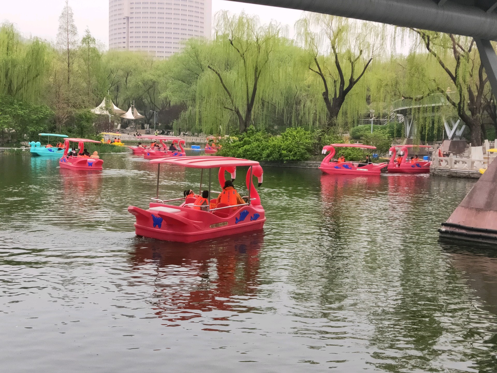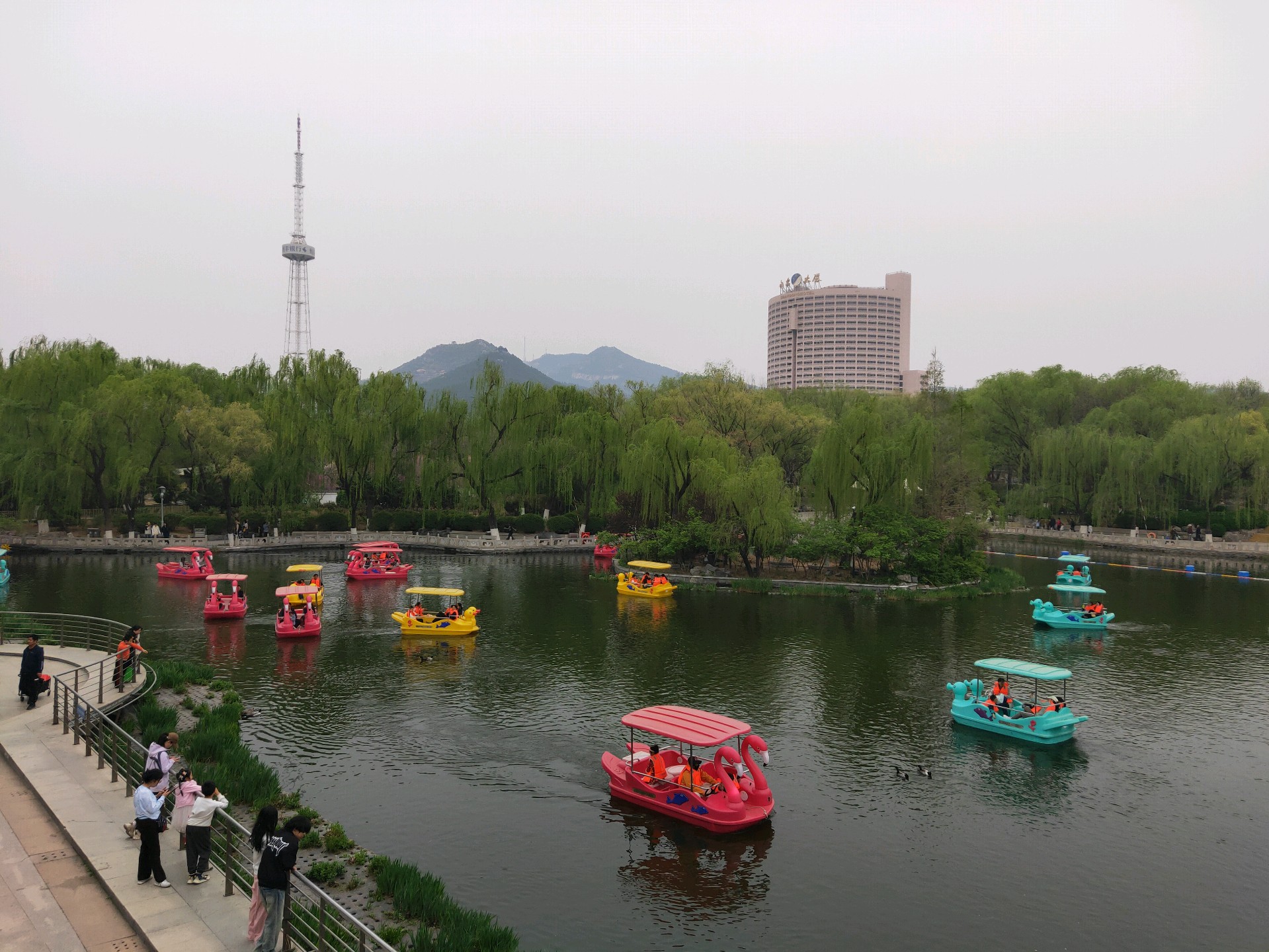 清明假期第一天,许多游客在泉城公园里的映日湖游玩,这些五颜六色的小游船为泉城公园增添一抹绚丽色彩