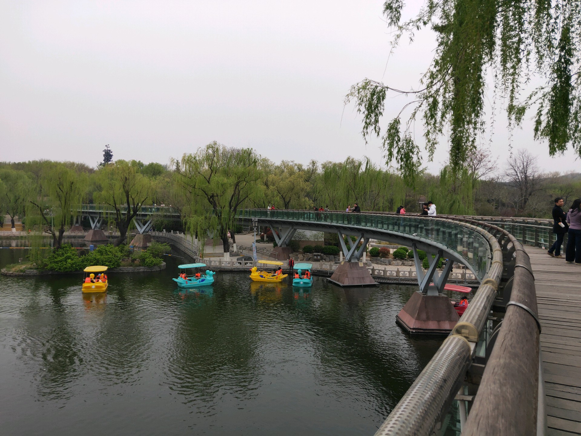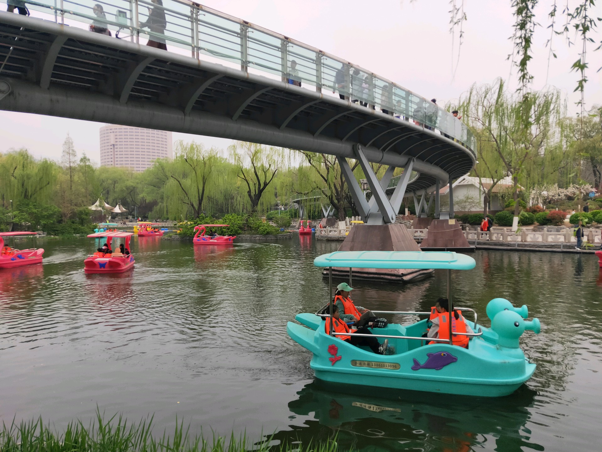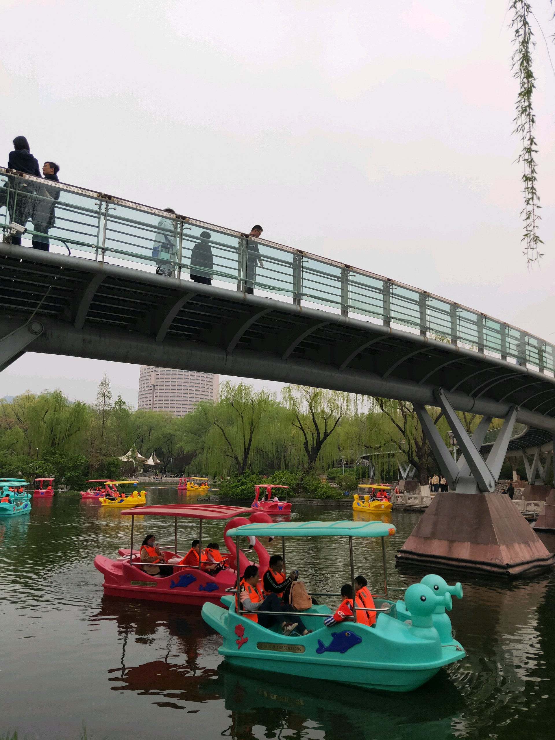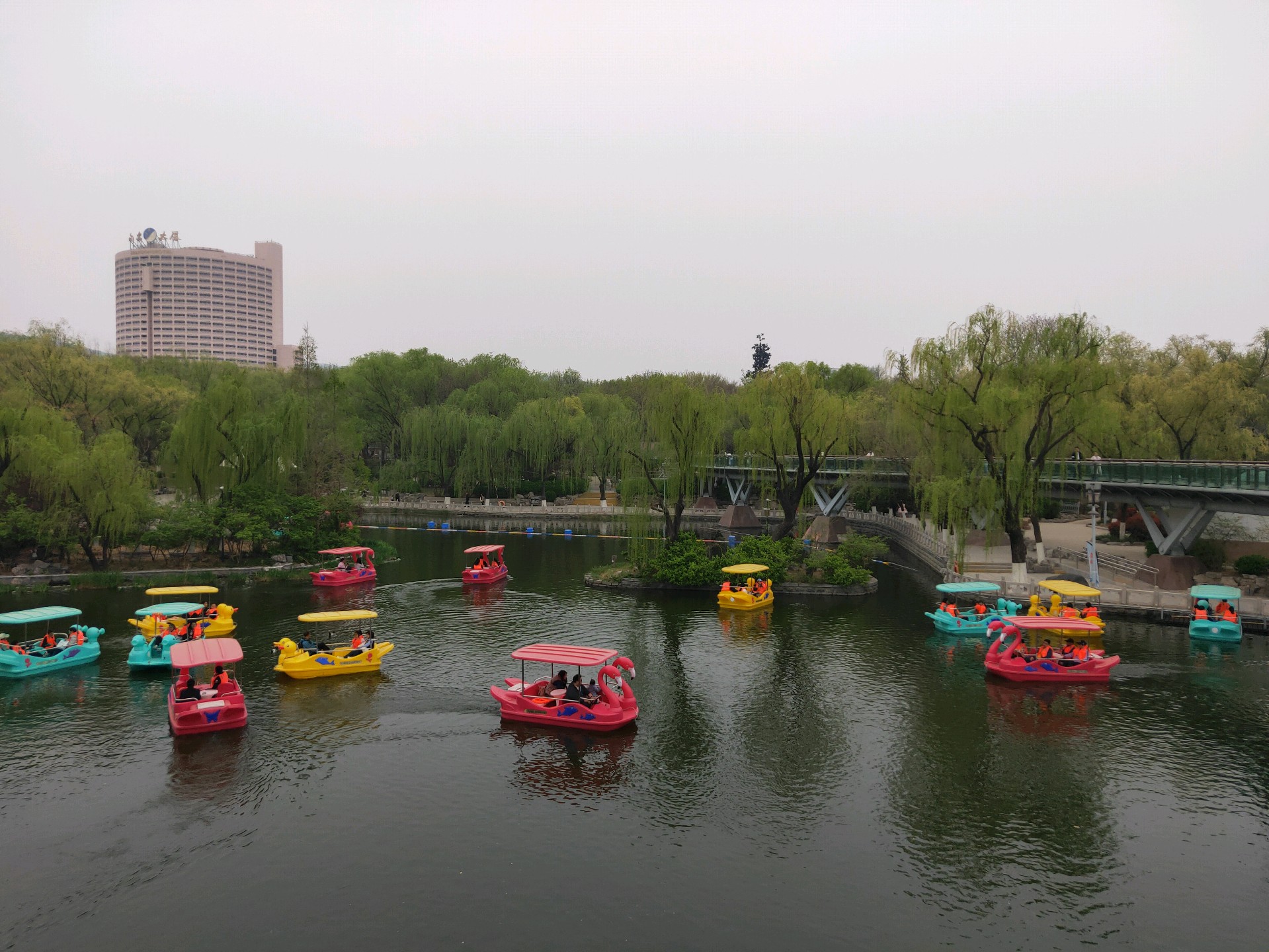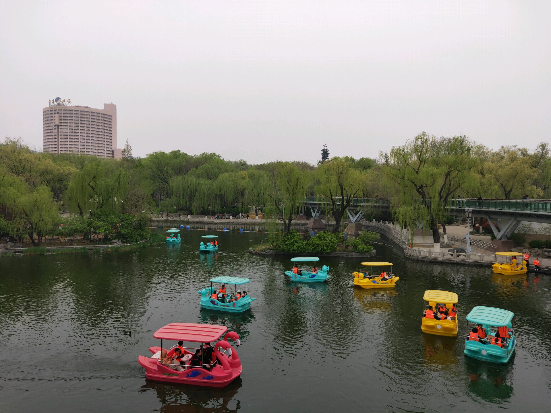 清明假期第一天,许多游客在泉城公园里的映日湖游玩,这些五颜六色的小游船为泉城公园增添一抹绚丽色彩