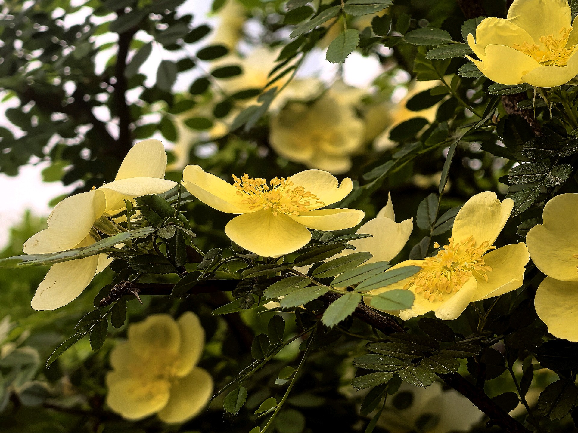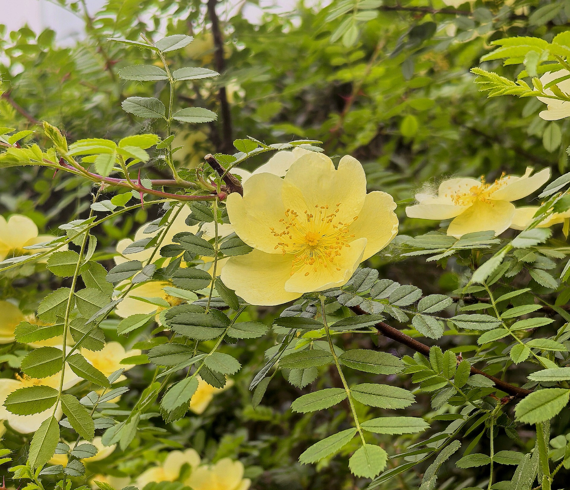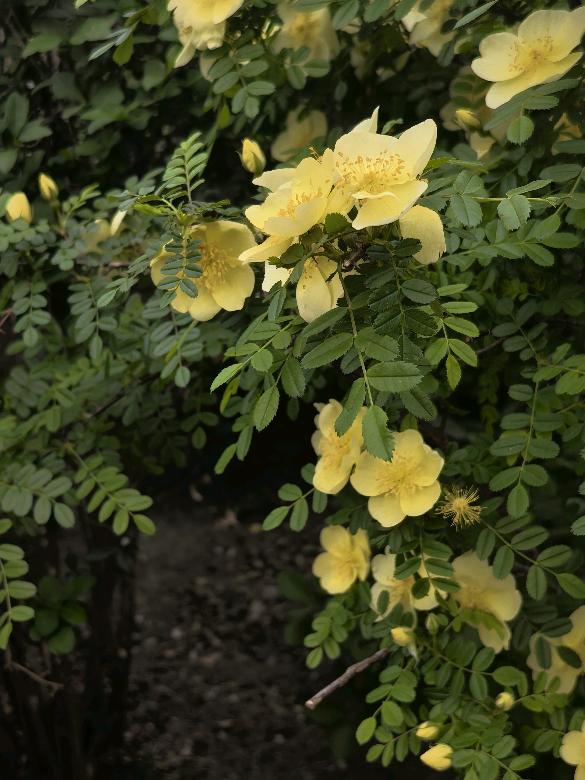 五龙潭公园的单瓣黄刺玫开花了。淡化色的花朵格外艳丽游客们纷纷拍照留念。