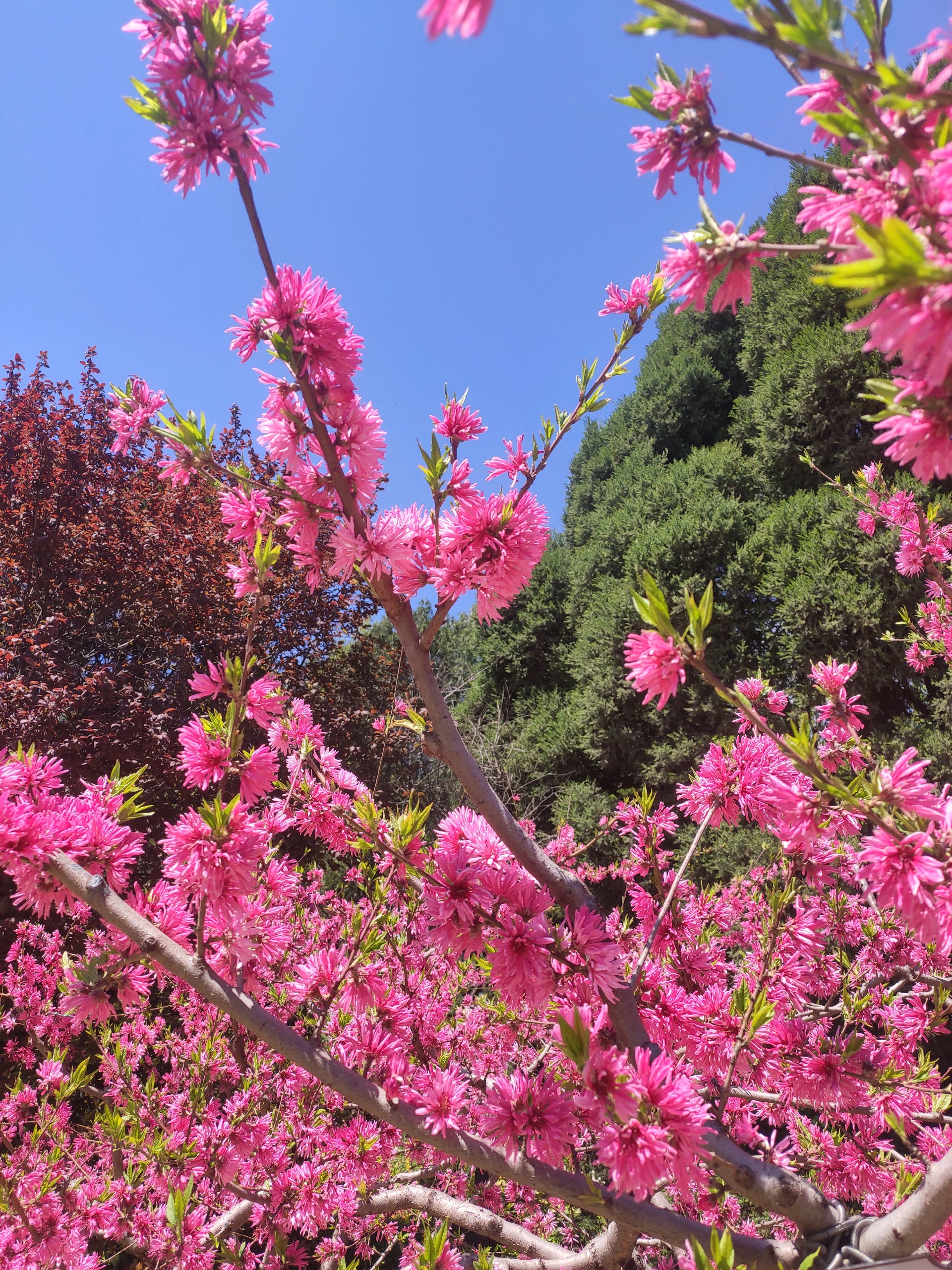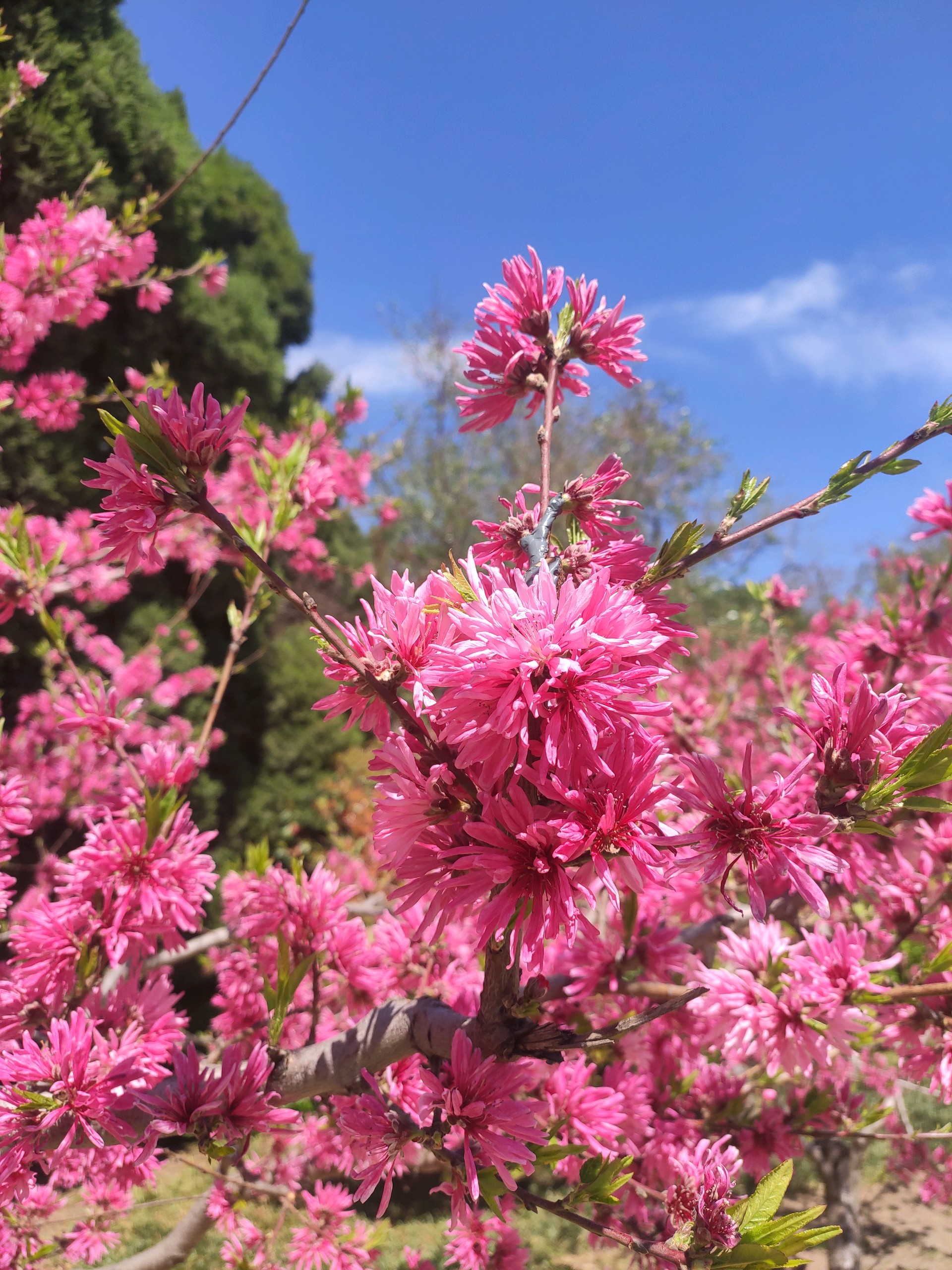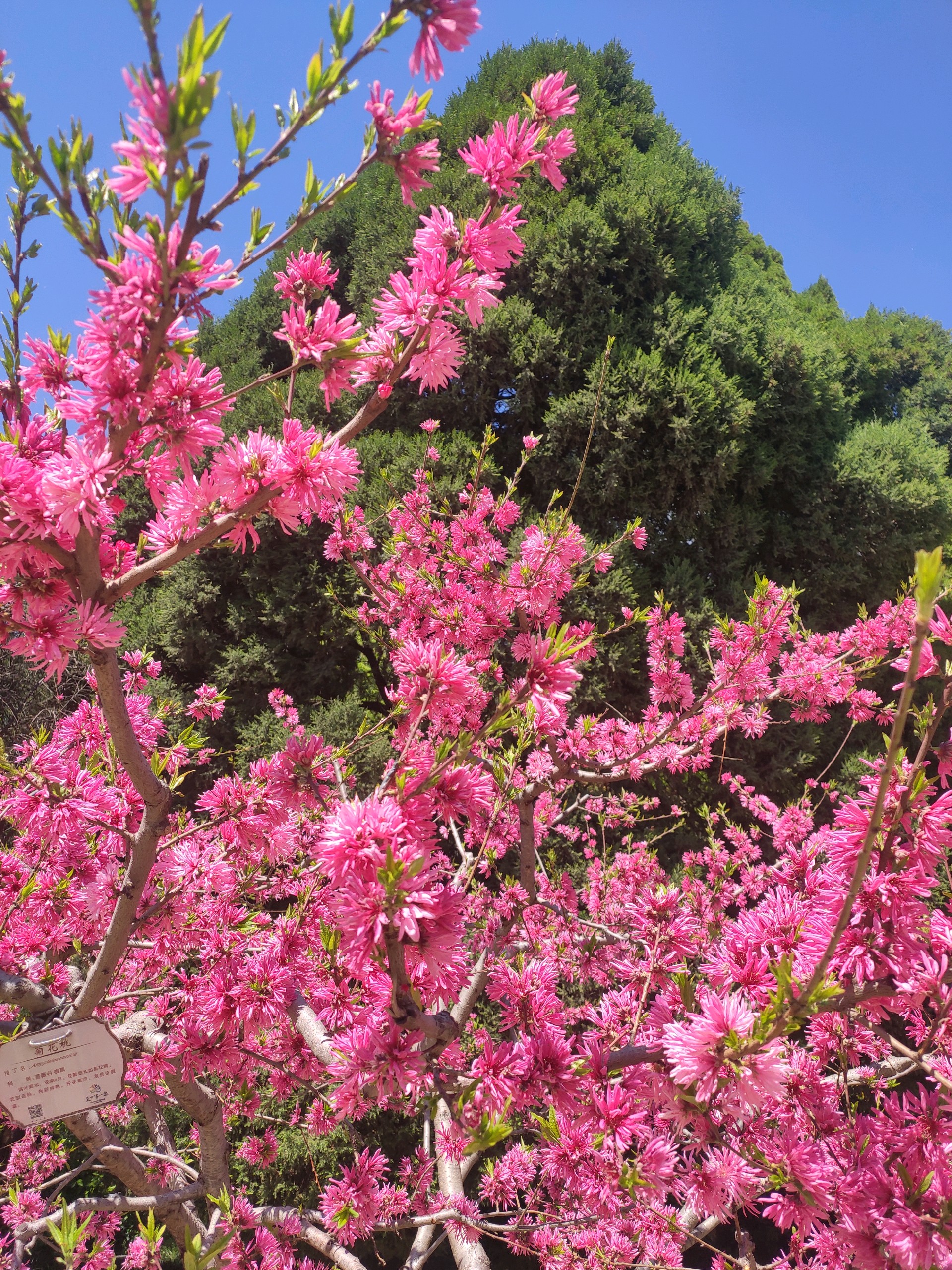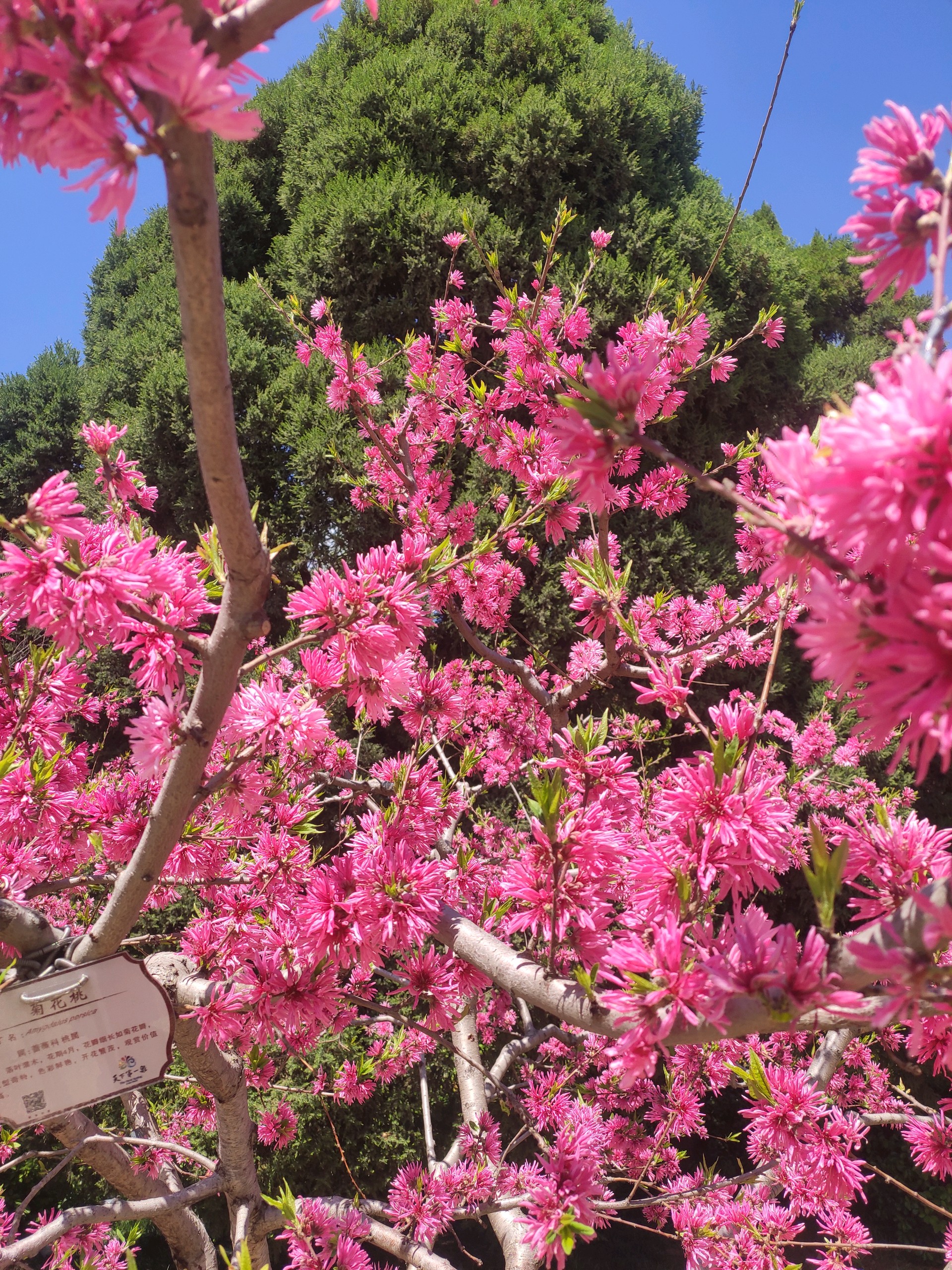 是桃树,却长的象菊花,粉嫩的颜色,满树的花朵,被蓝天衬托着更加美艳动人。