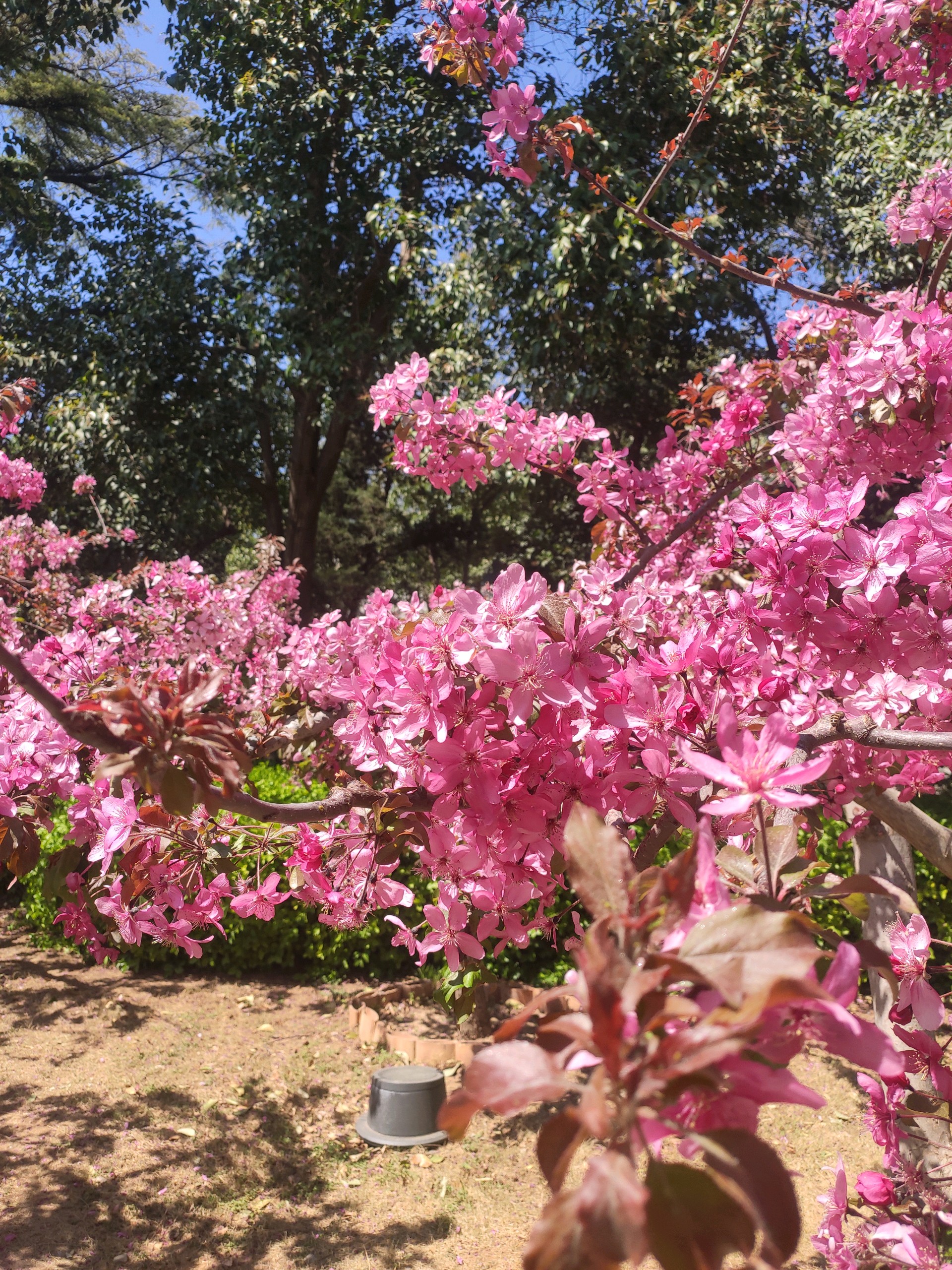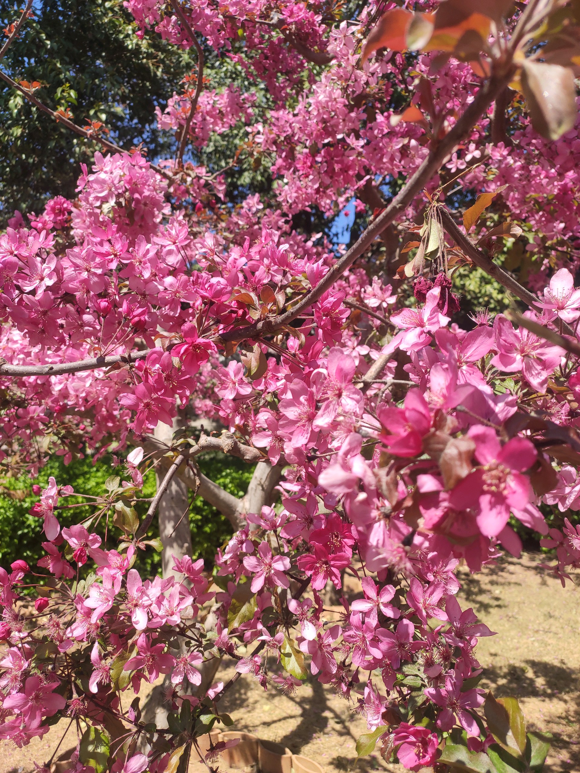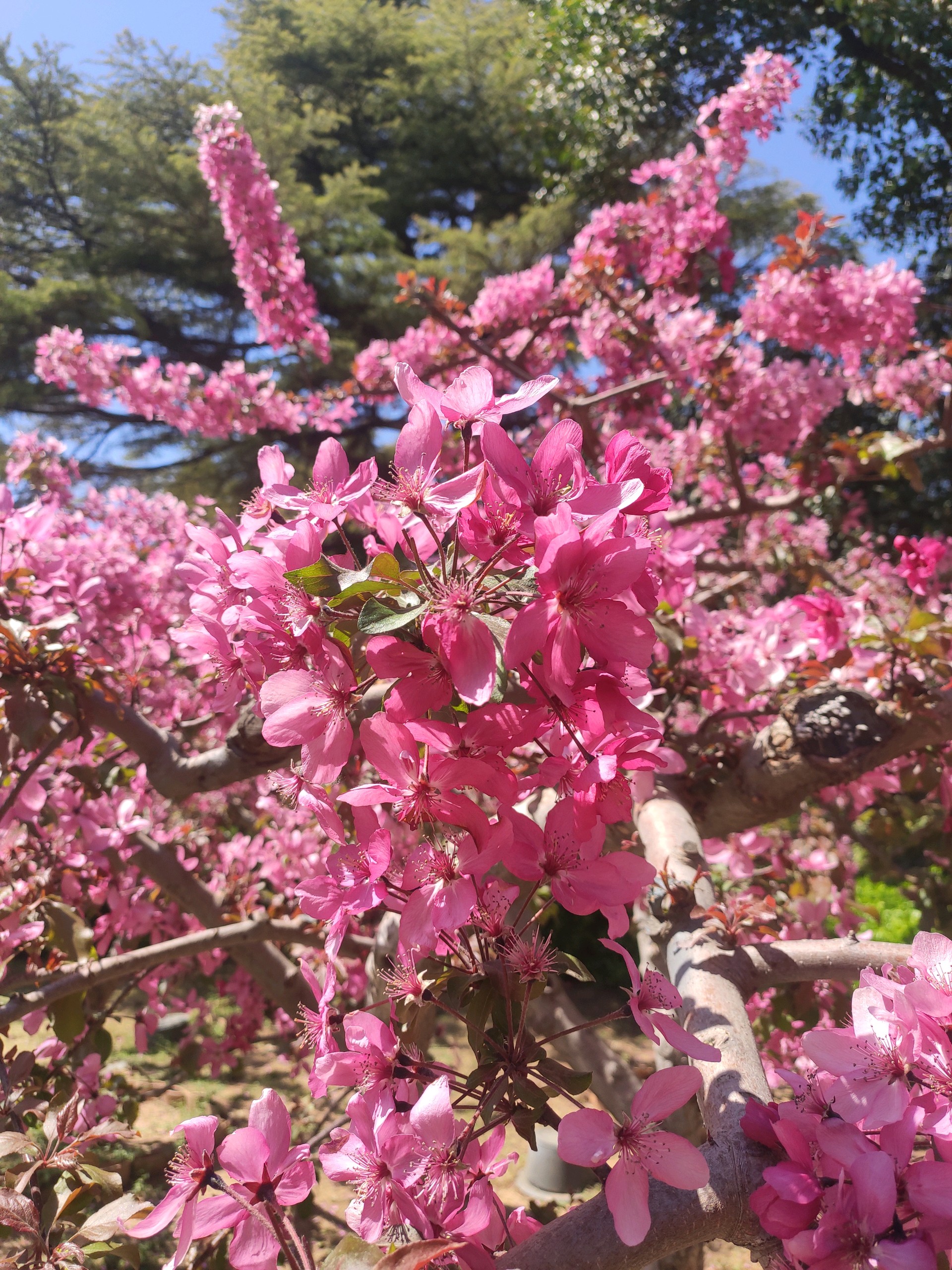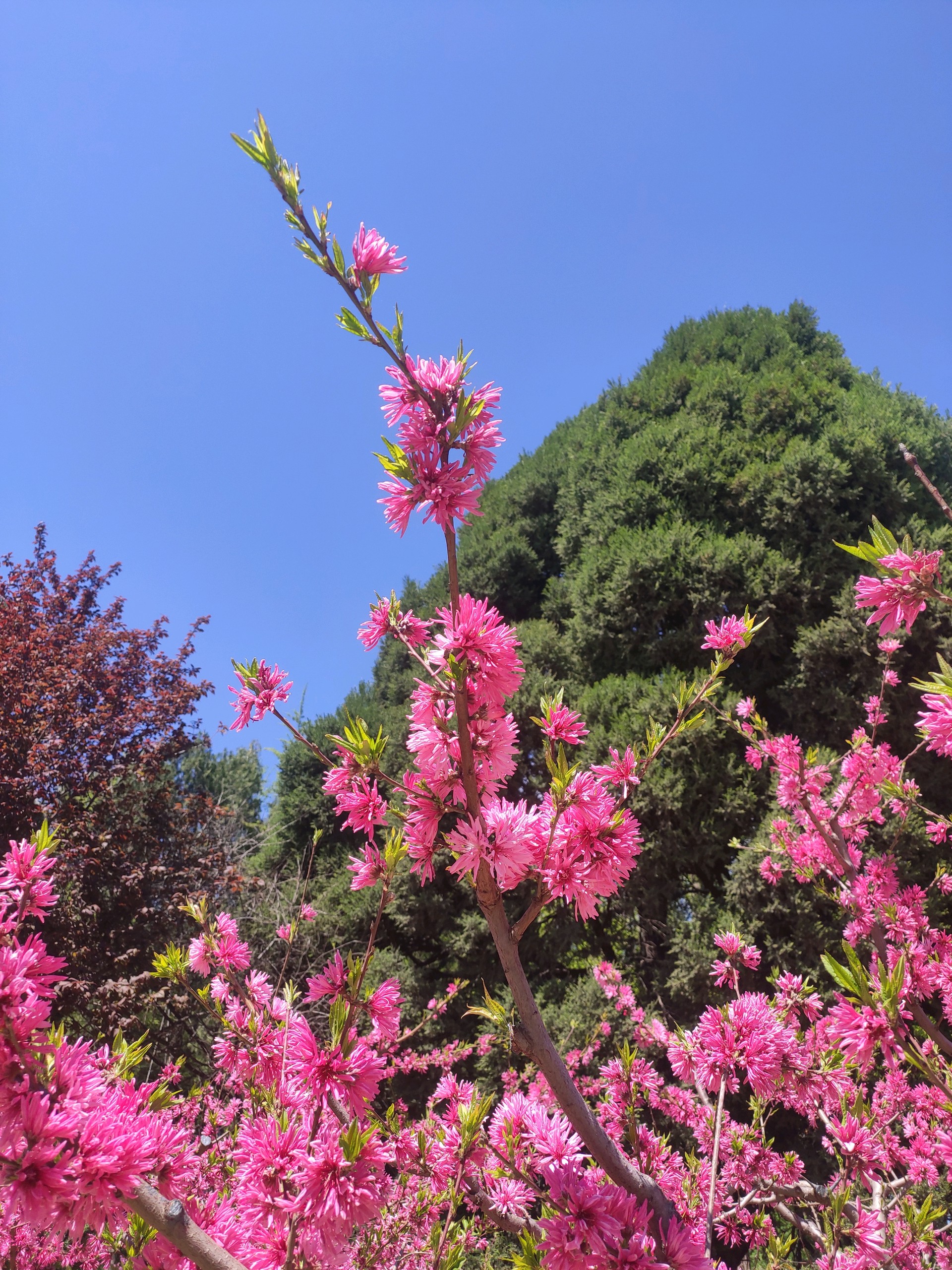 是桃树,却长的象菊花,粉嫩的颜色,满树的花朵,被蓝天衬托着更加美艳动人。
