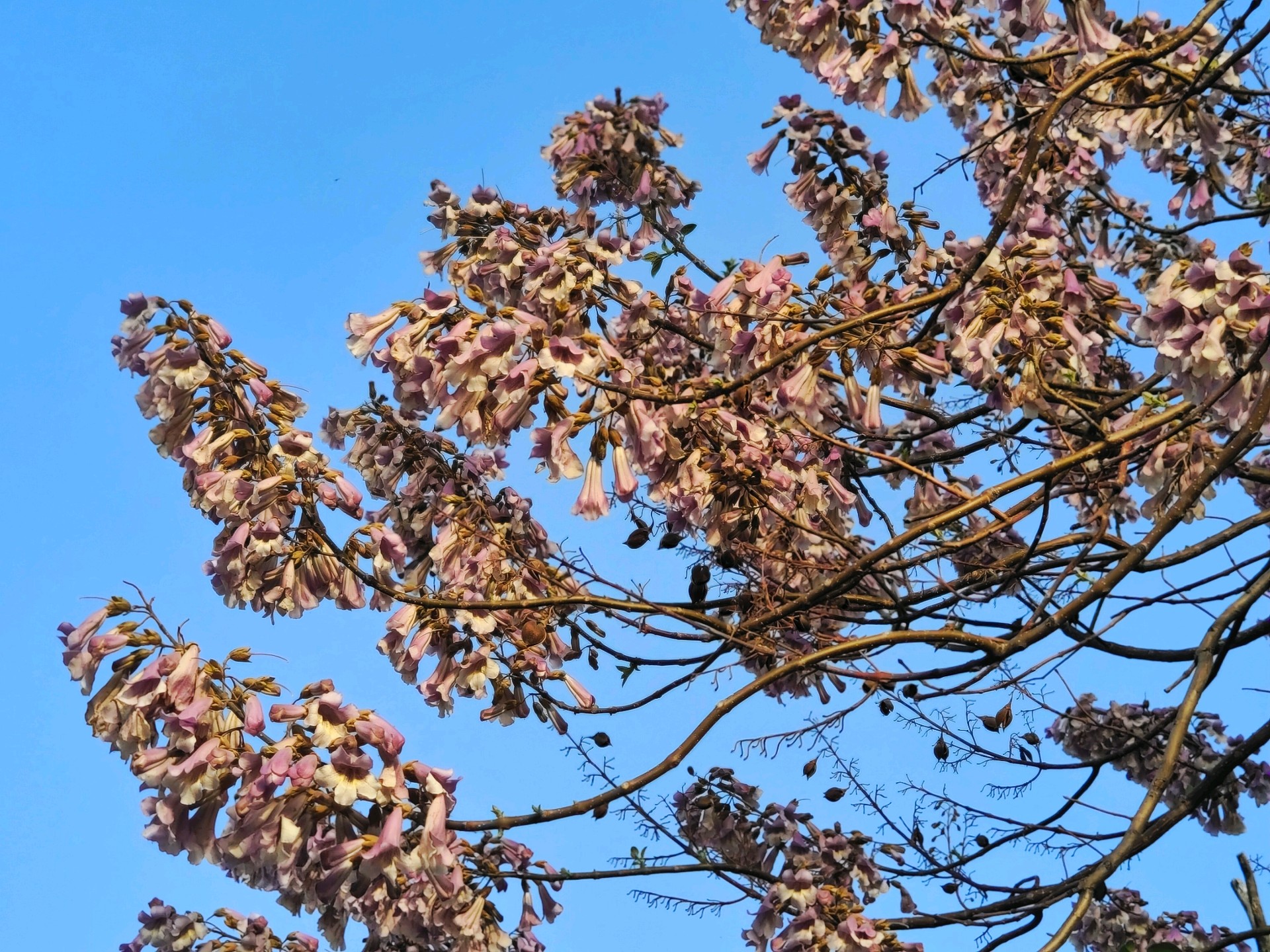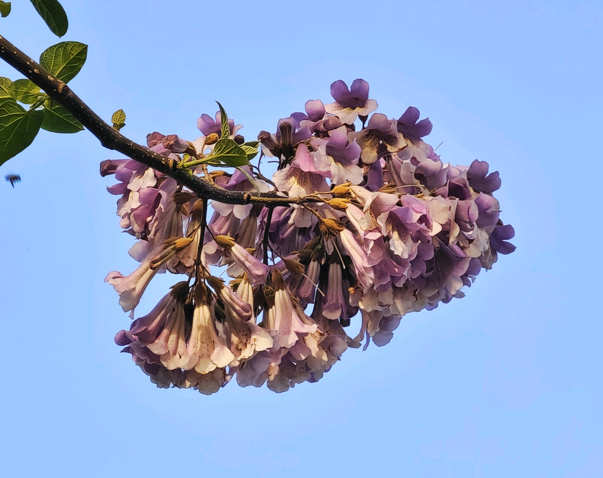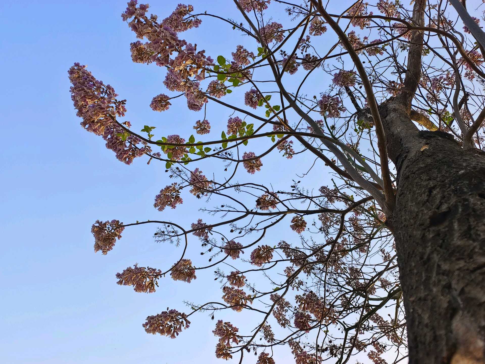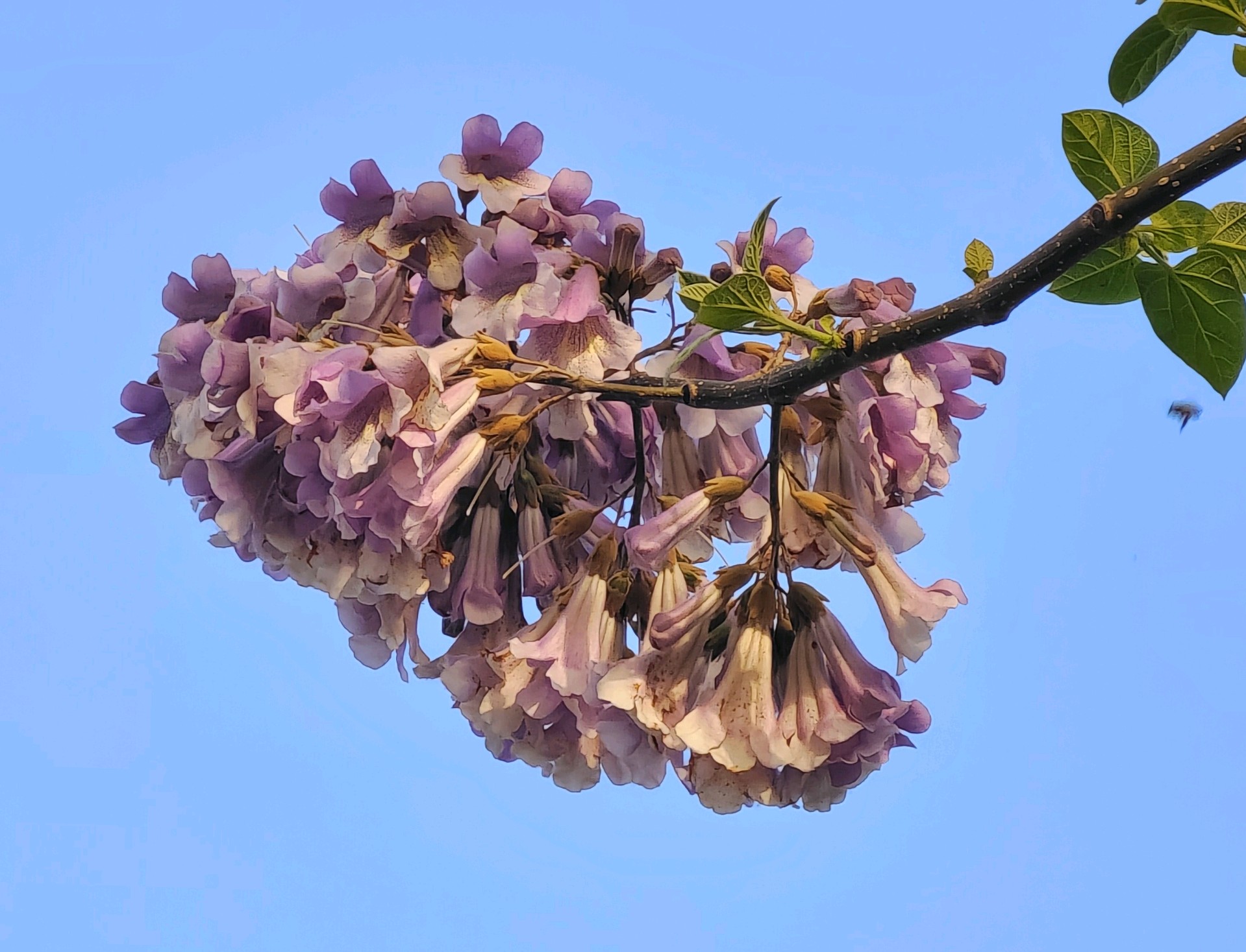 紫色花形如风铃 一串串挂在枝头4月16日,在沂河岸边广场的梧桐树已被繁花覆盖,开出了一串串形如风铃的花朵。梧桐花儿颜色淡雅,白中带紫,紫里镶白。阵阵微风吹过,浓郁的香气,香飘沂河岸边。梧桐花儿不仅美丽耀眼夺目,而且魅力无穷无尽,如果看上一眼就心生欢喜,陶醉在美与香之中。(高军摄影)