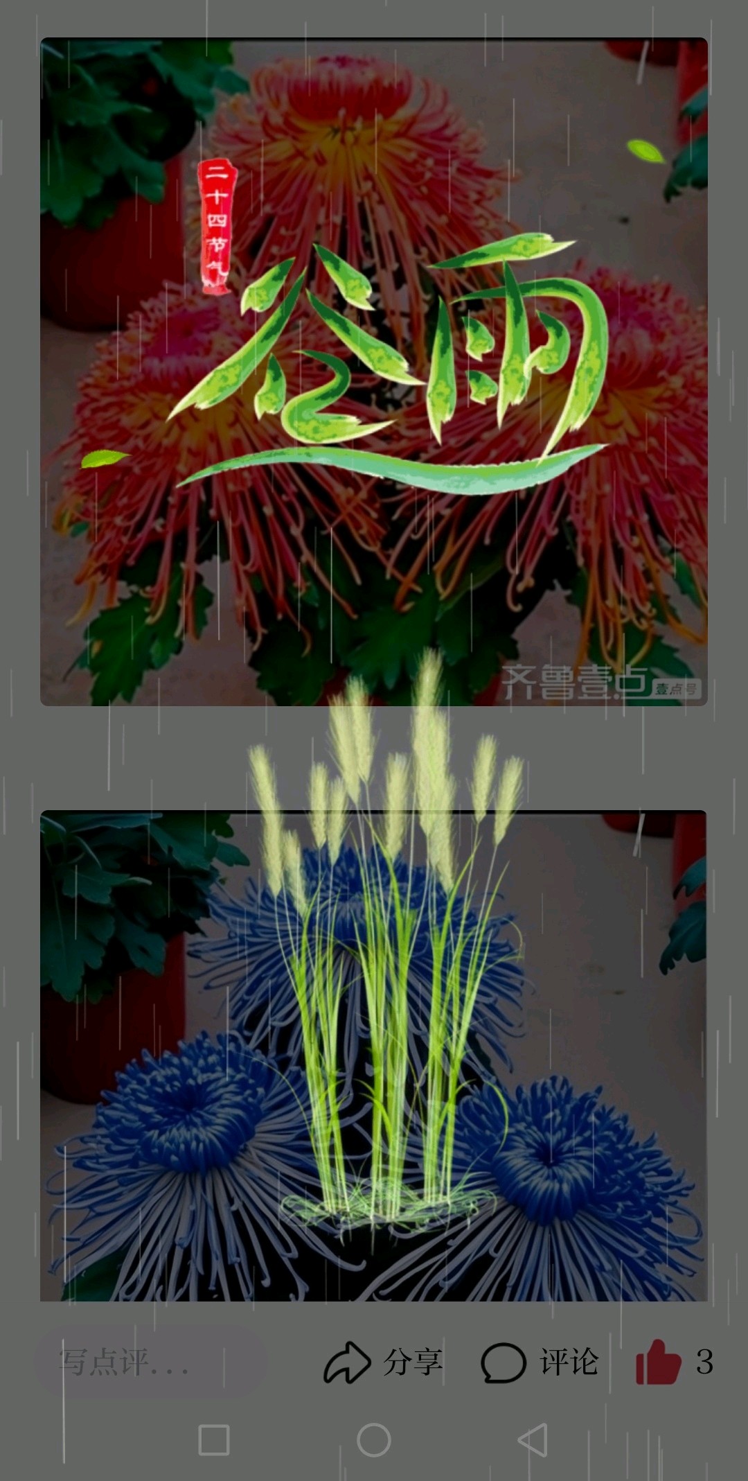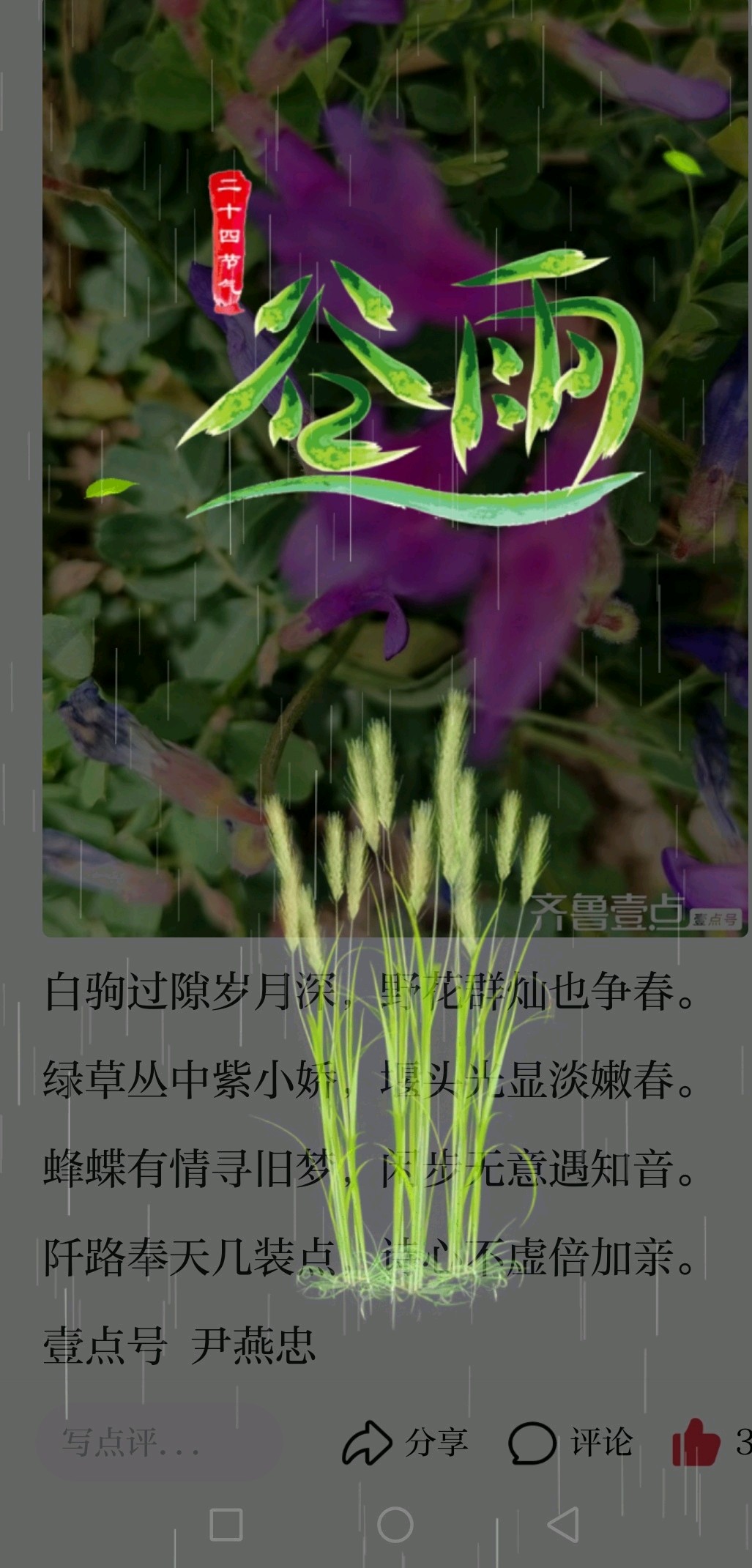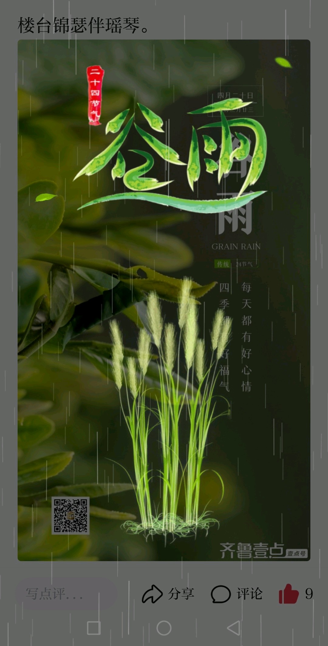 谷雨取自“雨生百谷”之意,此时降水明显增加,田中的秧苗初插、作物新种,最需要雨水的滋润,降雨量充足而及时,谷类作物能茁壮成长。谷雨与雨水、小满、小雪、大雪等节气一样,都是反映降水现象的节气,是古代农耕文化对于节令的反映。