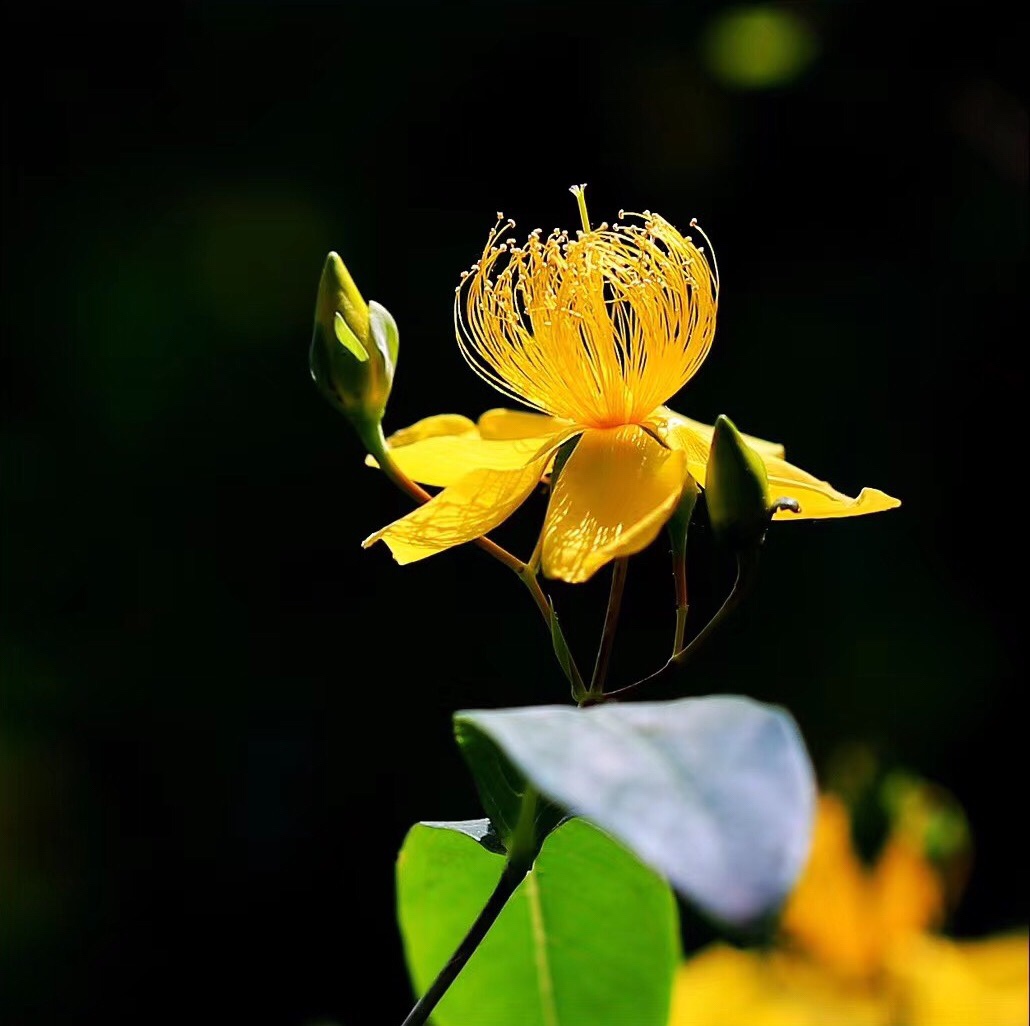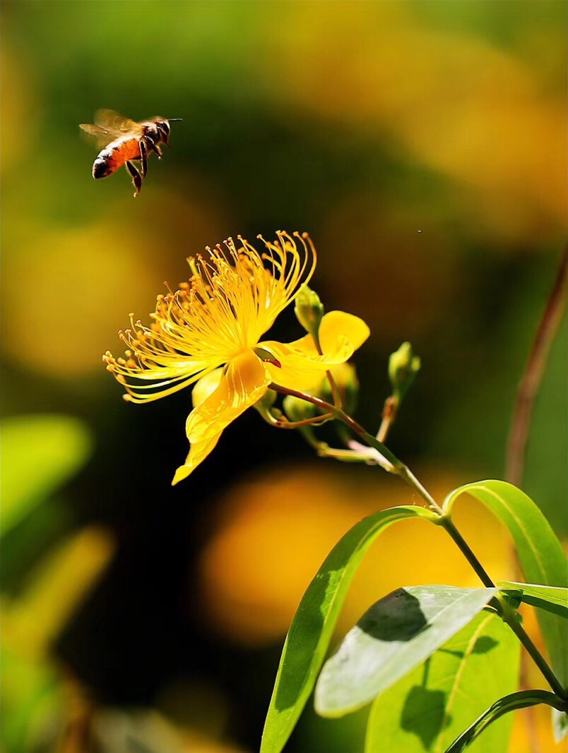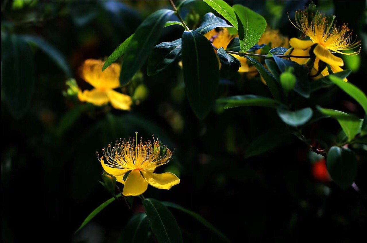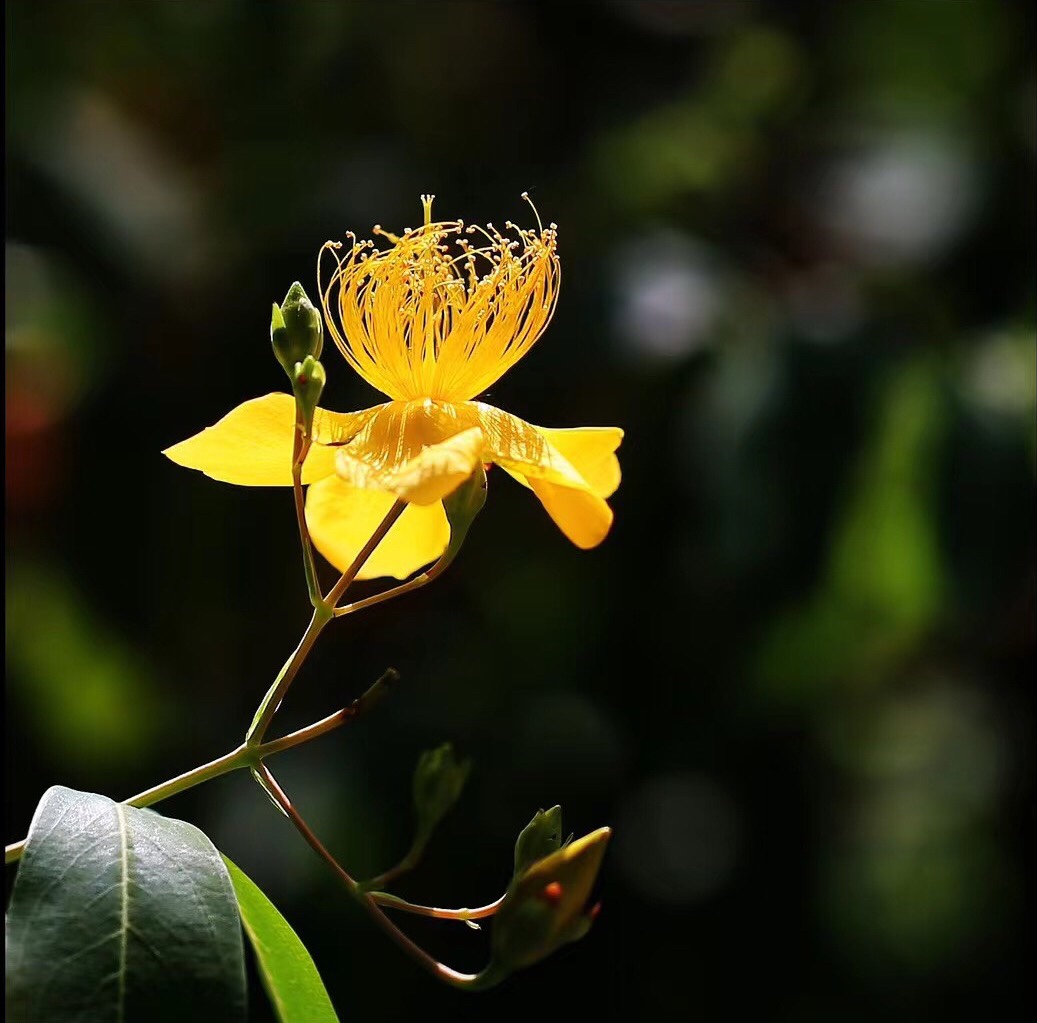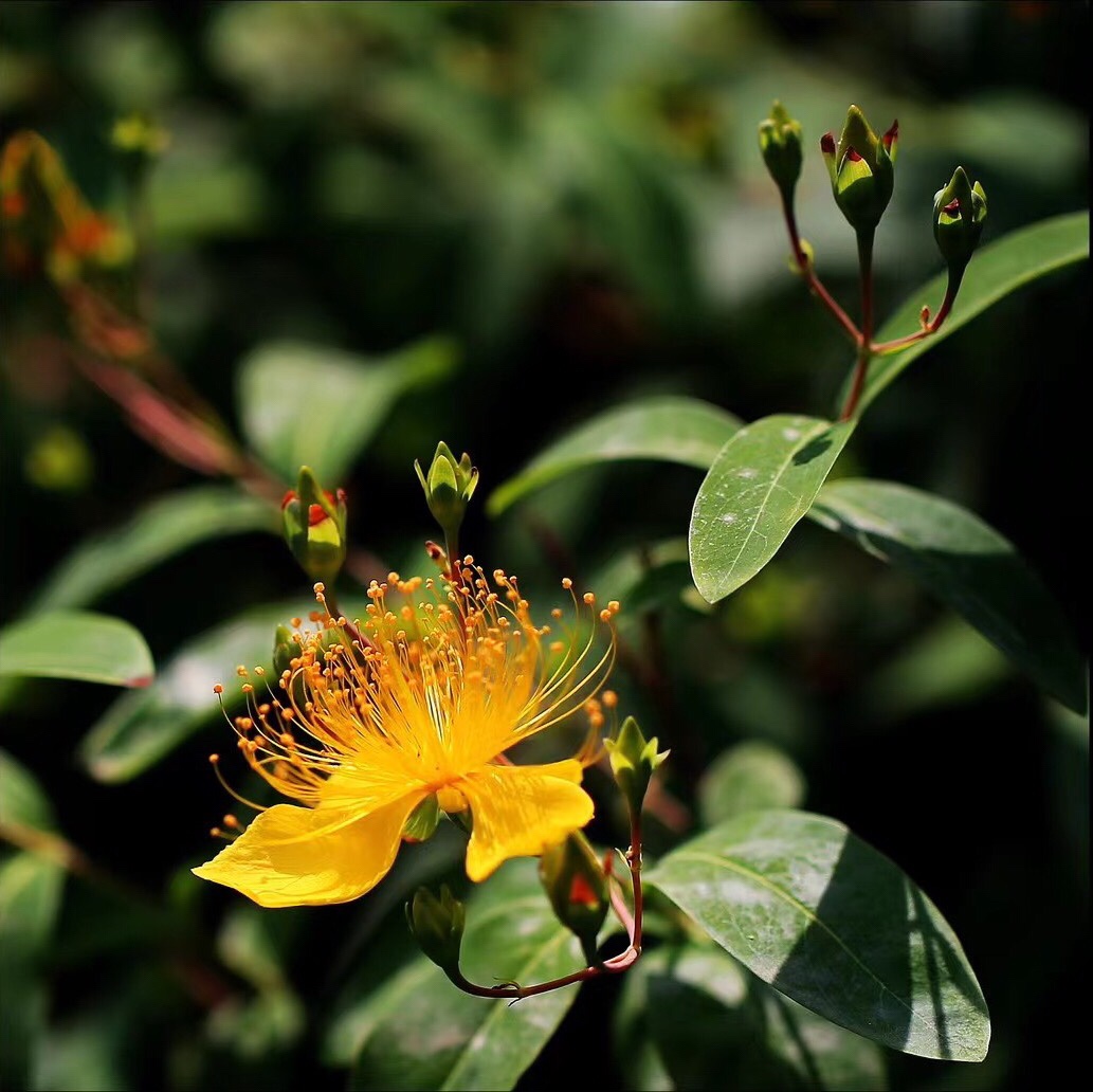 《金丝桃》 灿灿蝴蝶花, 红黄蕊似发。 芳容虽少见, 美誉信无涯。 旋瓣风车转, 开蕾聚伞斜。 若君身不爽, 饮此鸣心茶。