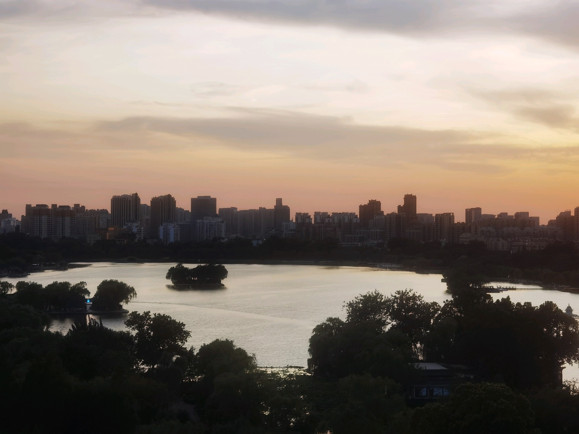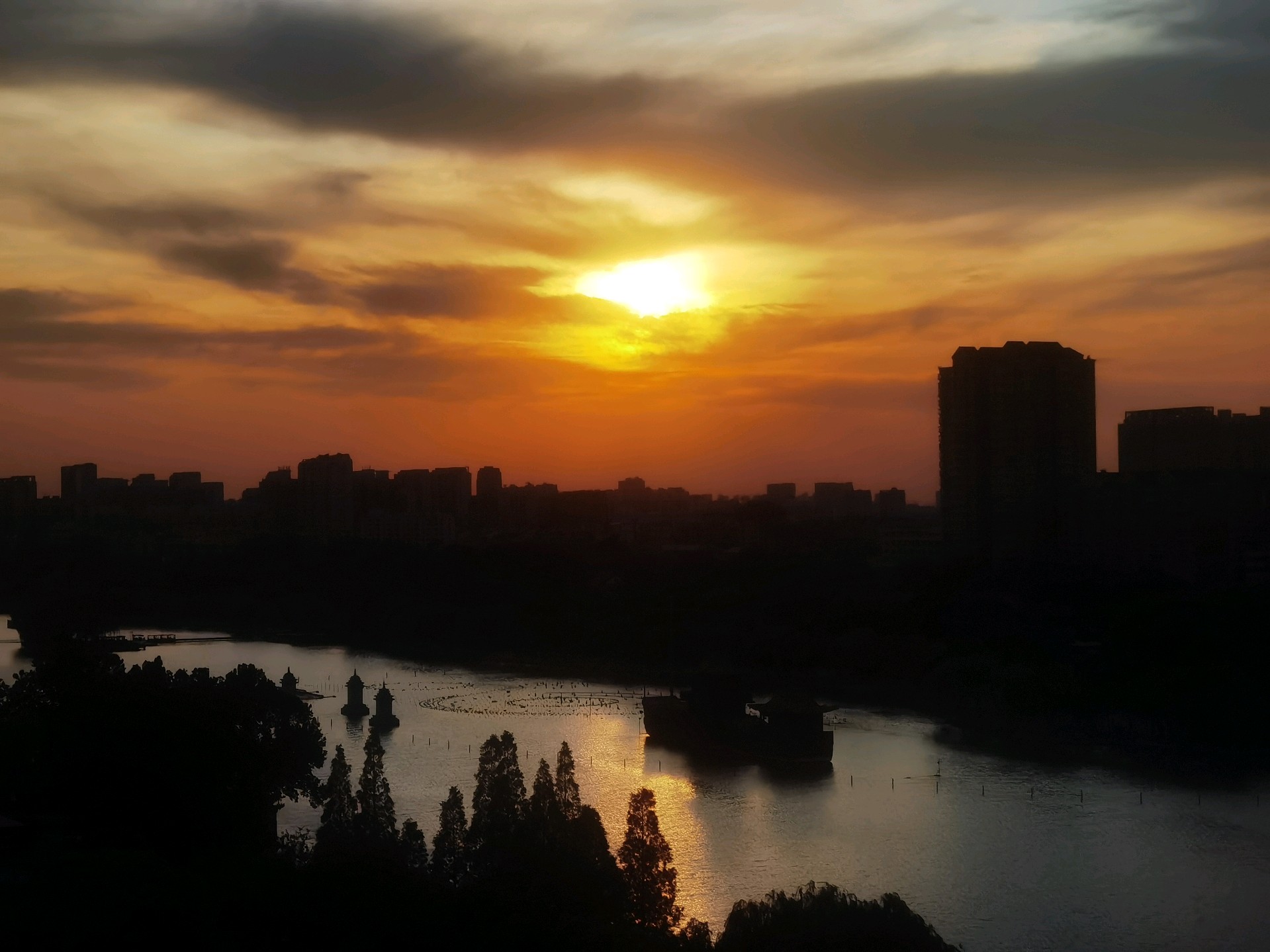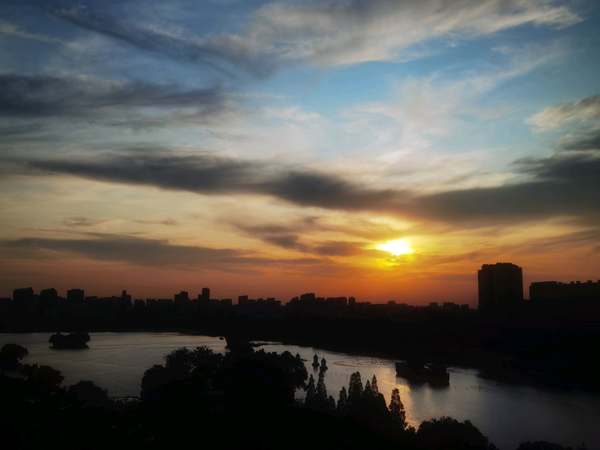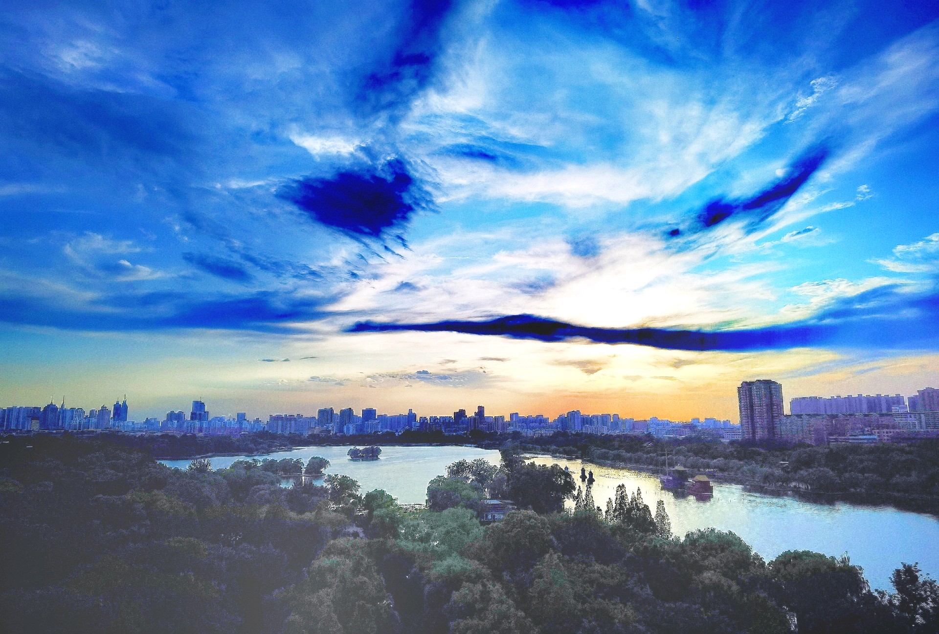 城市轮廓渐显,湖光倒影如梦。大明湖畔晚霞映像,色彩斑斓落日余晖美如画。