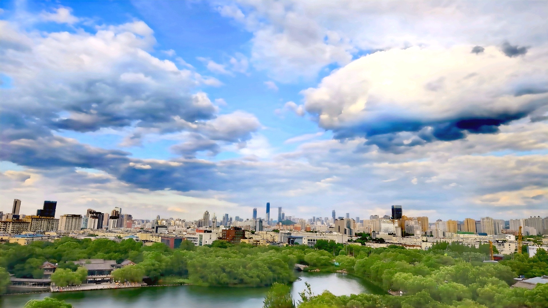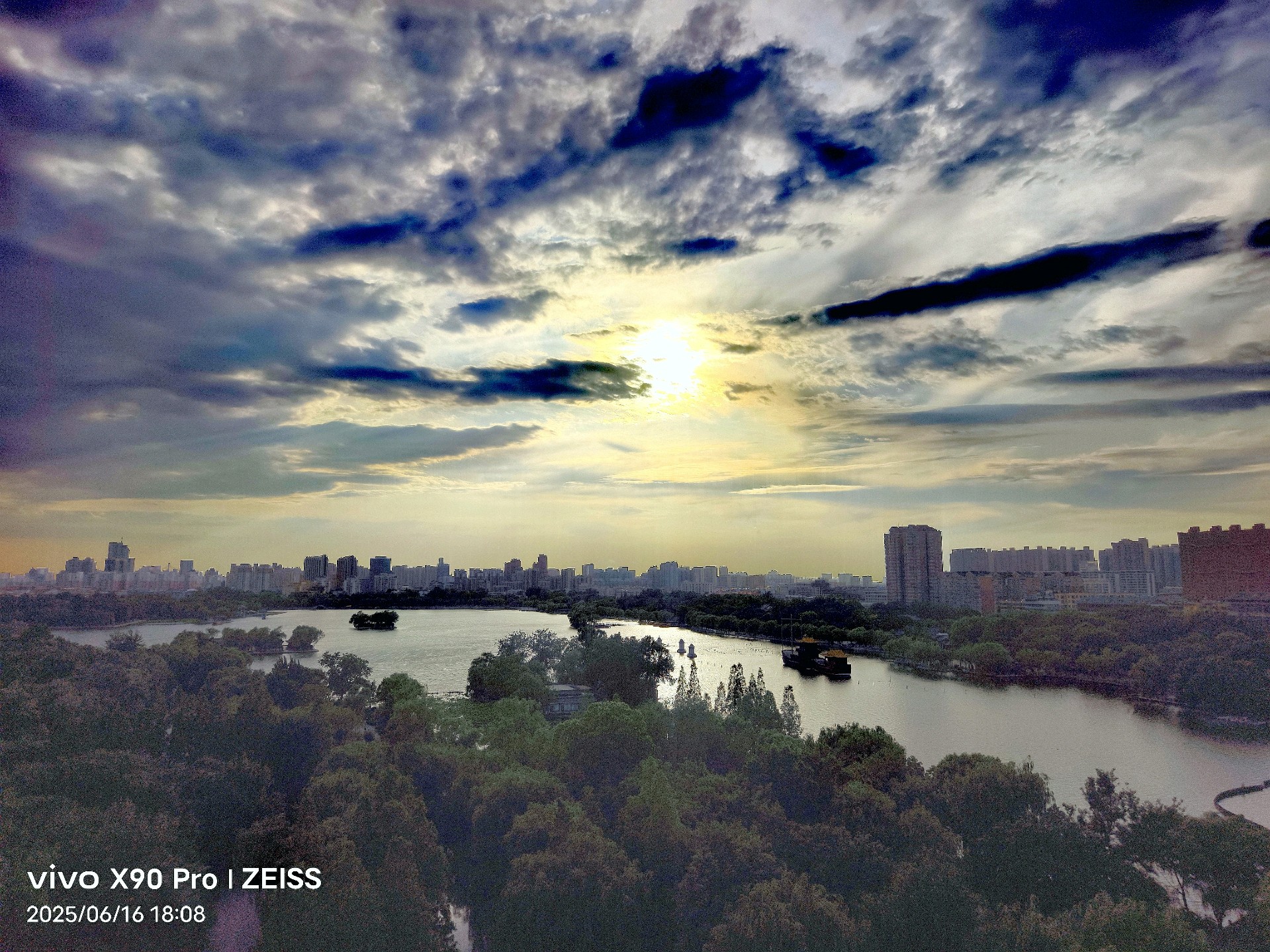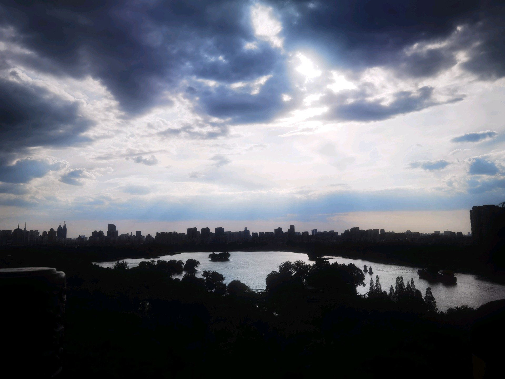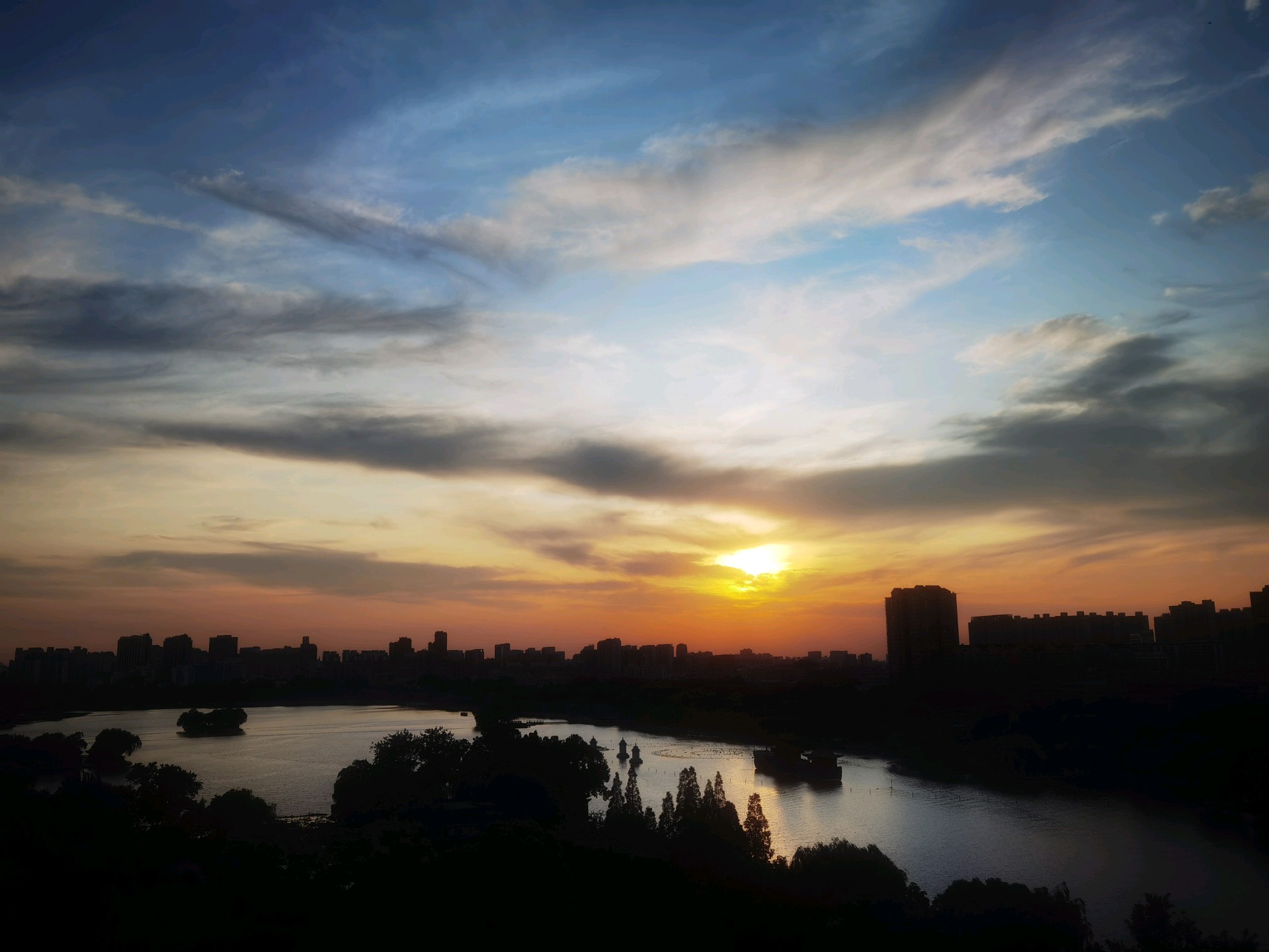 城市轮廓渐显,湖光倒影如梦。大明湖畔晚霞映像,色彩斑斓落日余晖美如画。
