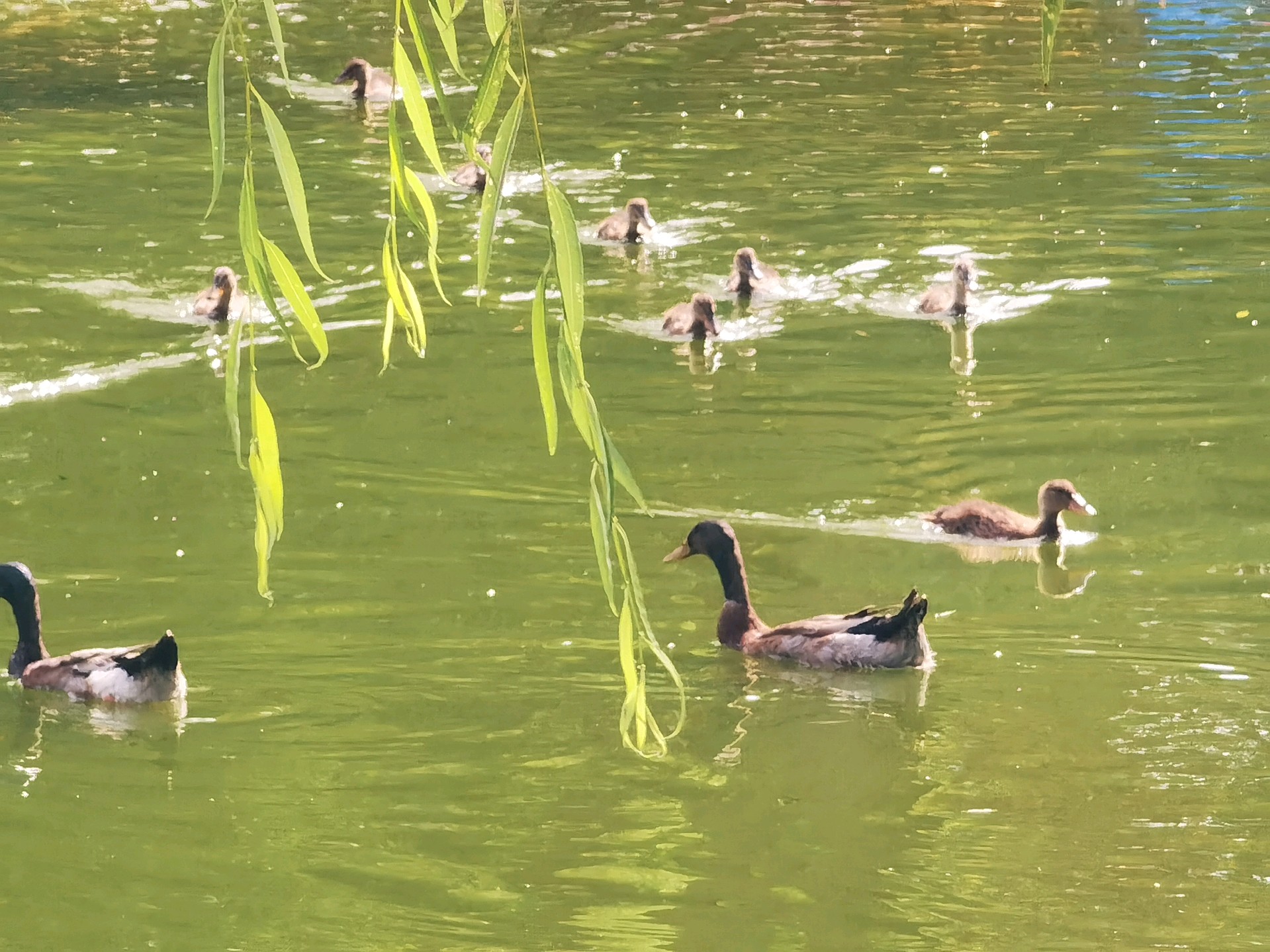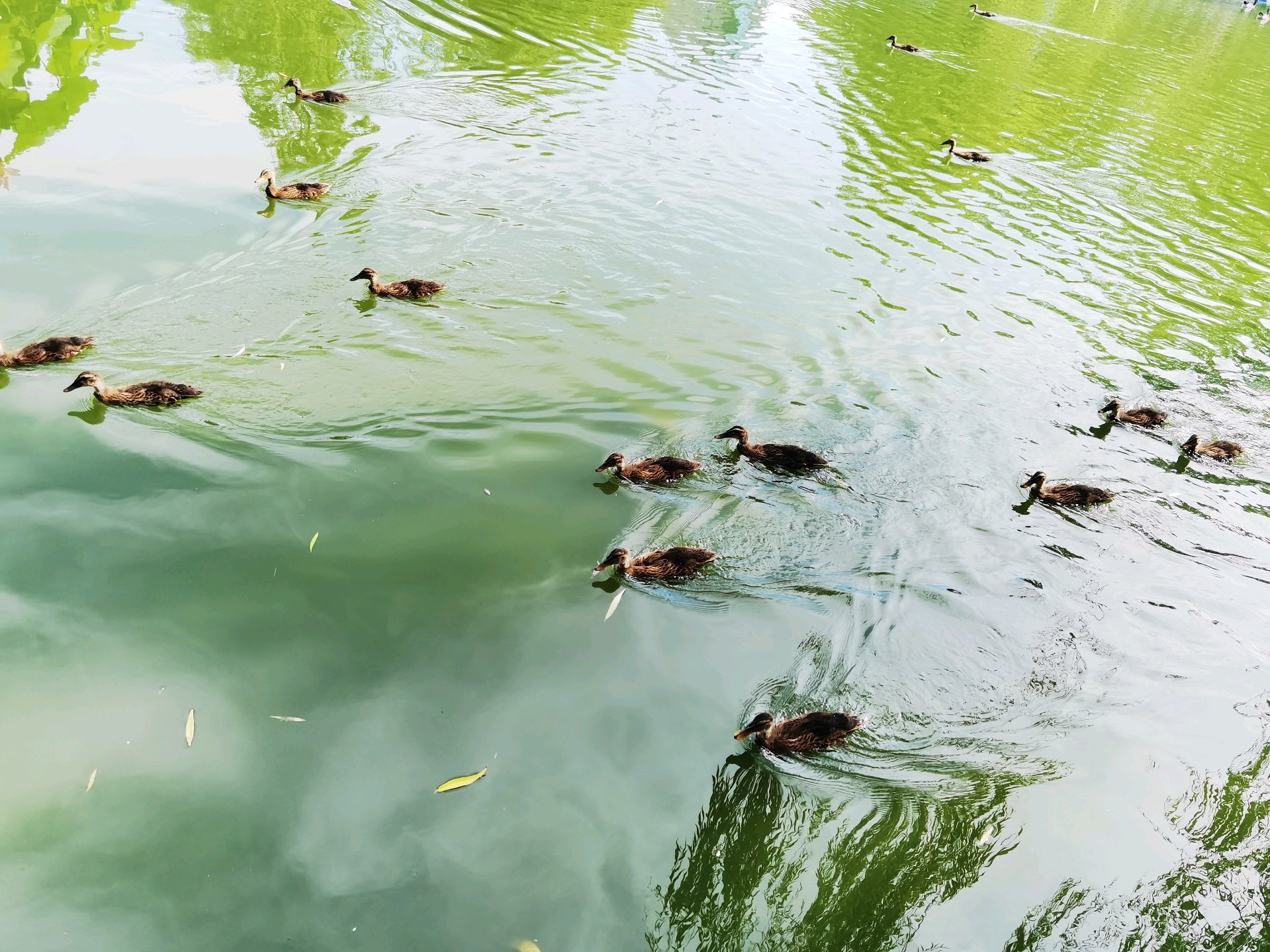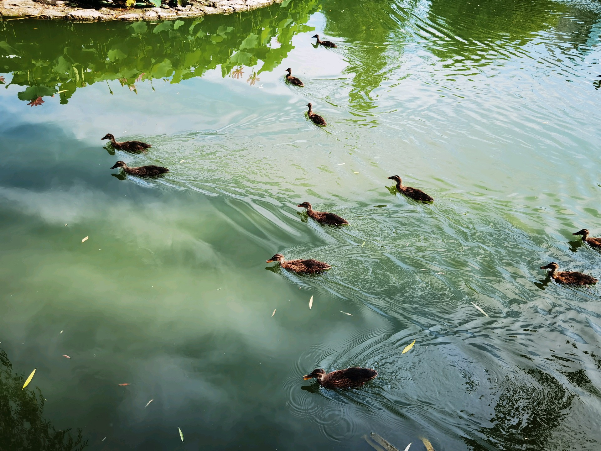 济南泉城公园映日湖不仅有荷花,还有一群鸭子游来游去,这是一只斑嘴鸭妈妈带着它的十七个孩子,几个月时间,小鸭子长大了,游在一块,都和鸭妈妈一样大了。这群鸭子活跃了整个湖,给人们带了许多欢乐。