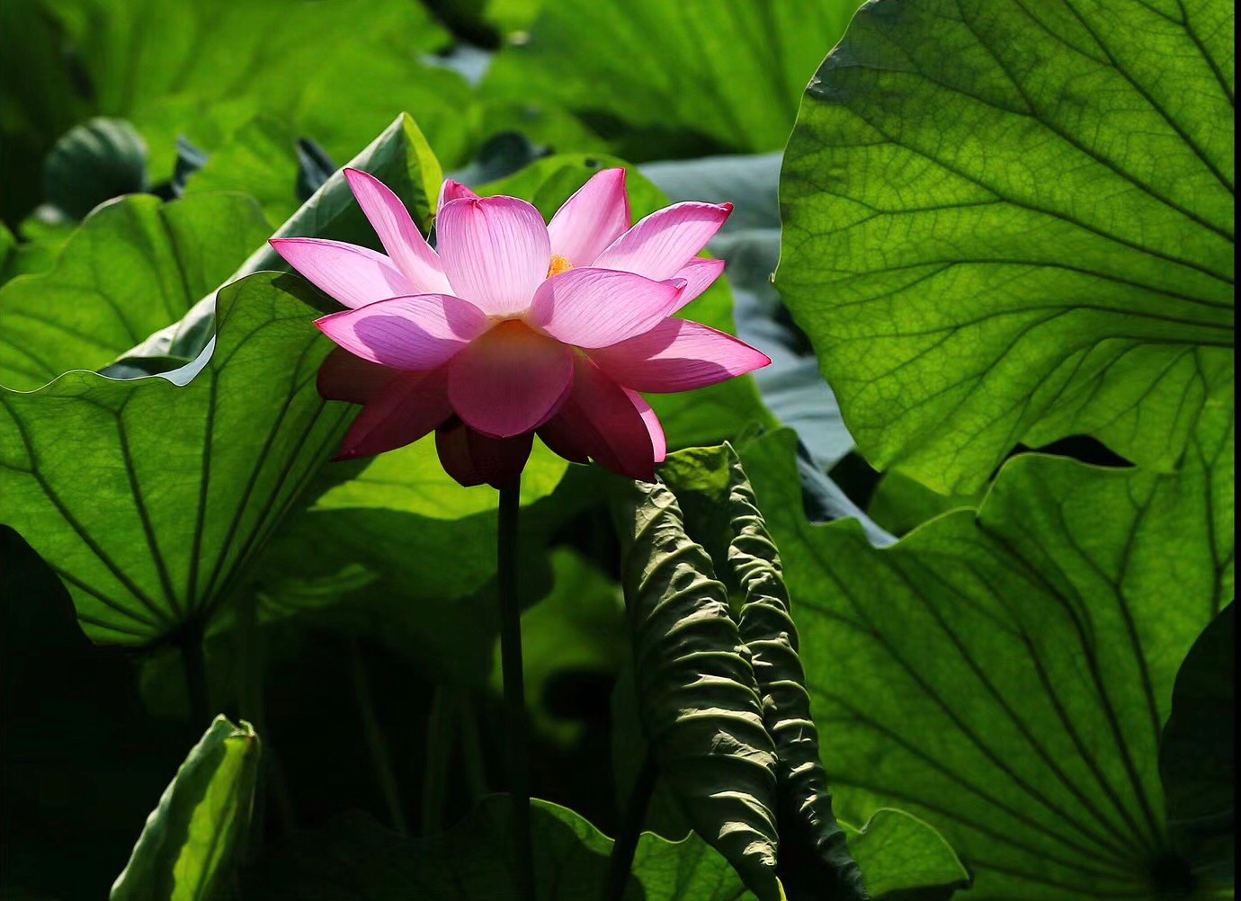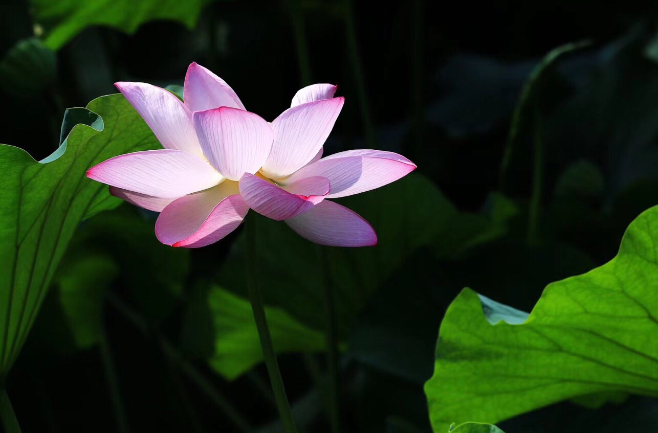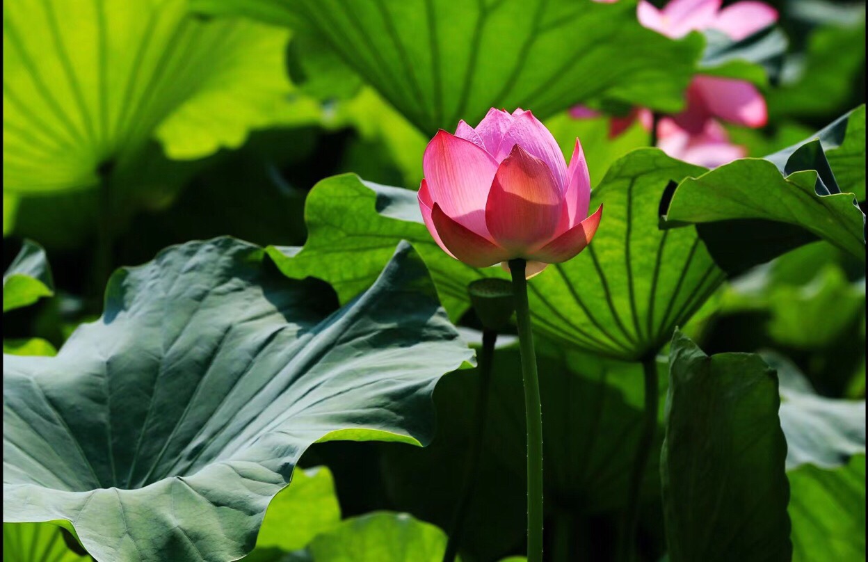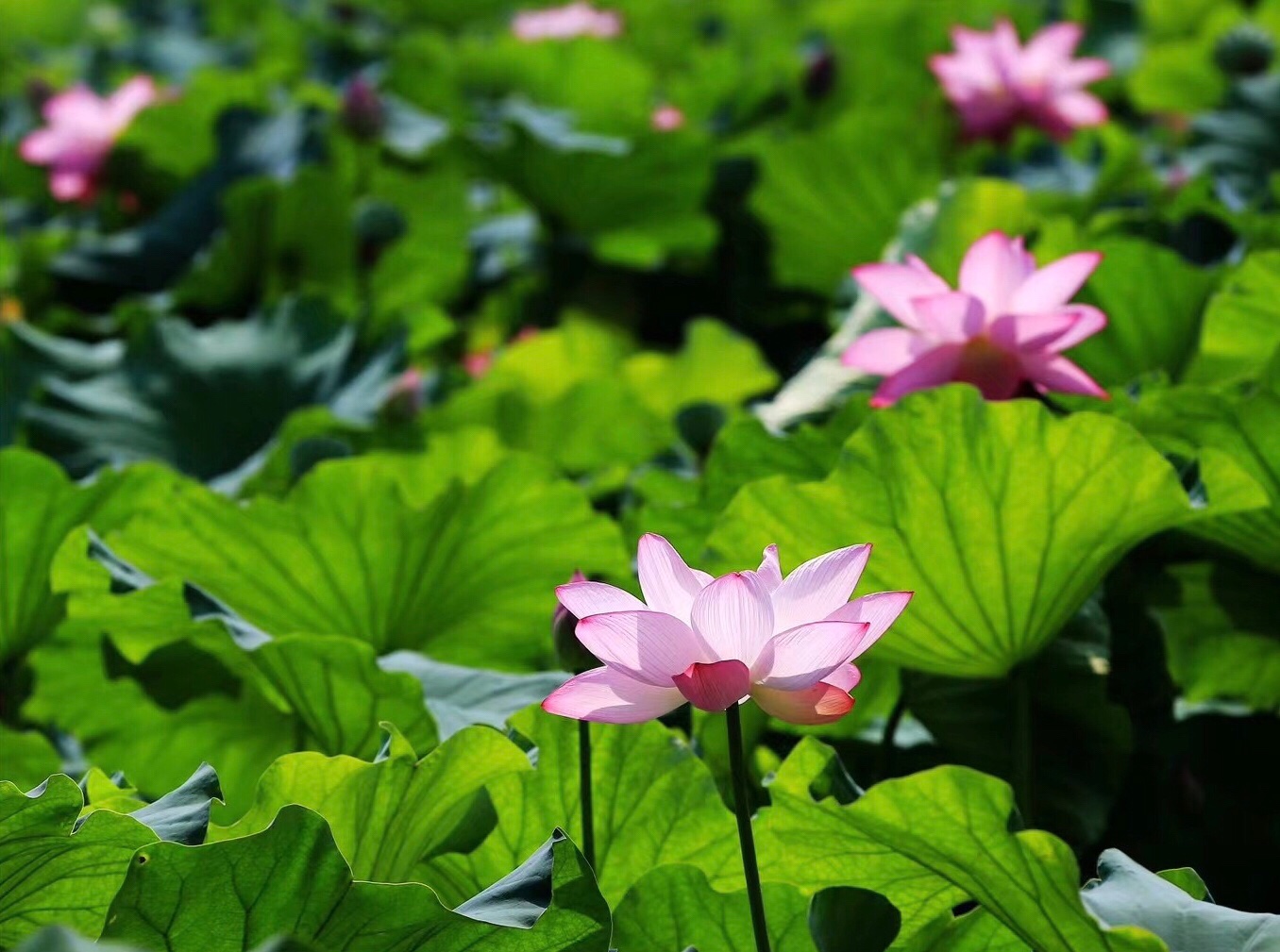 荷花盛开的季节到了,一片片翠绿的荷叶迎风招展,如同绿色的海洋。荷花瓣在阳光的照耀下,如同涂抹了一层淡淡的红晕,美丽动人。