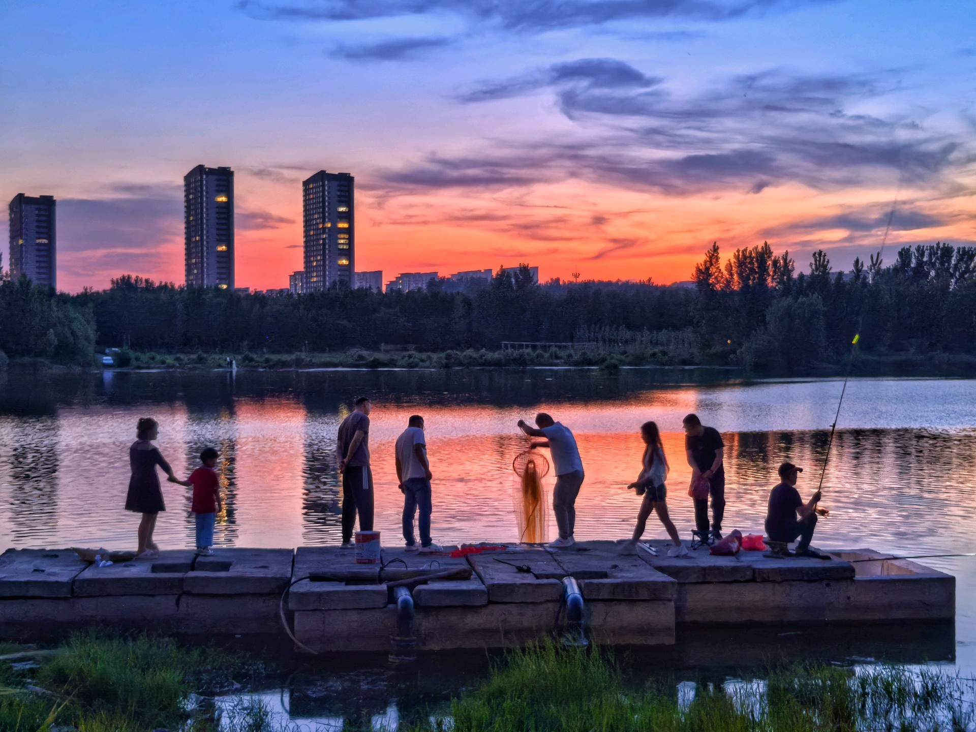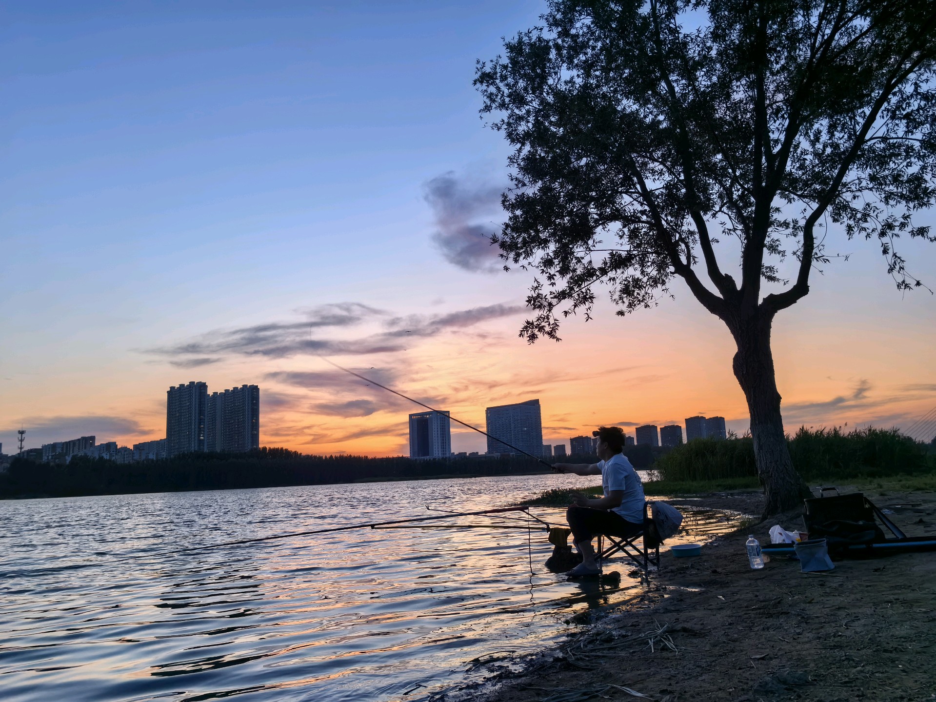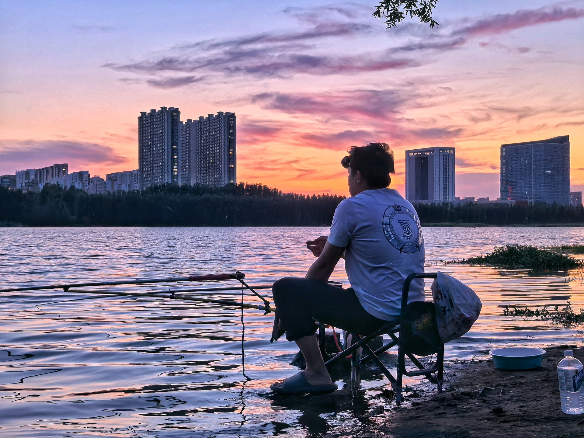 晚霞下钓鱼爱好者坐在河边钓鱼,享受着宁静的傍晚。沿河建筑的倒影映在河面上,天空被晚霞染成了橙红色,一切都那么美丽。