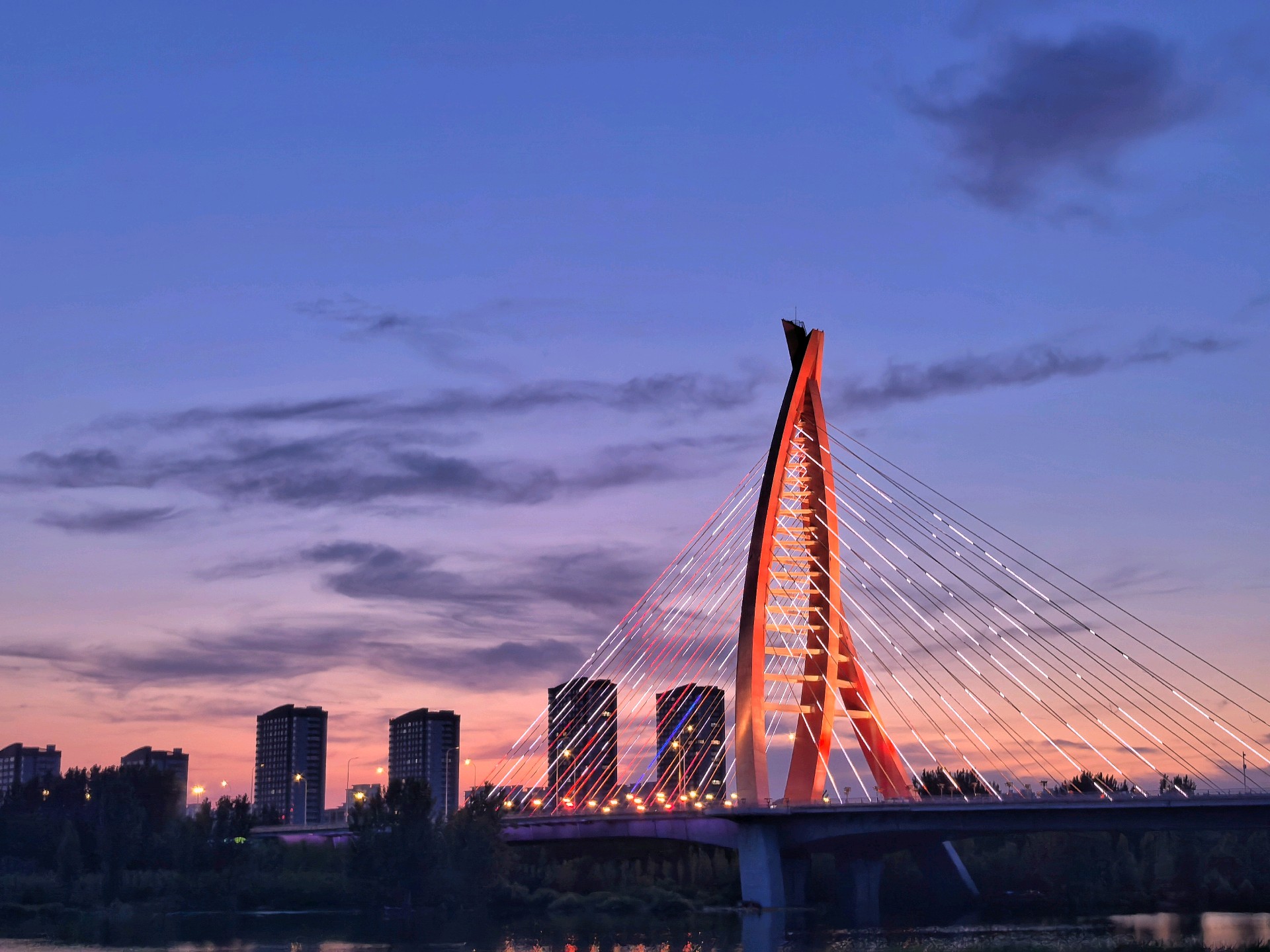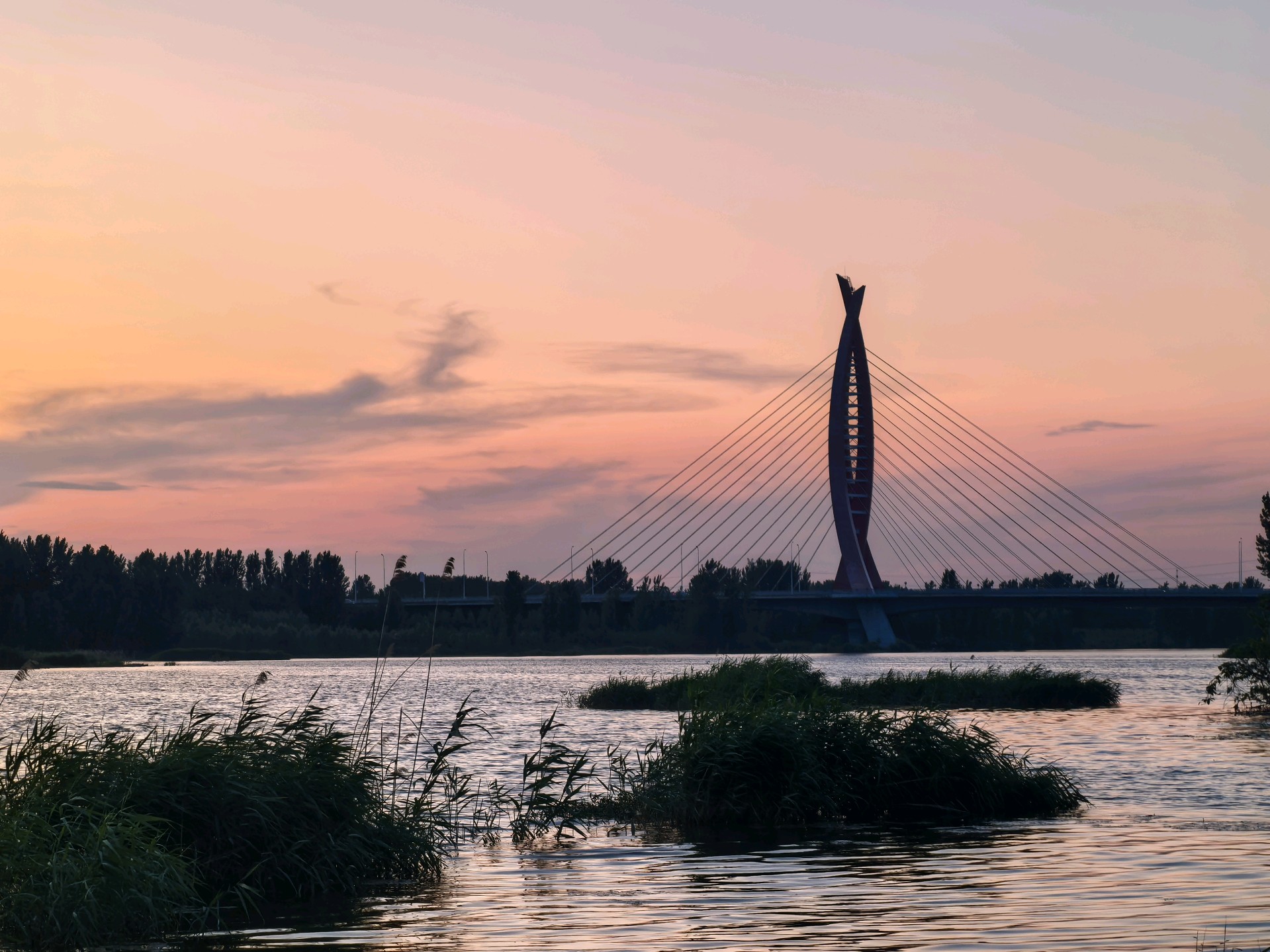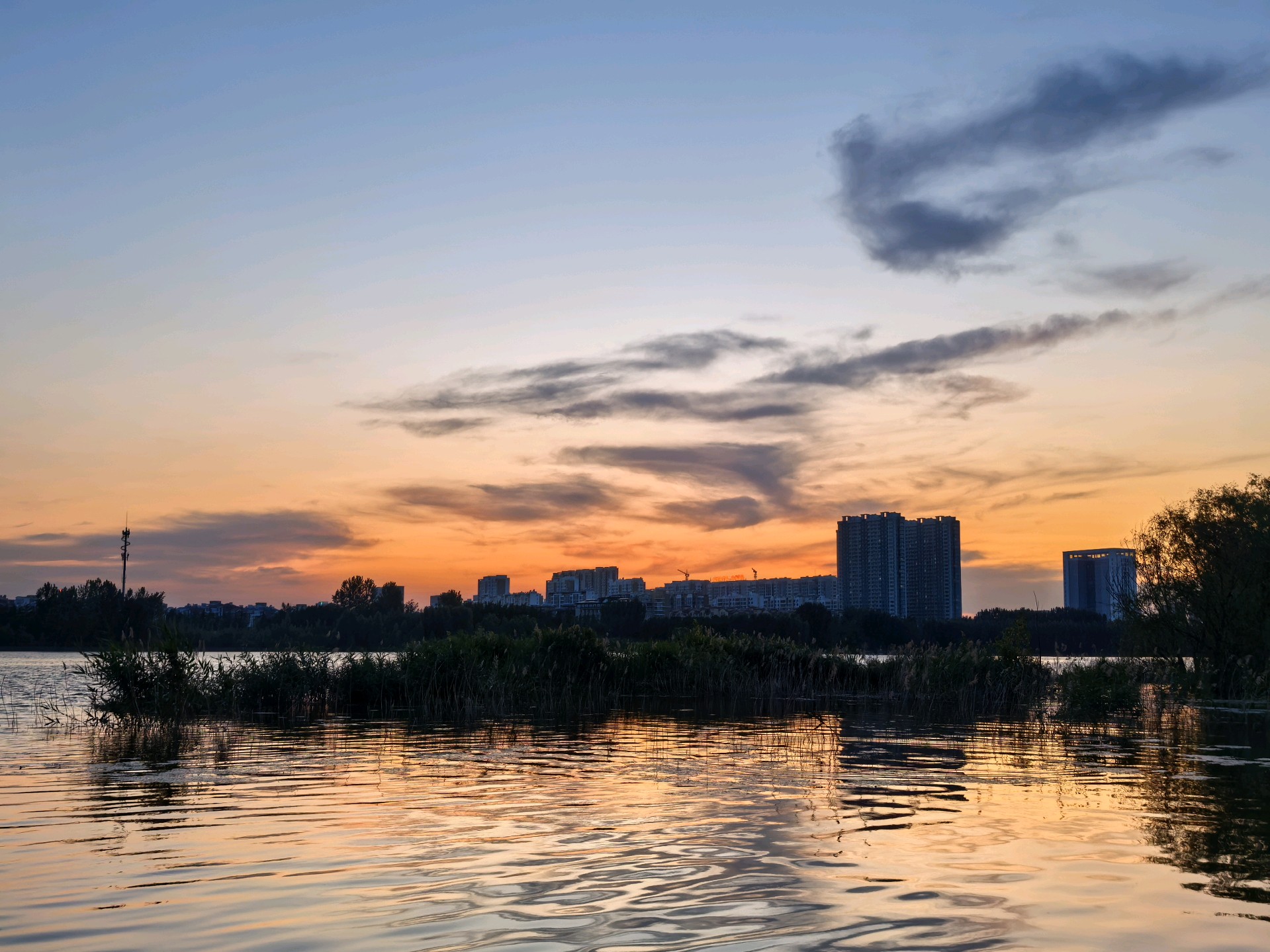 晚霞下钓鱼爱好者坐在河边钓鱼,享受着宁静的傍晚。沿河建筑的倒影映在河面上,天空被晚霞染成了橙红色,一切都那么美丽。