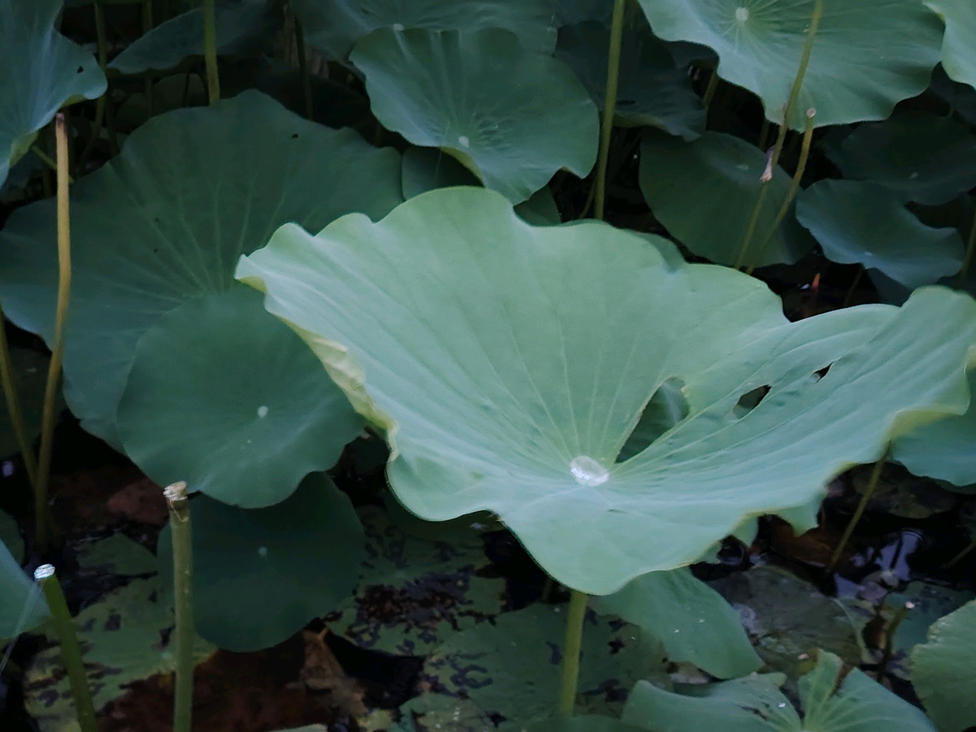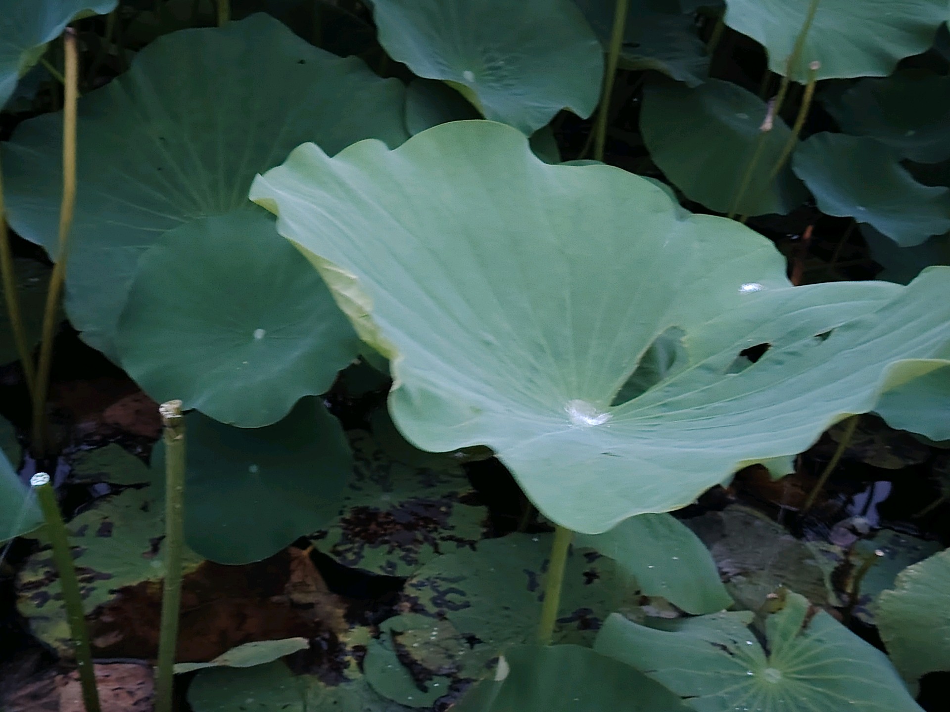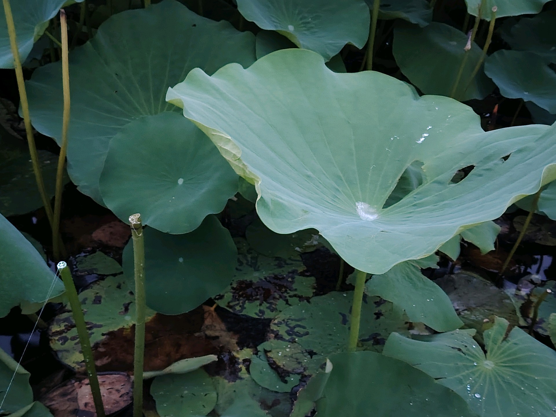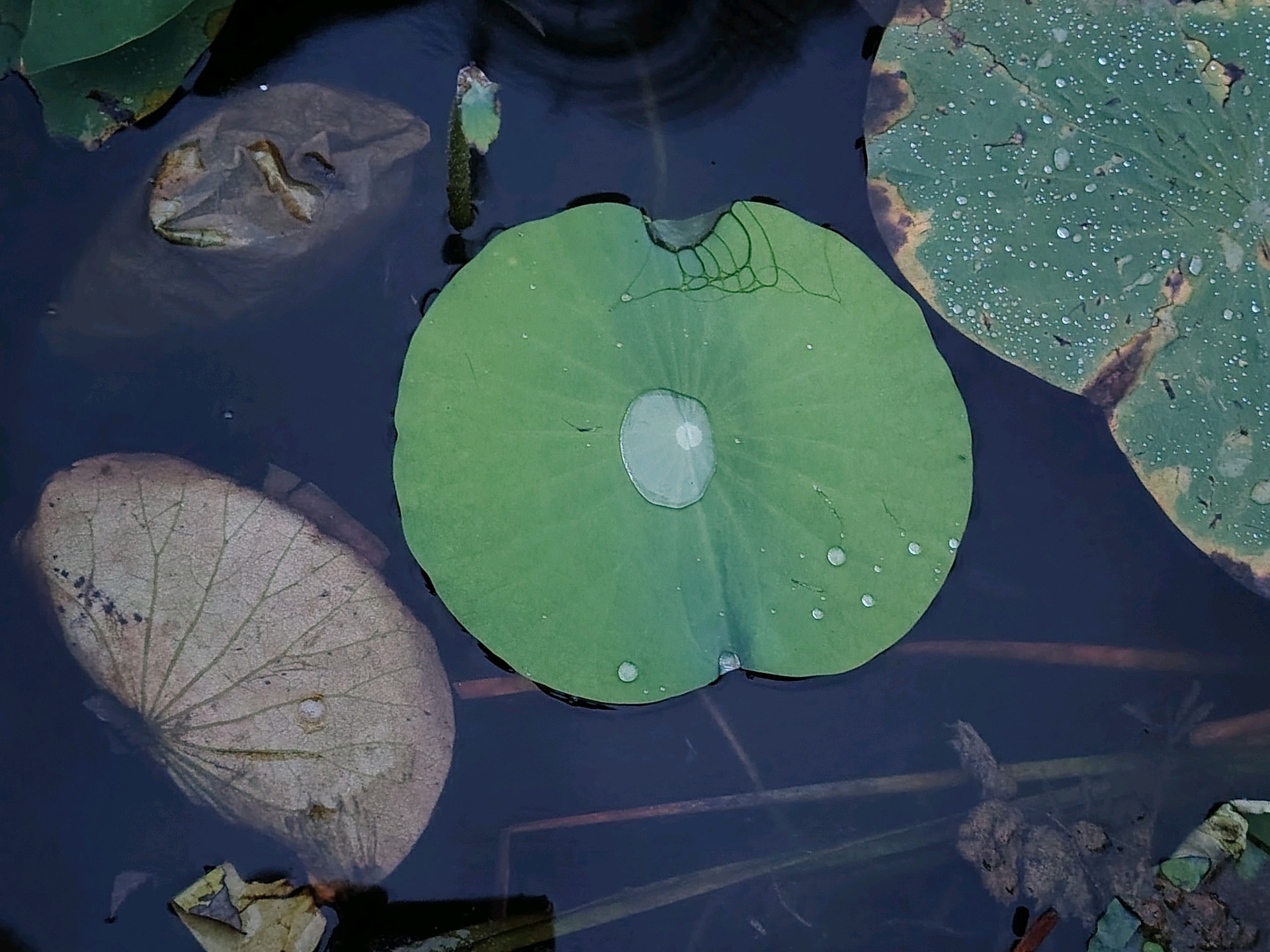 清晨,荷叶宛如翠玉盘,水珠似灵动珍珠,在叶间滚动、停留,折射微光。新旧荷叶相衬,枯荣间藏着自然韵律,每一滴水珠,都是池塘写给世界的晶莹情书 。
