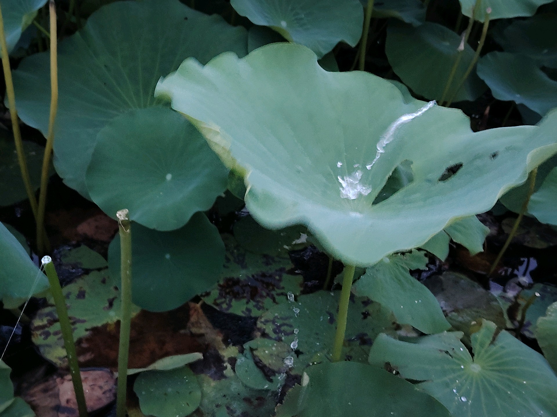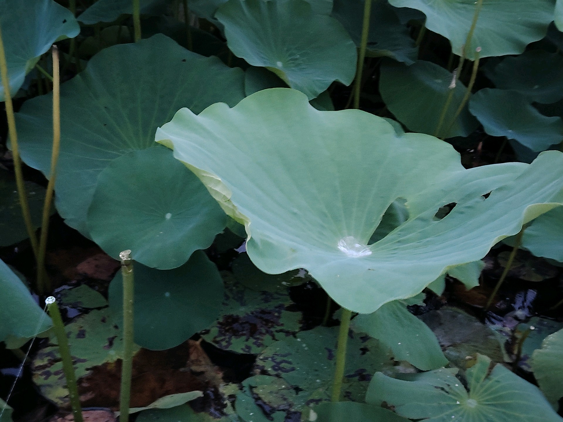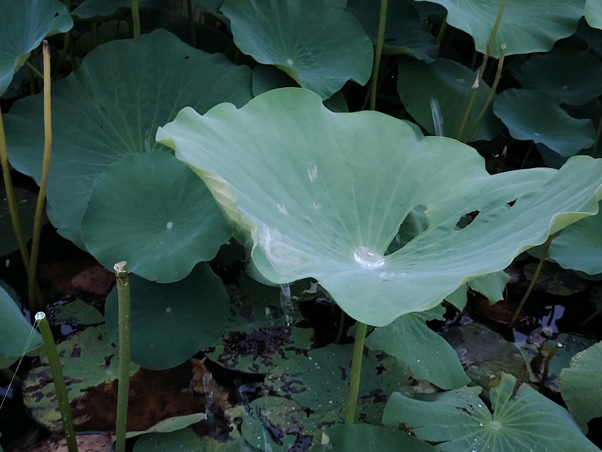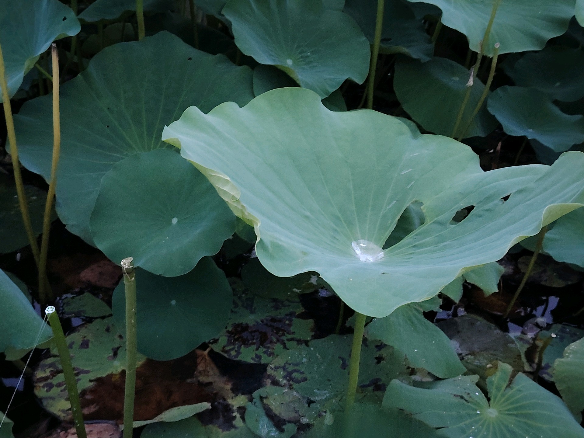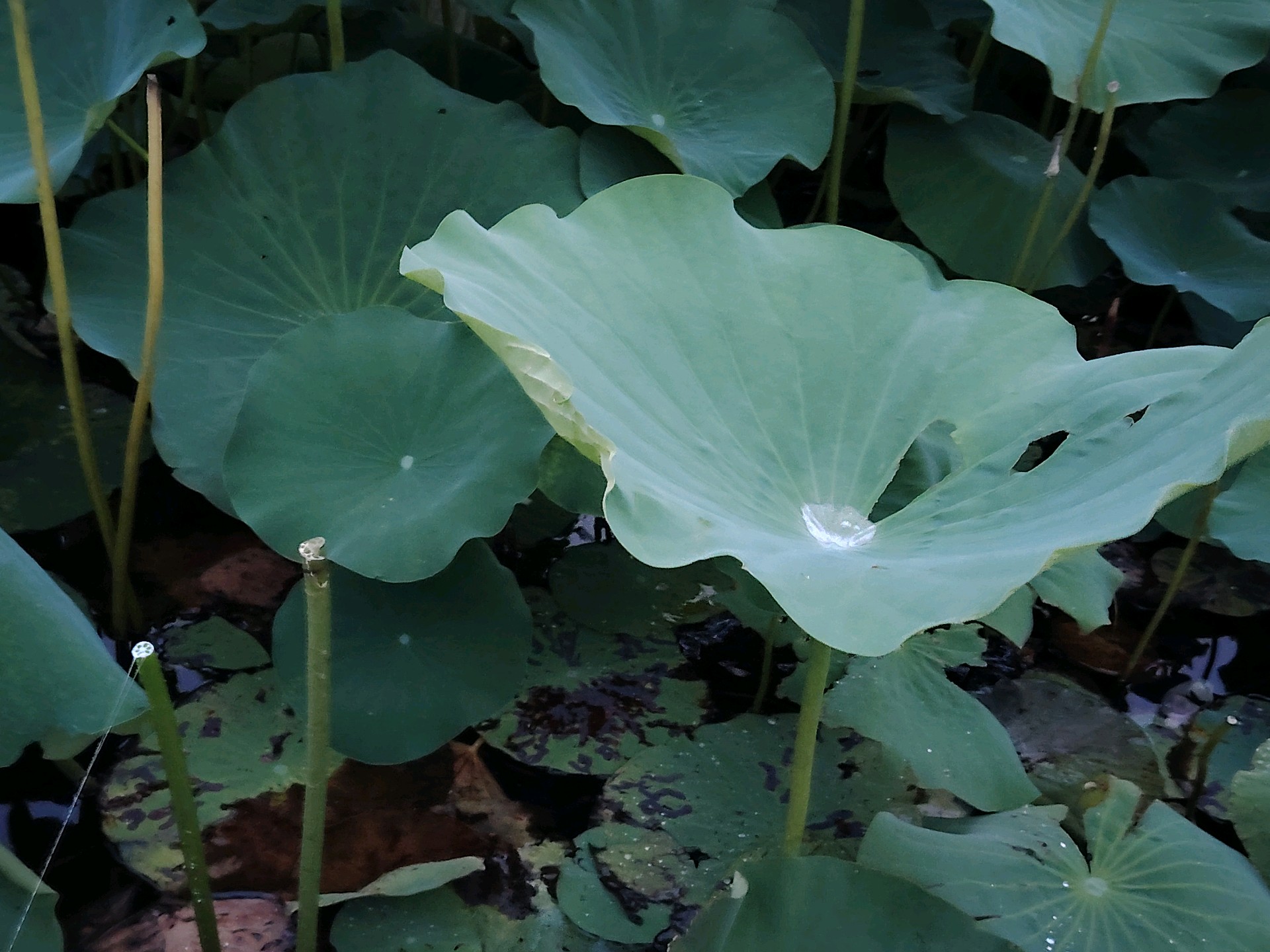 清晨,荷叶宛如翠玉盘,水珠似灵动珍珠,在叶间滚动、停留,折射微光。新旧荷叶相衬,枯荣间藏着自然韵律,每一滴水珠,都是池塘写给世界的晶莹情书 。