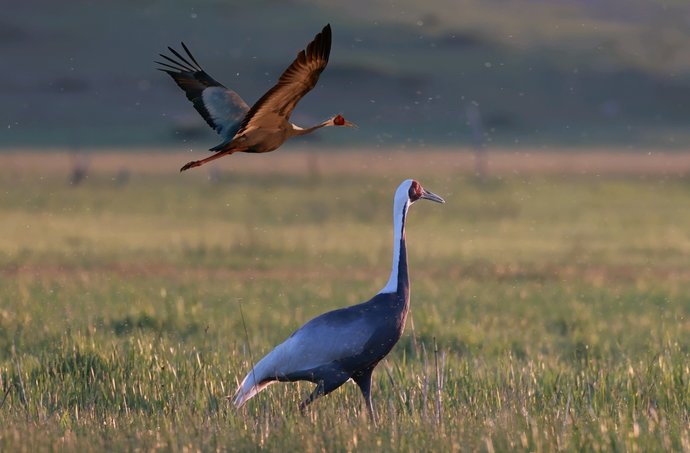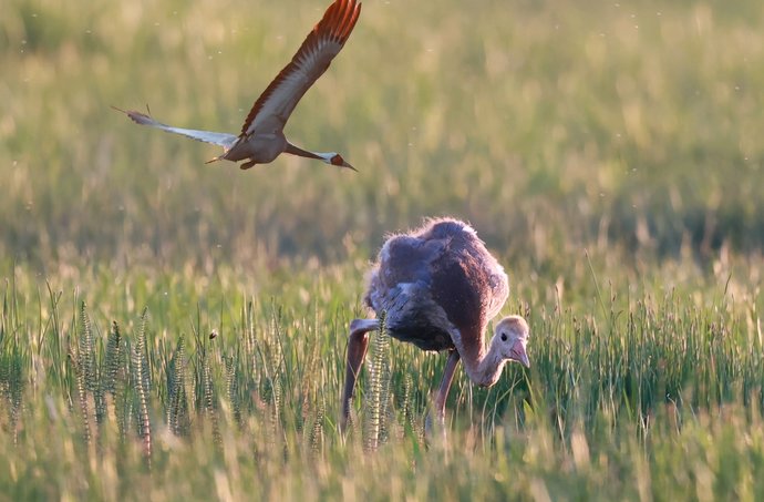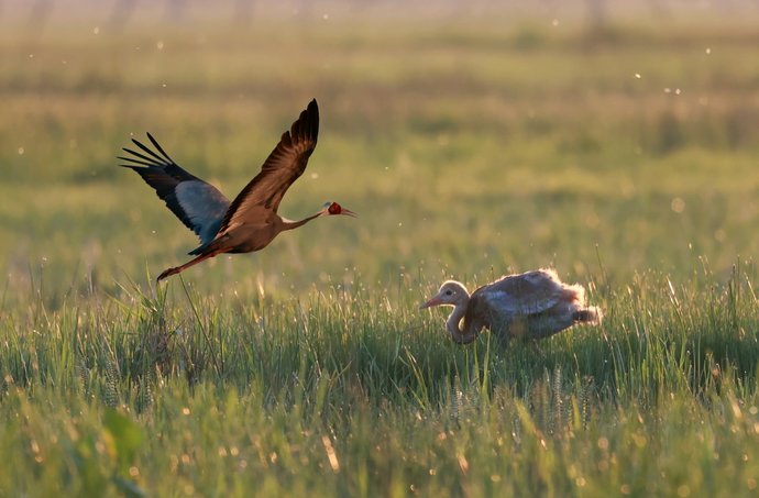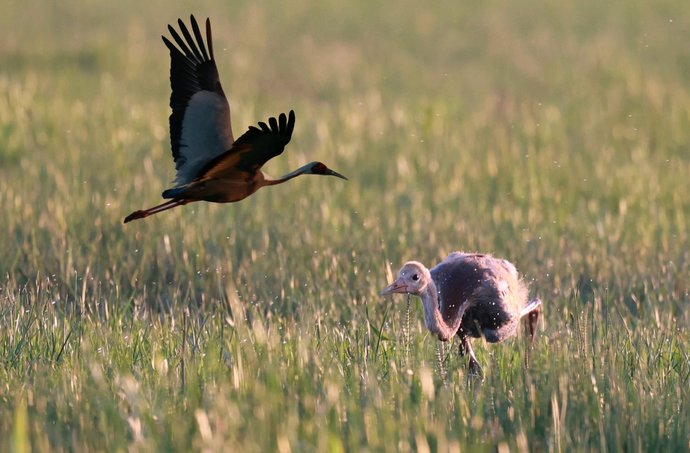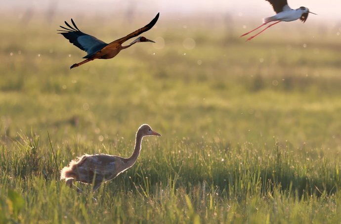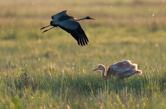 它们优雅的身姿与紧密的家庭纽带,在广袤绿野中勾勒出生命最动人的画卷。 白枕鹤严格遵循“一夫一妻制”,亲鸟共同承担育雏责任。在内蒙古草原,新生雏鸟如“嫩黄绒球”紧随父母,父母轮番警戒、觅食,寸步不离守护幼雏学步,将爱意融进每一寸草地。幼鹤身披绒黄绒毛,摇摇晃晃跟随父母穿梭草甸。父母展翅低飞示范动作,幼鹤蹦跳模仿,休憩时依偎梳理羽毛,画面如生态油画。约3个月后幼鹤才能飞行,期间全靠父母投喂小鱼、草根与昆虫。白枕鹤偏爱开阔的芦苇沼泽与水草丰茂的河滩。