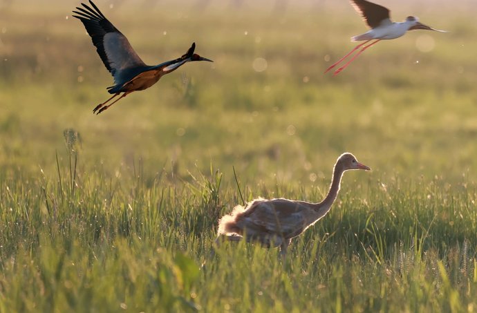 夕阳为草原镀上金边,白枕鹤一家的剪影掠过如镜湿地——从雏鸟绒球般的蹒跚到成鸟舒展的飞羽,每一帧都是荒漠重生为绿洲的见证。这份快乐时光背后,是千万人接力守护的生态奇迹,让“鸟类仙子”的传说,永远在风中流传。