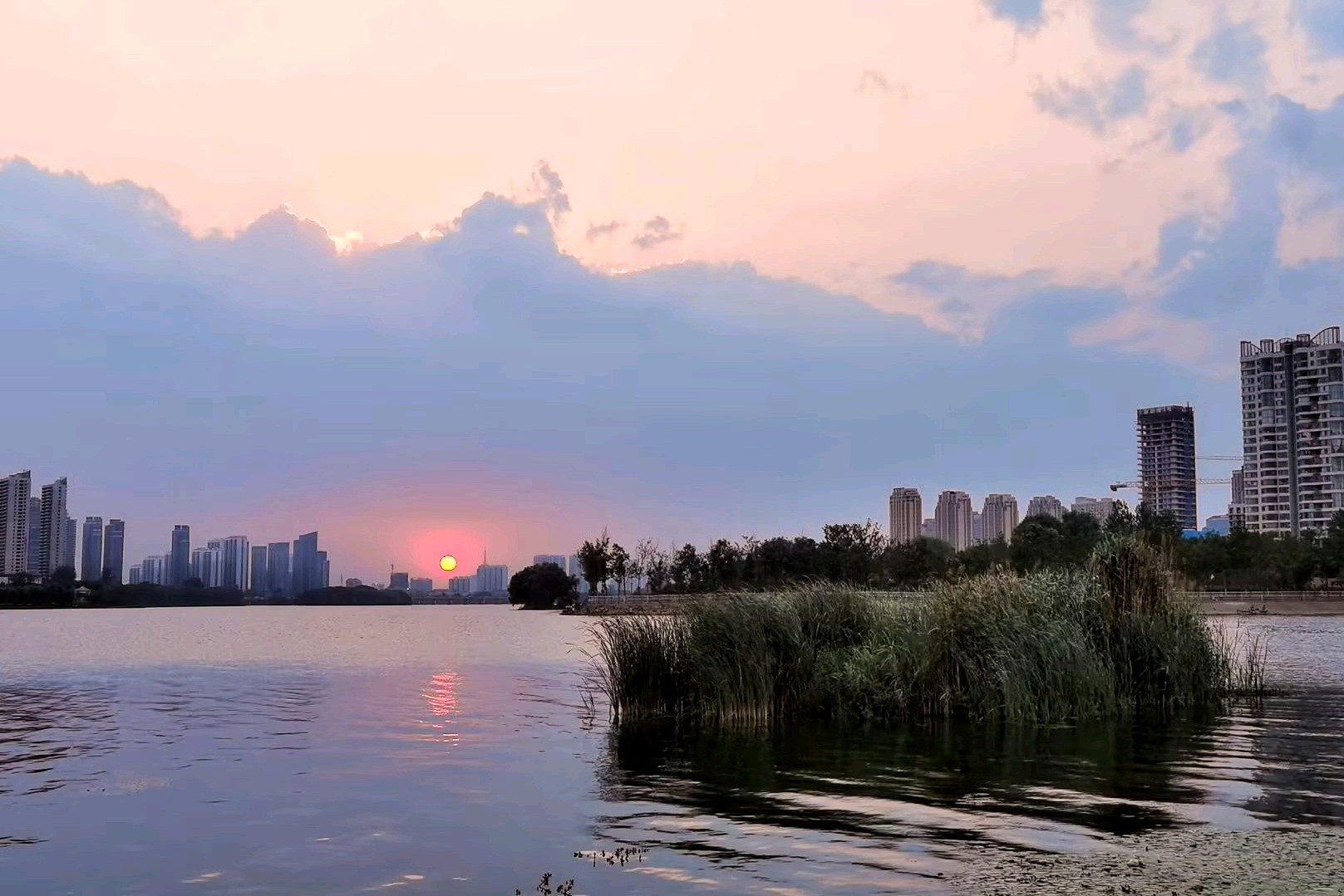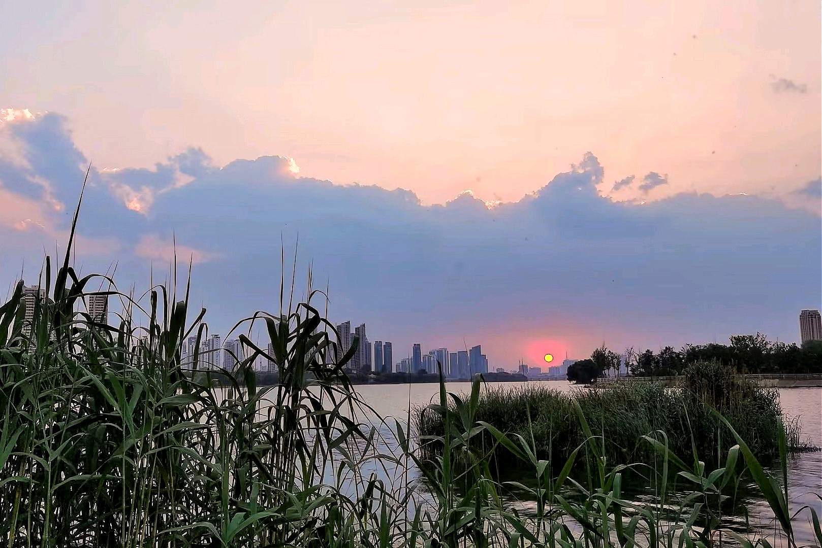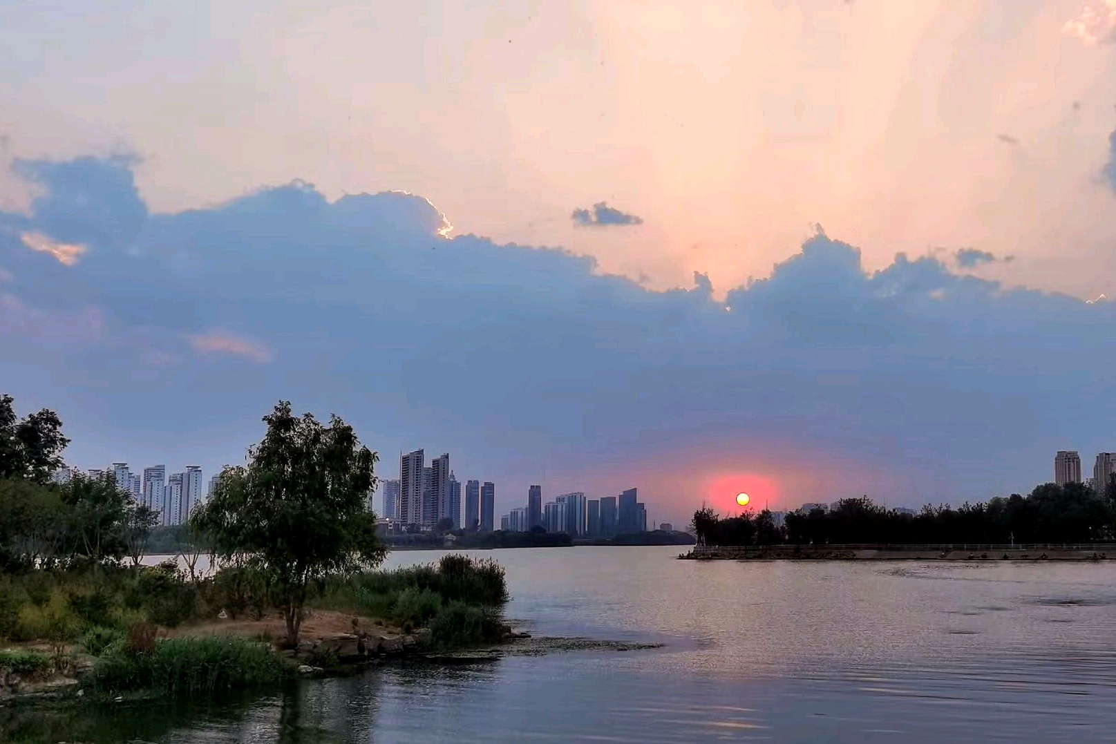 落日余晖下的沂河,云霞满天,绿意盎然,成为众多年轻人婚纱照打卡之地。漫步河边,感受大自然的魅力与现代文明的融合。