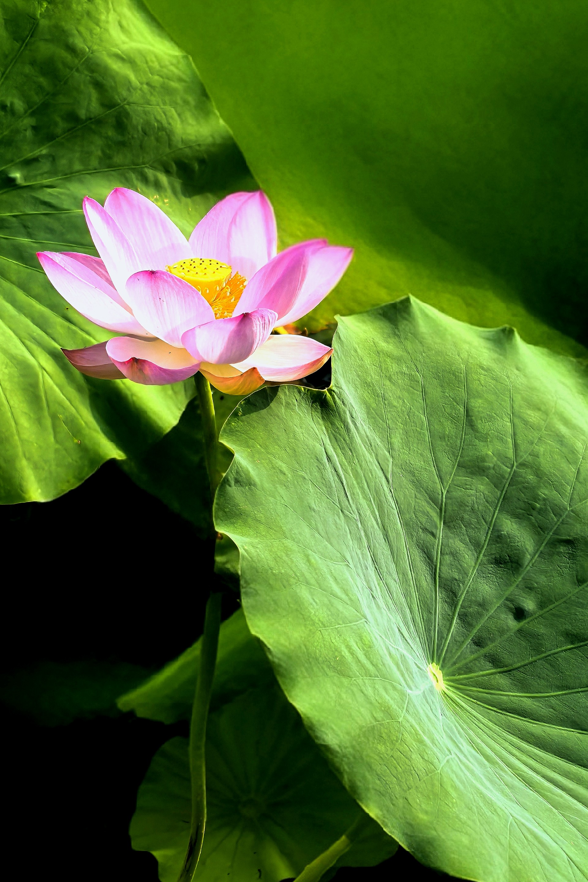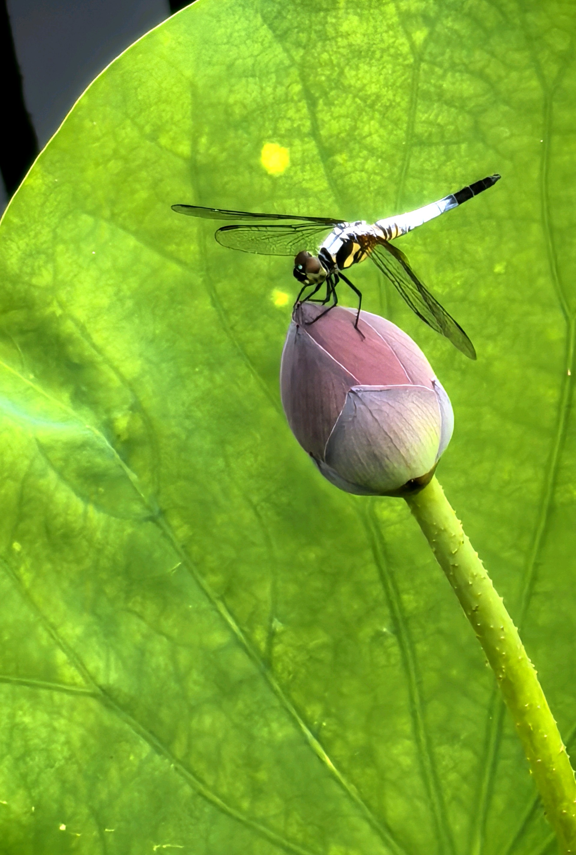 清晨,雕塑公园荷池中荷花盛开,蜻蜓停留在含苞待放的花朵上,绿意盎然的荷叶作为背景,构成了一幅生机勃勃的画面,让人心旷神怡。