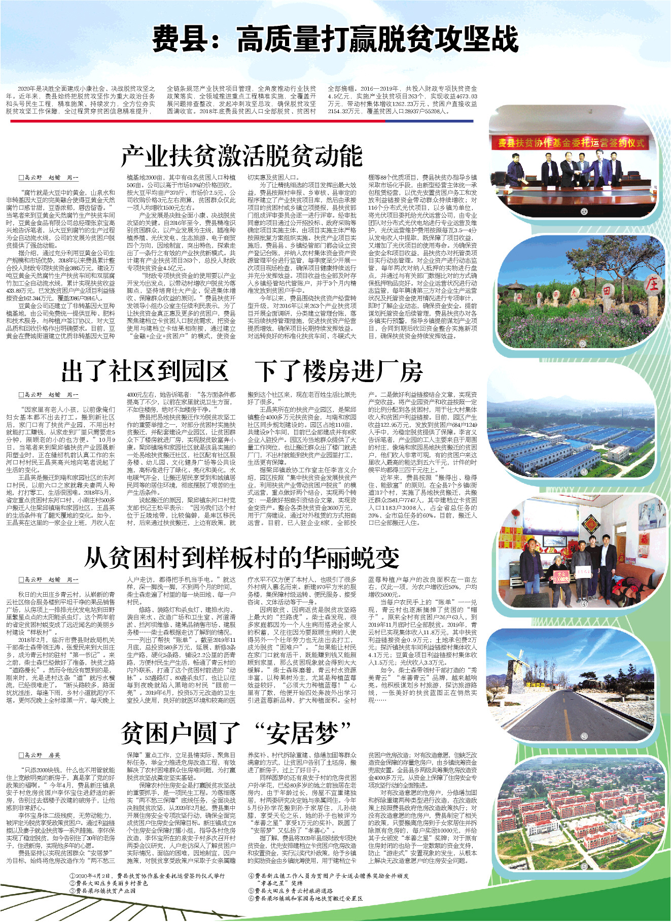 2020年是决胜全面建成小康社会、决战脱贫攻坚之年。近年来,费县始终把脱贫攻坚作为重大政治任务和头号民生工程,精准施策、持续发力,全方位夯实脱贫攻坚工作保障,全过程贯穿贫困信息精准提升,全链条规范产业扶贫项目管理,全角度推动行业扶贫政策落实,全领域推进重点工程精准实施,全覆盖开展问题排查整改,发起冲刺攻坚总攻,确保脱贫攻坚圆满收官。2018年底费县贫困人口全部脱贫、贫困村全部摘帽。2016—2019年,共投入财政专项扶贫资金4.5亿元,实施产业扶贫项目263个,实现收益4673.03万元,带动村集体增收1262.23万元、贫困户直接收益2154.32万元,覆盖贫困人口28937户55208人。