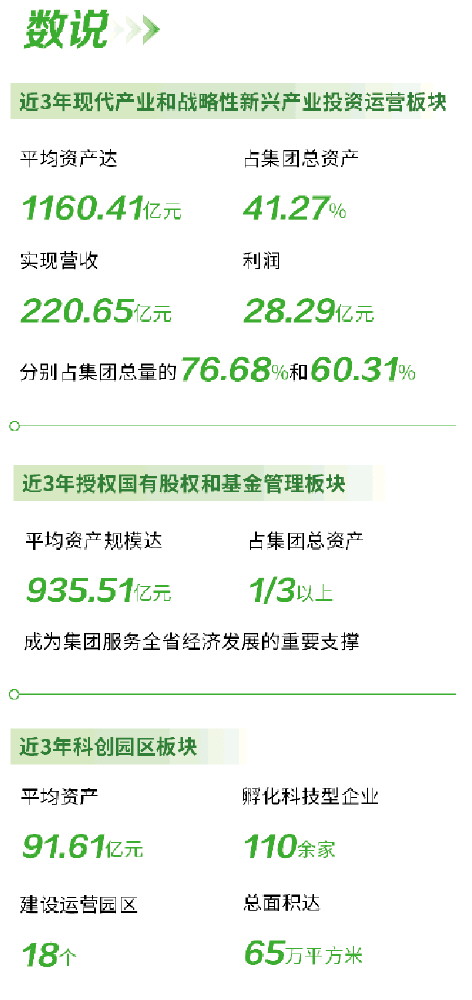 “十四五”期间,集团在授权国有股权管理和政策性基金管理领域深耕细作,以资本为纽带,织就一张覆盖重点产业、服务全局战略的支撑网络。近3年来,该板块平均资产规模达935.51亿元,占集团总资产的三分之一以上,成为集团服务全省经济发展的重要支撑。