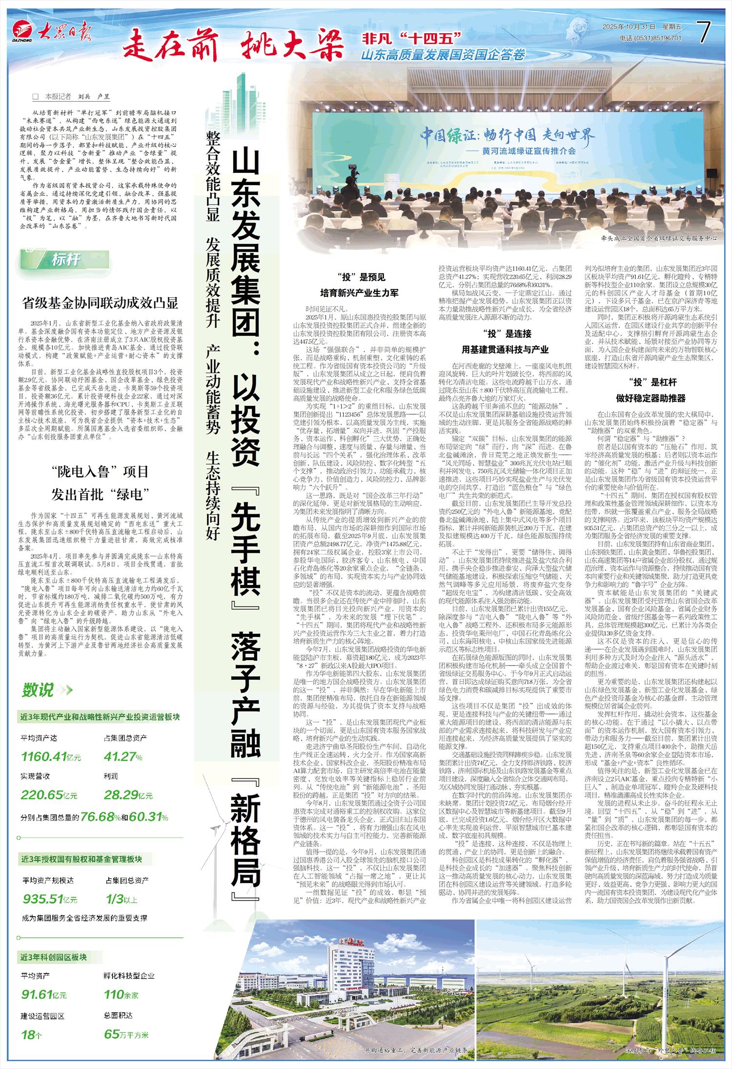 从培育新材料“单打冠军”到前瞻布局脑机接口“未来赛道”,从构建“西电东送”绿色能源大通道到撬动社会资本共筑产业新生态,山东发展投资控股集团有限公司(以下简称“山东发展集团”)在“十四五”期间的每一步落子,都紧扣科技赋能、产业升级的核心逻辑,聚力以科技“含新量”推动产业“含绿量”提升、发展“含金量”增长,整体呈现“整合效能凸显、发展质效提升、产业动能蓄势、生态持续向好”的新气象。